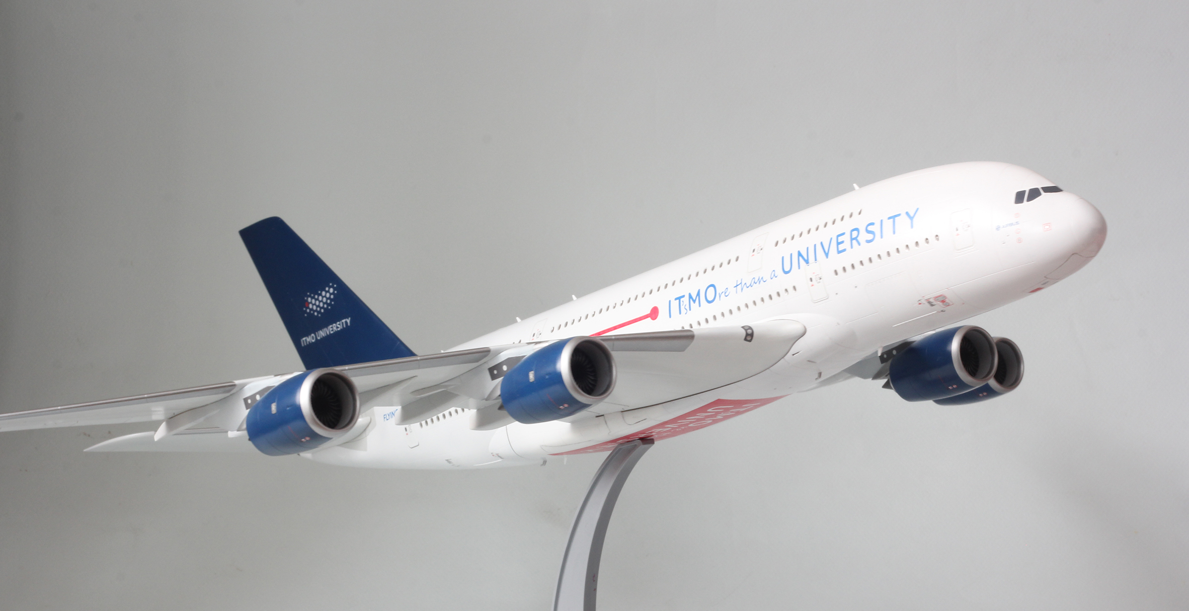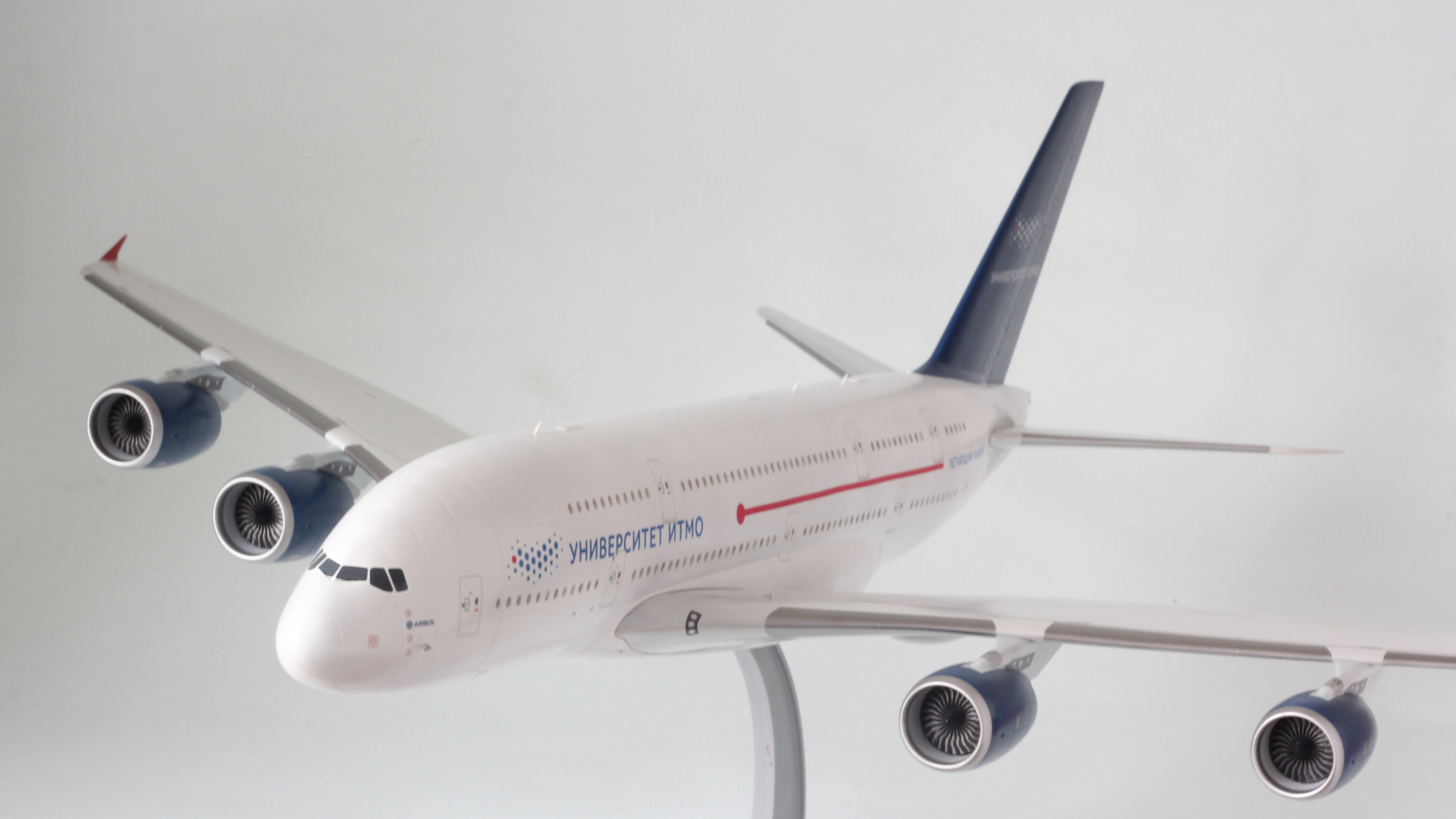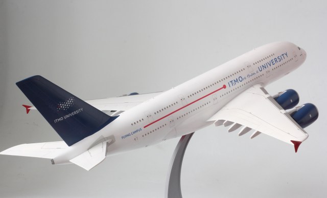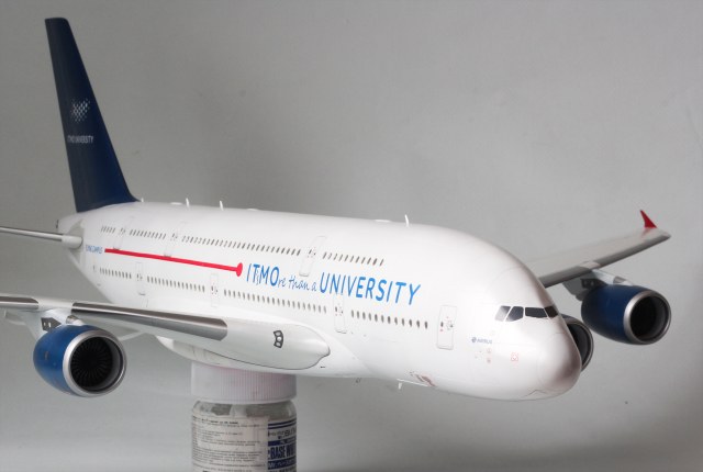 Еще одна модель, со скоростной сборкой. Самолет за брендирован под ИТМО. За помощь с декалями спасибо Алексею Бацких. Надо было уложиться в сроки и собрать за пару недель. Прошу не относиться особо серьезно, тк это скорее офисный аксессуар. Подставка конечно же будет другая. Еле успел сфотографировать модель, надо отдавать. Приятного просмотра.