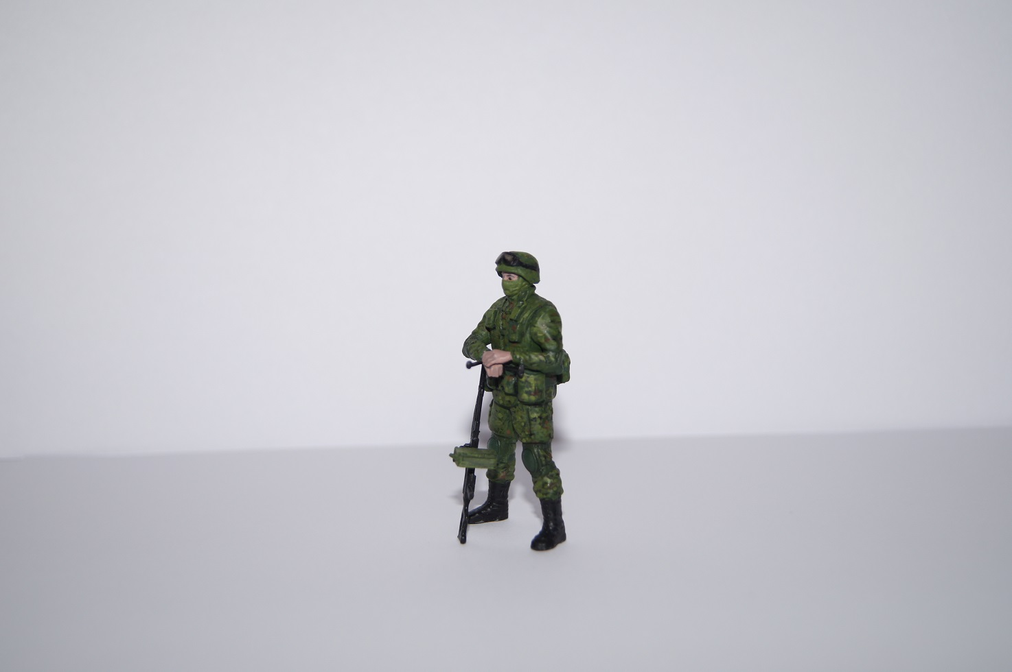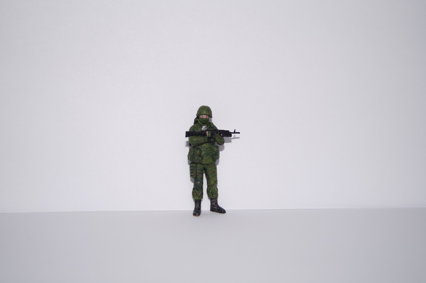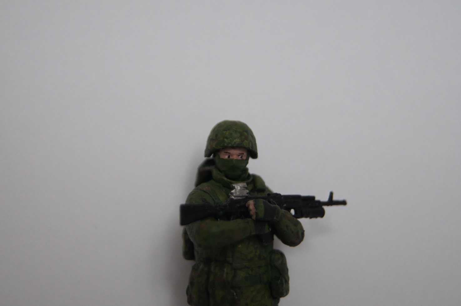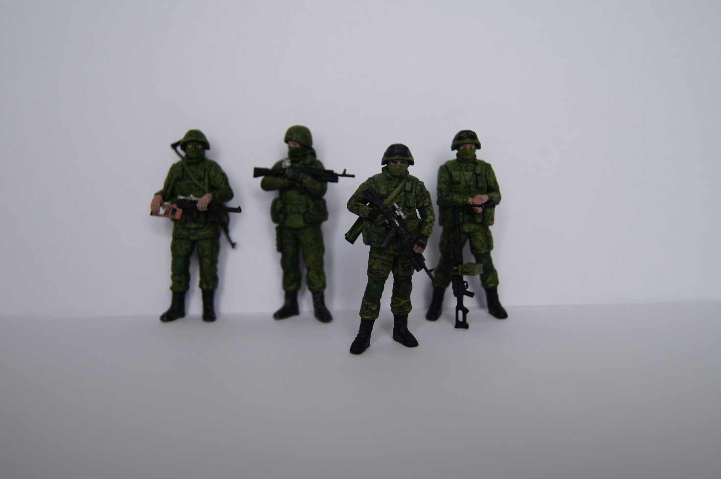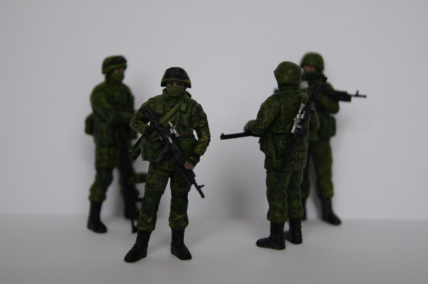 Разномастные фигурки слеплены с солдат из различных подразделений, участвовавших в операции по возвращению полуострова Крым, фотографии которых можно найти в сети. Однако я не стал пытаться воспроизвести прототипы, а окрасил всех в некоторый собирательный образ так называемых "вежливых людей" .