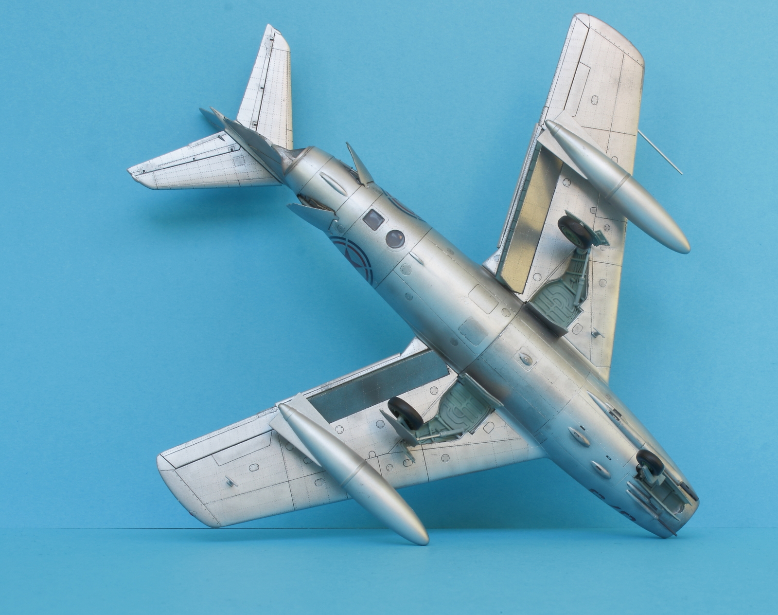 Видно, что автор старался - аккуратная сборка и покраска, но всякие мелкие "вкусняшки" типа: БАНО, окошко отстрела ракетниц на правой стороне киля, антенны РВ под плоскостями покрашенные в чёрный цвет, антенна УКВ РС не такого гигантского размера, отверстие дренажа топлива перед окошком МРП, указатели выпущенного положения шасси (солдатики),выделенные рукоятки открытия фонаря, правильно сделанное закабинное пространство под открытым фонарём, всякие шланги на стойках шасси, наклон открытого положения тормозных щитков оживили бы модель до состояния почти живого. Всё это можно сделать даже сейчас. А в целом - достойная работа. С уважением, Герман.