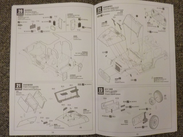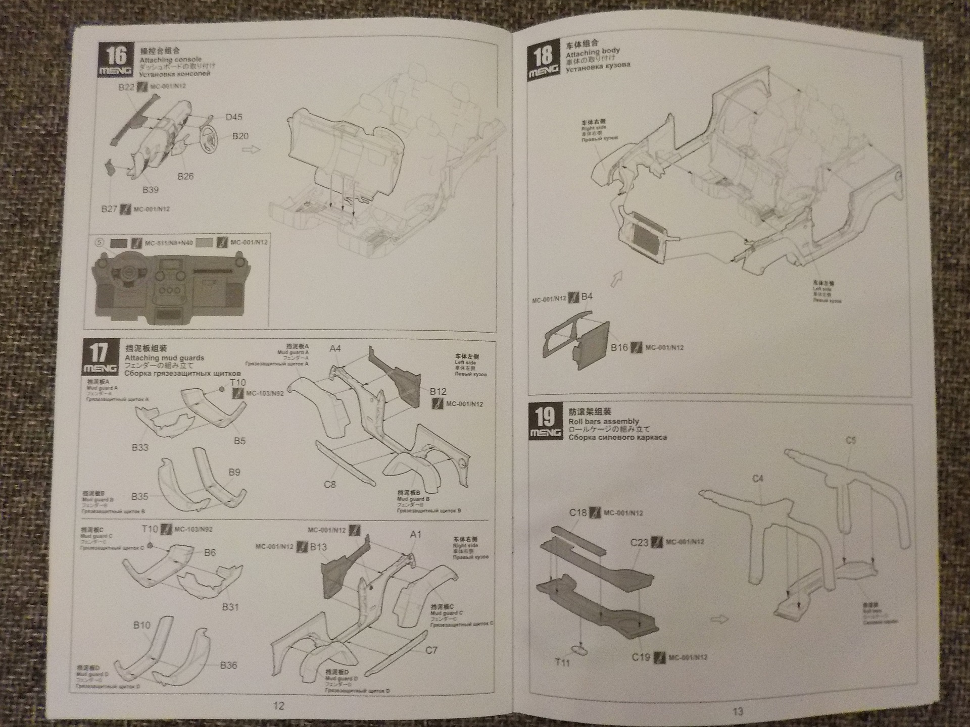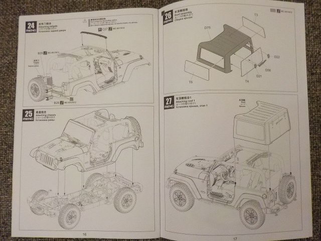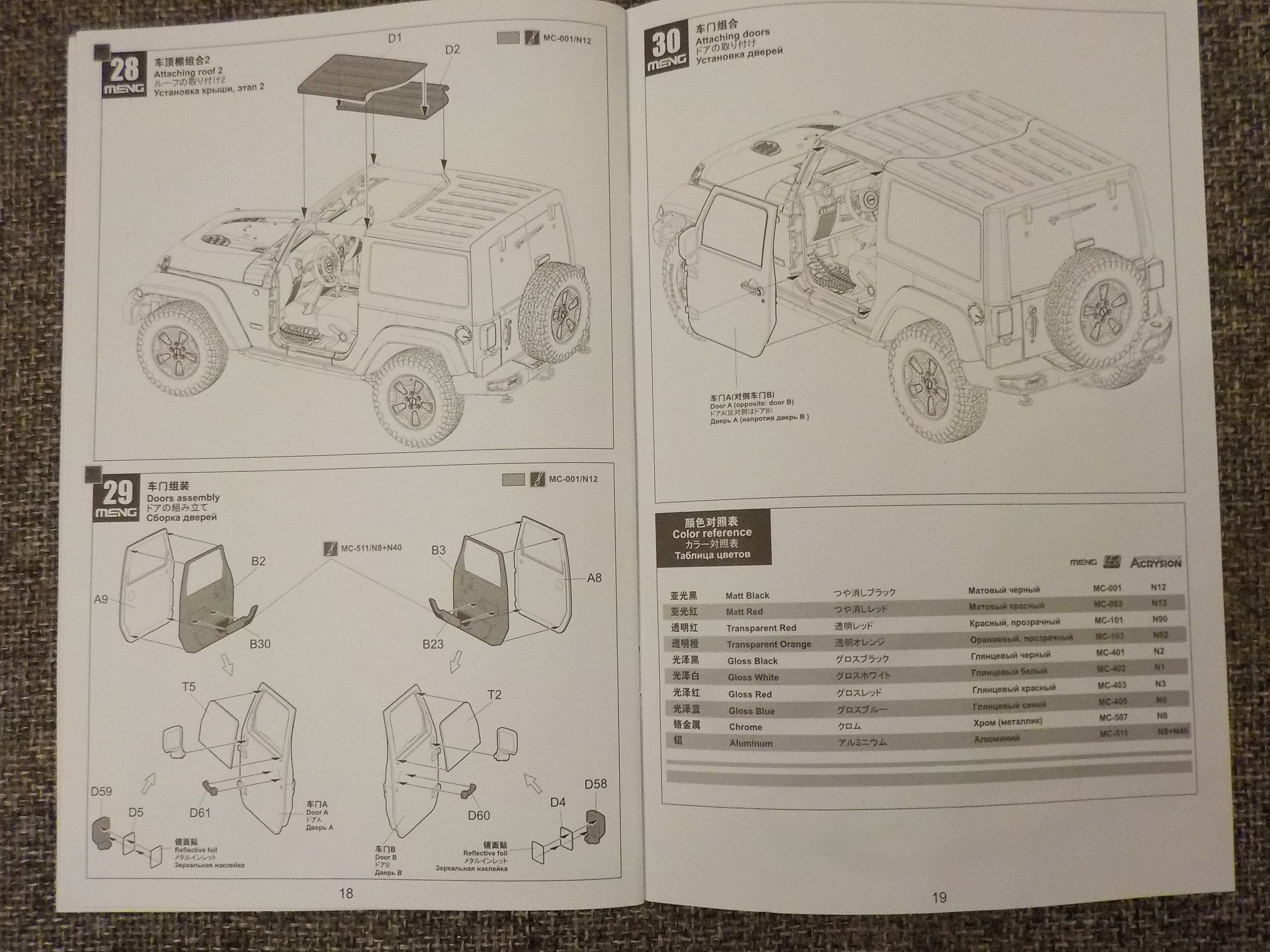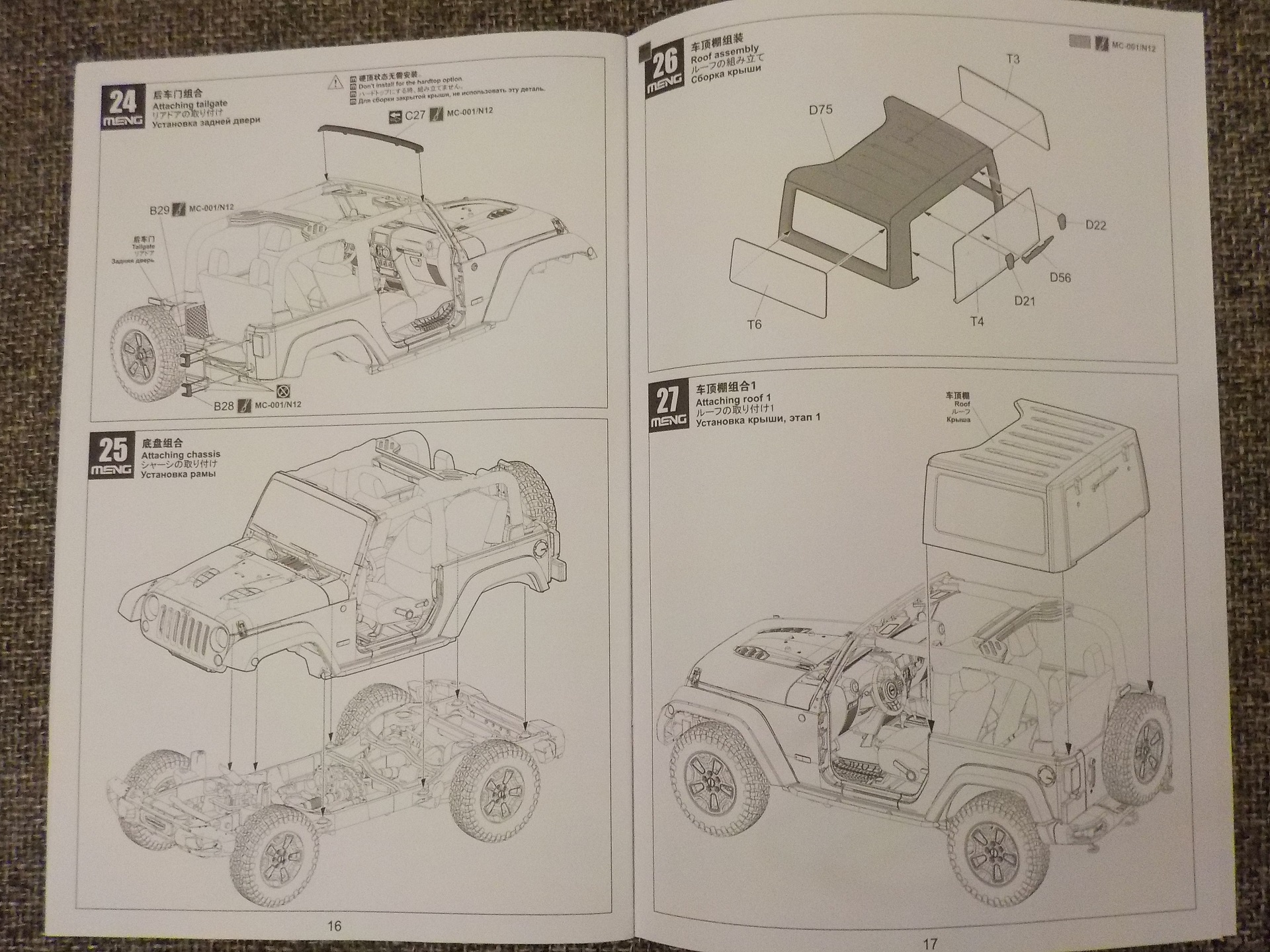 Доброго времени суток уважаемые карочане. Хочу представить вам набор от Менга Jeep Wrangler Rubicon. Качество литья как всегда на высоте. Жаль только деталей не очень много. Всего пять литников и один литник с прозрачными деталями, так же в набор входят пружины для амортизаторов (подвеска будет частично рабочей), немного декалей и четыре зеркальных наклейки. Детали кузова и сидений выполнены из цветного пластика, видимо производитель предполагает возможность сборки без покраски, хотя смотреться будет, думаю, не очень. Покрышки из мягкой резины, присутствует шов, но он смещен к краю. Предполагается возможность сборки с открытым и закрытым верхом. Подвеска представлена очень подробно, огорчает отсутствие двигателя. Извините за не очень качественные фотки, моя зеркалка мне сейчас недоступна, пришлось фоткать на дочкину мыльницу.
