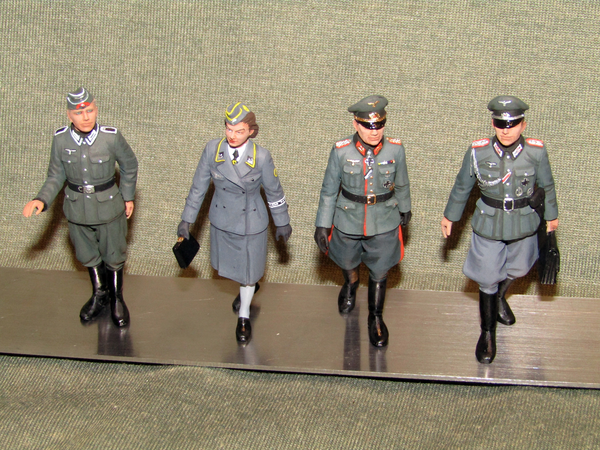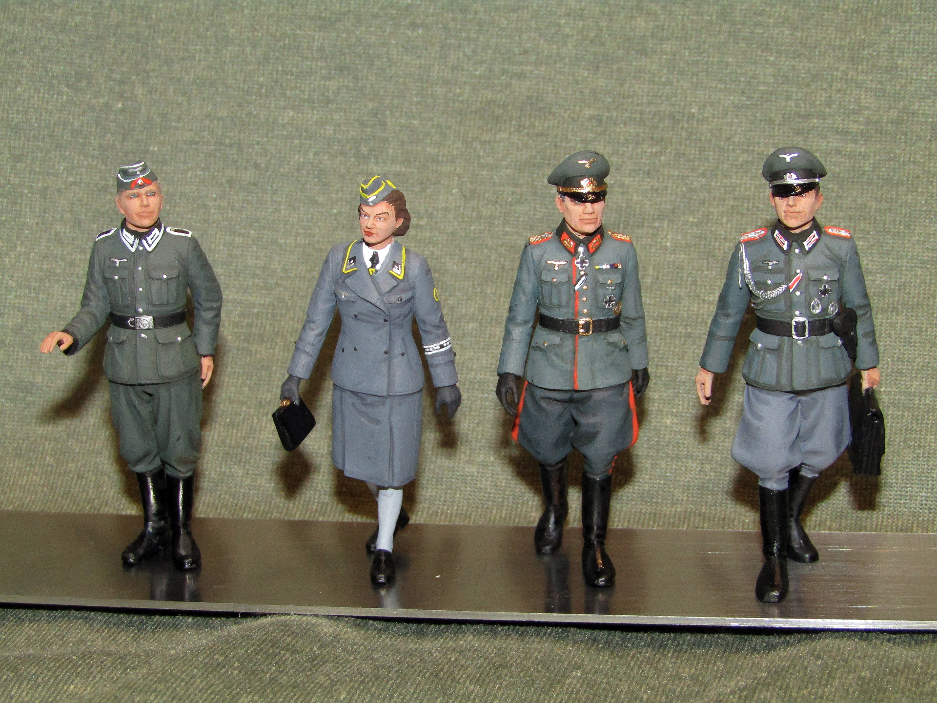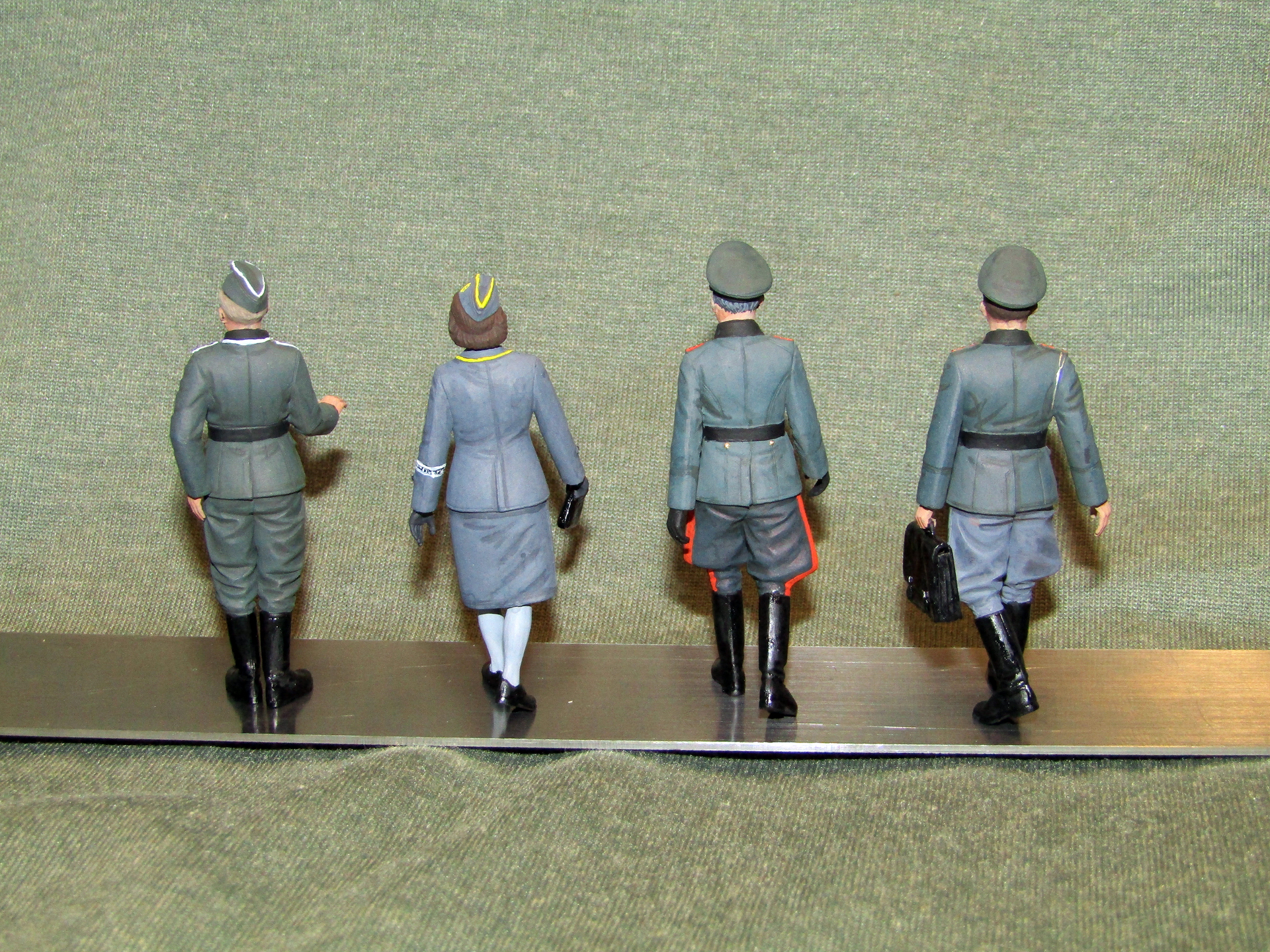 Всем доброго времени суток! Хочу представить свою очередную работу над фигурками в 35-м масштабе. На всё ушло примерно 3 вечера. Набор от ICM, как всегда на высоте. Никаких нареканий в адрес данной фирмы у меня никогда не возникало. Данные фигурки делал на заказ для диорамы. Грунтовал из аэра чёрным грунтом от «pacific 88». Красил в основном ПВА темперой, всякую мелочёвку эмалями от revellи «МАКР’ом» от звезды. Покрывать лаком не стал во избежание «предательского» глянца. А глянцевым лаком покрыл только те участки, где он действительно необходим (козырьки фуражек, обувь, сумка и женский клатч). Подробно сфотографировать "фрау" так и не смог - не хотела стоять на ткани и всё!) Приятного просмотра…