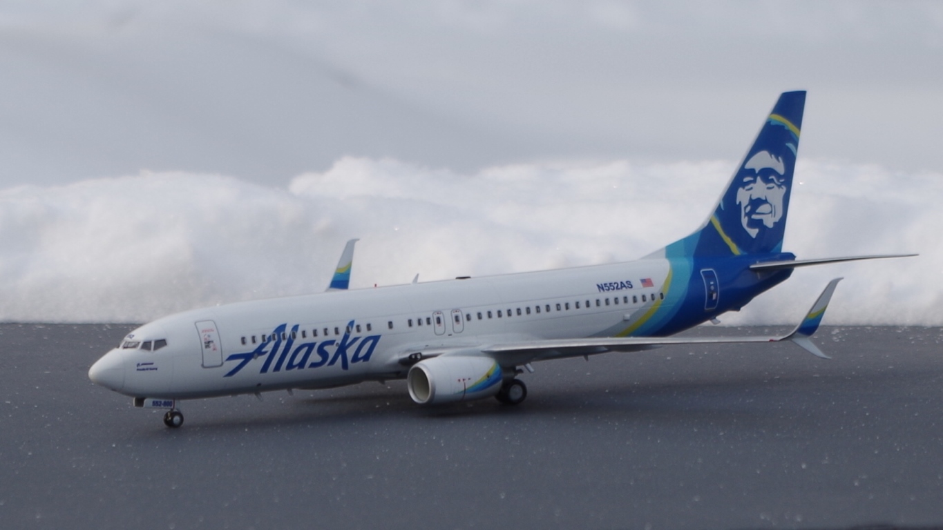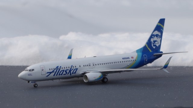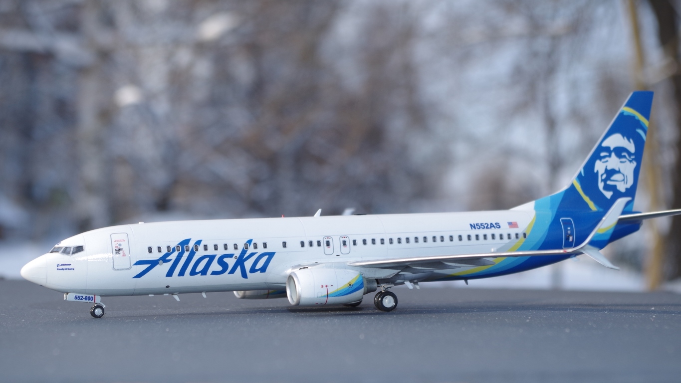 Здравствуйте! Выставляю модель самолёта, Boeing 737-800 в ливрее Alaska Airlines, которая окрашивалась по трафаретам, которые я изготовил из плёнки. В работе применял химию от Tamiya, все цвета мешал от неё же, в конце немного подтонировал и сделал следы эксплуатации, масляными красками, отечественного производителя. Несколько дней ждал солнечной погоды, и наконец то сегодня получилось сфотографировать, но немного помешал мороз и снег, который в последствии налип на модель, и пришлось по быстрому её убирать. Что получилось вы можете увидеть. Если фото не подходят, могу переделать, при более благоприятных погодных условиях. Только на фото увидел, что, колёса блестят, точнее забыл про них, и про матовый лак. Приятного просмотра !