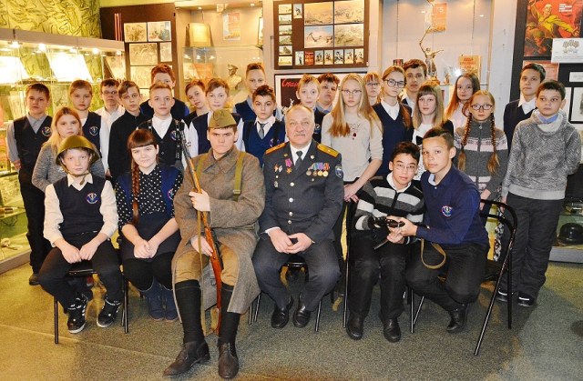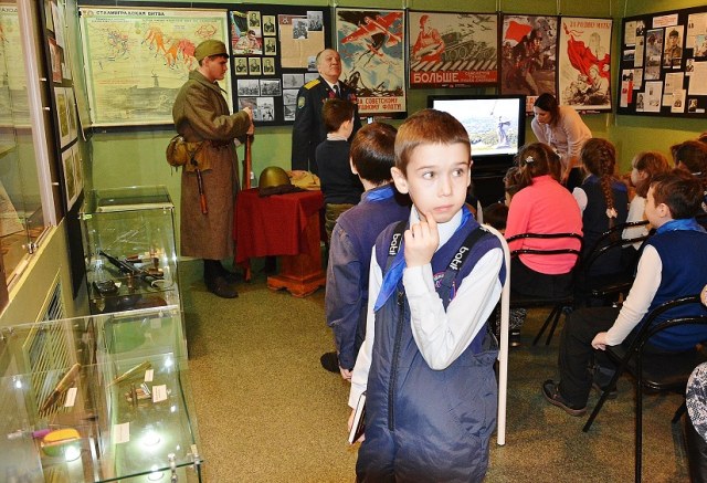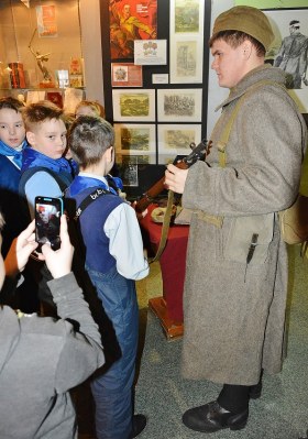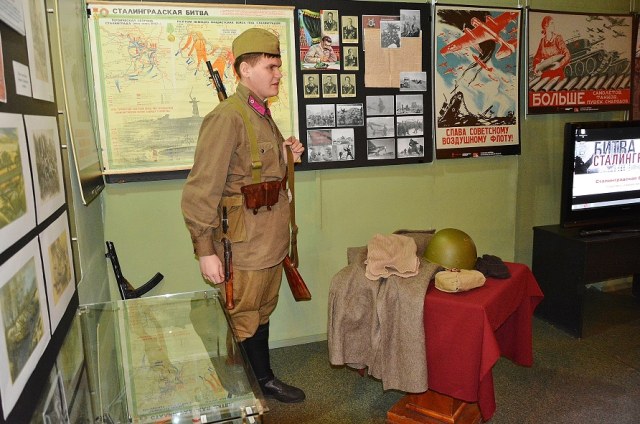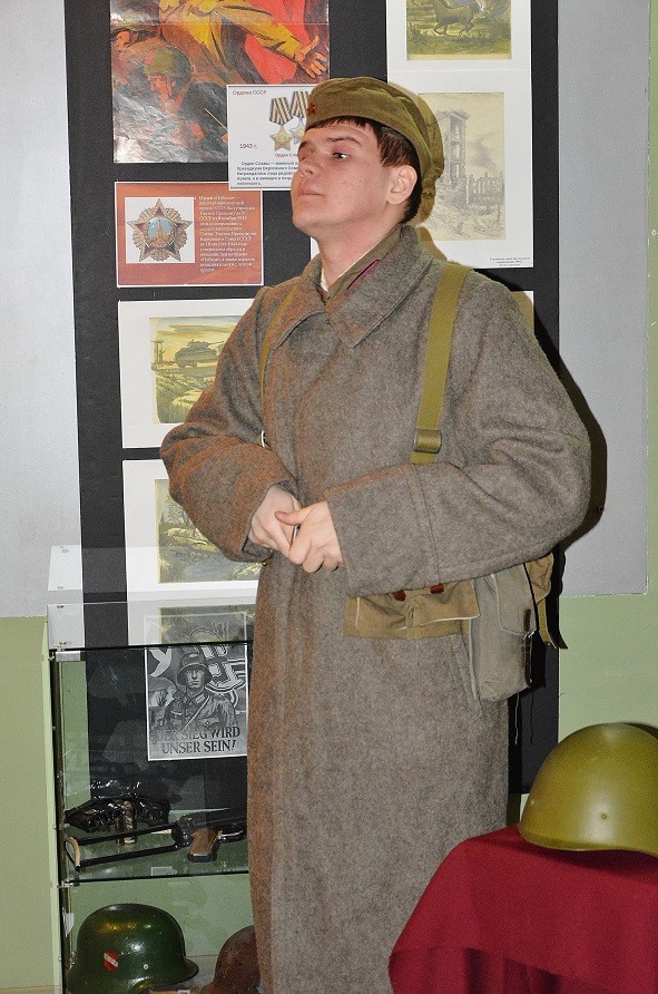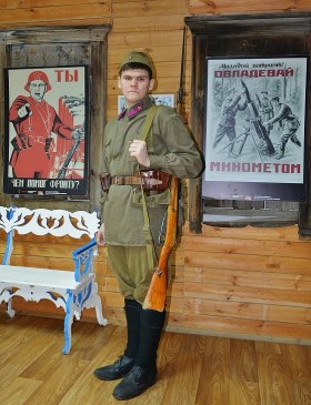 А еще у нас есть замечательный "говорящий манекен". :-) Классный парнишка, пришел волонтером, ведет экскурсии, принес много своих экспонатов. Демонстрирует обмундирование и вооружение. Для своих 20 лет тему знает отлично, детям нравится и старикам тоже. Он поисковик и исторический реконструктор, участвует постоянно в различных мероприятиях по всей стране.