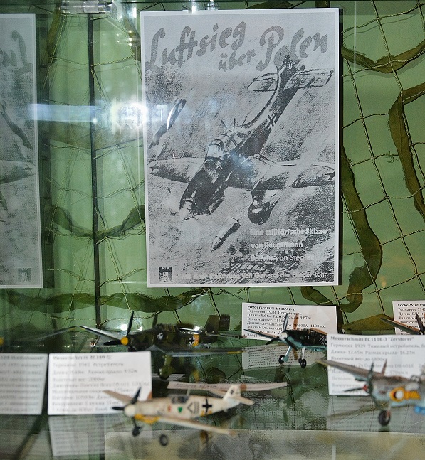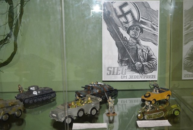 Александр Христенко - Спасибо за такой приятный отзыв! На счет черно-белых плакатов все просто. При расстановке все как обычно делалось в последний момент. Нужно было что то повесить в витринах с вермахтом и люфтваффе. Нашел по быстрому в сети несколько пропагандистских плакатов и распечатал на черно-белом принтере который в кабинете по близости. К цветному у нас доступ весьма ограничен и идет вечный бухтеж за фотобумагу. :-) Так что цензура тут не при чем. Все таки нужно будет на будущее распечатать в цвете, и форматом побольше. Советских плакатов у нас более-чем достаточно, но нужно и вражеские иметь. Кстати, знаете какие там слоганы? Прям один в один с нашими. Интернациональные слоганы: "Победа любой ценой!" и "Победа будет за нами!" :-)