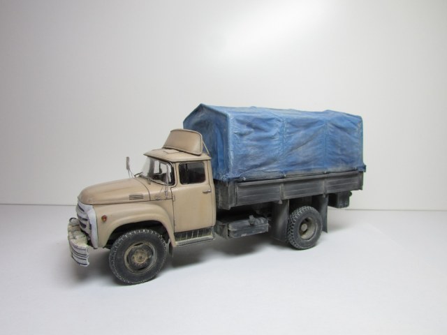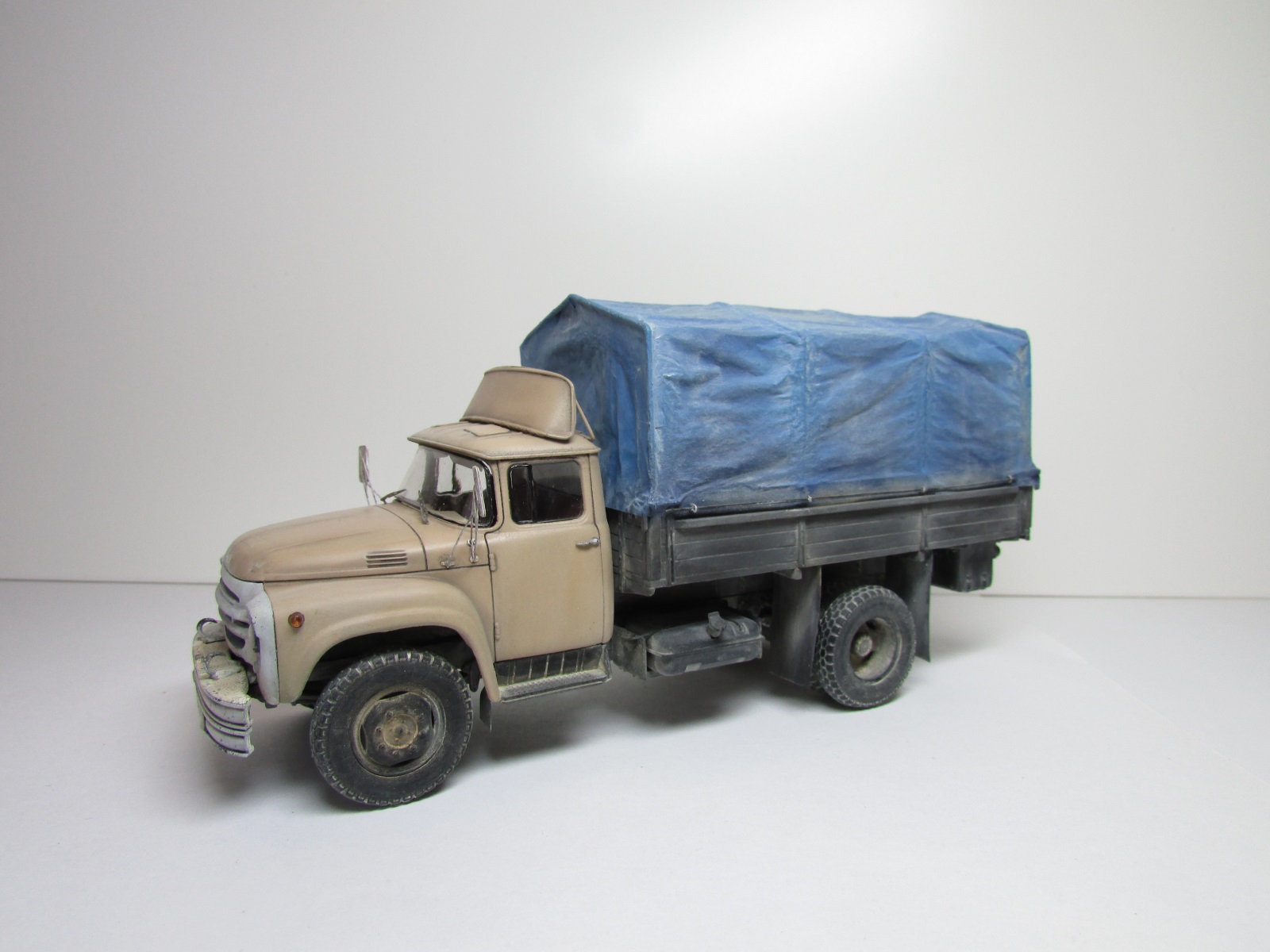 Всем добрый день коллеги! предлагаю Вашему вниманию Зил 130 в исполнении "Колхозный Тюнинг " ))) По модели было сделано следующее : согнуты из проволоки дуги , тент из обувной бумаги , пропитанной ПВА , крепления тента проволока , топливомагистраль от бака и подножка на бампере так же из проволоки , доработана стандартная оптика , туманки от Эльфа , брызговики выполнил из фольги , зеркала травление от петрограда , в завершении приколхозил под кузов два ящика для барахла , окраска база Тамия , полуматовый лак тамия, тонировка худ. масло , пигменты миг , как все получилось судить вам ) приятного просмотра