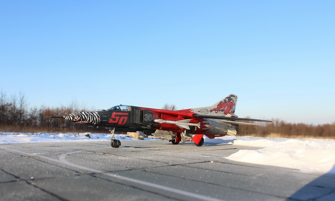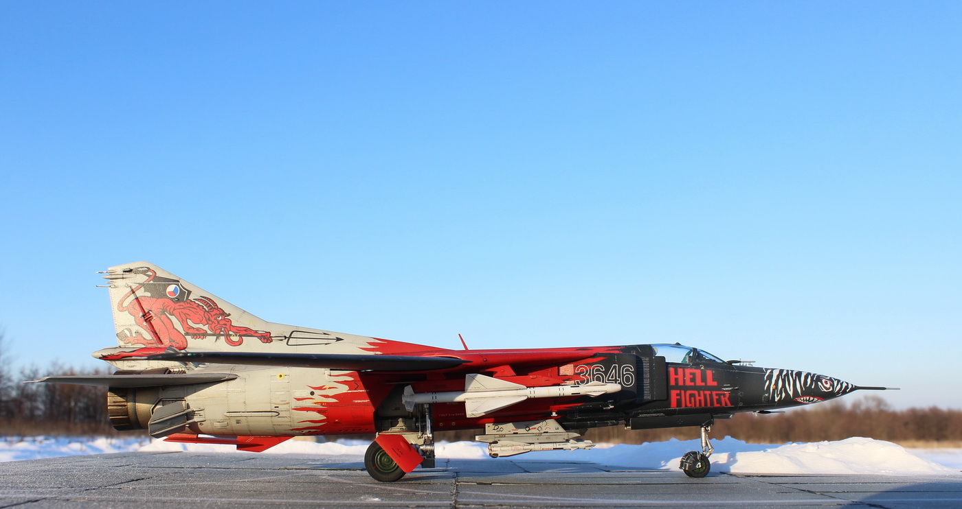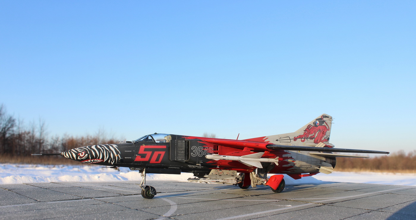 Всем доброго времени суток! Спешу поделиться с вами своей новой работой, а именно МиГ-23 МФ от trumpeter. Достался мне этот набор, как кот в мешке, все раздумывал, какой вариант ливреи сделать, вариантов было немного, либо поляк, либо чех, конечно чех выглядел эффектней, и я остановился на этом варианте, смущали конечно декали, боялся запороть, но, как говорится, глаза боятся, руки делают.