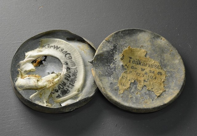 Жестяная баночка с некоей белой фигней внутри - это индивидуальная упаковка для порции пороха навешиваемого на хвостовик минометной мины.