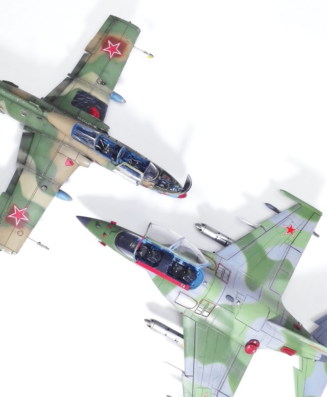 Набор от отечественного производителя вызывает двоякие ощущения. С одной стороны, набор классный- филигранно исполненные детали, кабина, которую можно сделать почти из коробки, широкая номенклатура вооружения, которой хватит на вооружение трёх бортов, каналы двигателей, проработанные ниши шасси и мелкие детали, с другой- непродуманная схема сборки и членение деталей (сопла с четырьмя швами, собирать модель приходится сразу с установленными стойками), очень мелкая расшивка, которую нужно перерезать, что большинство моделистов не делает, пирошнур, который дан внешней расшивкой и прочее. По совокупности недостатки являются камнем преткновения для многих моделистов, что приводит к странной ситуации, когда Як-130 ждали все, купили все, а собрали единицы.