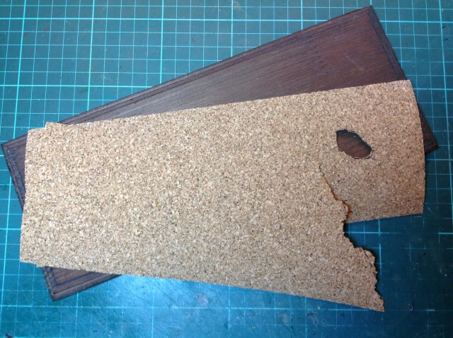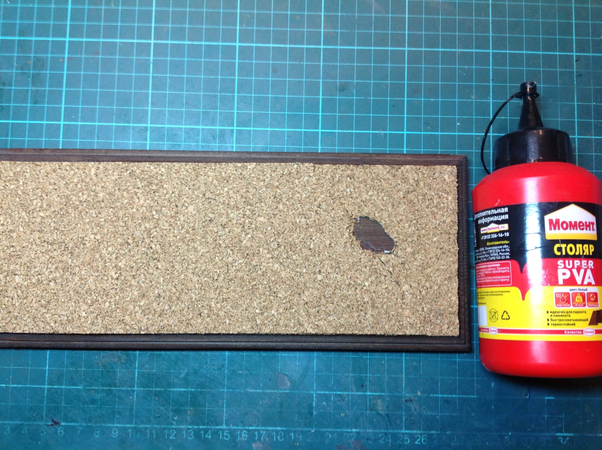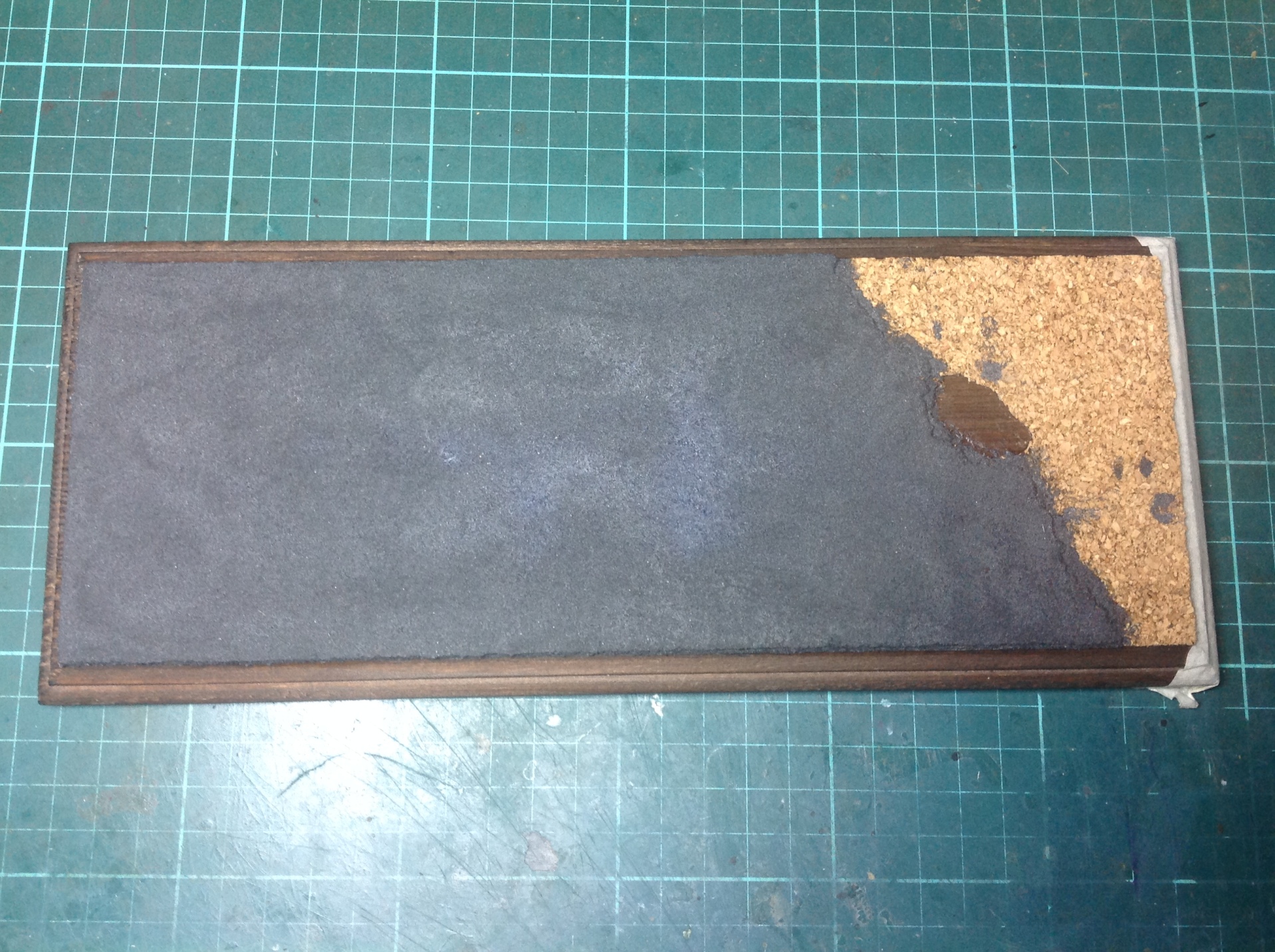 Были вырезаны две одинаковые заготовки. От одной из заготовок был оторван край для имитации неровного края асфальтового покрытия. Во второй заготовке сделано отверстие, имитирующее край лужи. Заготовка с «лужей» приклеена клеем ПВА к основанию, а на неё заготовка для «асфальта».