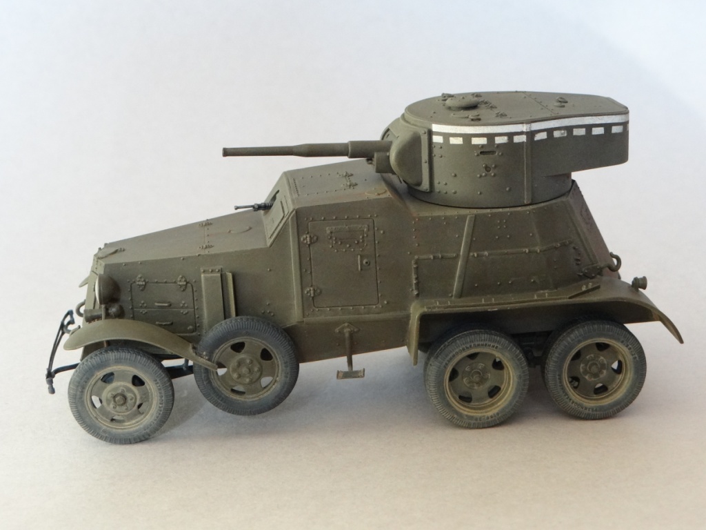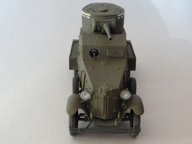 Модель данной машины делалась мною из набора Hobby Boss кат.№ 83838. Если модель собирать из коробки, то она очень неплоха и несложна. Все складывается, шпаклевка не понадобится. В наборе есть резиновые колеса, минимальное травление, стекла фар. Довольно детализированный двигатель, зачатки интерьера в виде руля и сидений. Но это же Хоббик, дитя Трумпетера! Их девиз: скорость - в ущерб копийности. Поэтому эта модель обладает букетом врожденных болезней. Резиновые колеса отлиты с надписями на боку "Ярославский резинокомбинат" с несколькими ошибками, бампер и буксирные крюки не похожи на себя. Литник с башней взят из набора танка т-26 этой же фирмы, она неправильна и требует доработки: удалить пробки отверстий для стрельбы из личного оружия, сделать их заново, без пробок, но с задвижками, добавить одну в корму башни под нишей, доработать дверцу в нише, не устанавливать смотровые приборы в крышу башни, добавить недостающие метизы. Основное разочарование, это задняя дверь, в боевом отделении: форма ее в корне неверна, желательно ее полностью зашпаклевать по периметру, и вырезать новый контур.