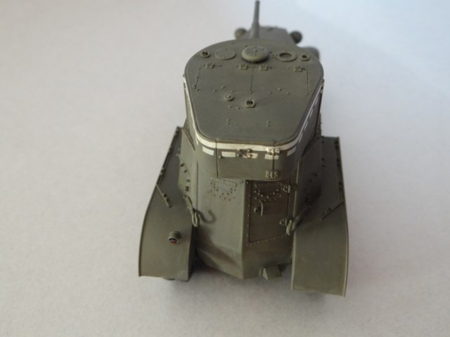 Красил МИГовской защитной алкидно-уретановой, характерной для машин 30-х годов. Тактические обозначения на башне задувал краской с помощью масок. В качестве эксперимента "запылил" МИГовскими же "жидкими пигментами", результатом доволен не совсем, есть над чем поработать. В целом, с учетом доработок, такая маленькая модель отняла совсем немало времени. Хотелось установить еще и оверроллы, отсутствующие в наборе, но купленные мною оверроллы от Вояджера оказались на себя совсем не похожи. Проанализировав эту тему, я понял, что наиболее приближены к оригиналу цепи прилагаемые к бензозаправщику БЗ-38 от Миниарта, надеюсь, что они их выпустят отдельно.