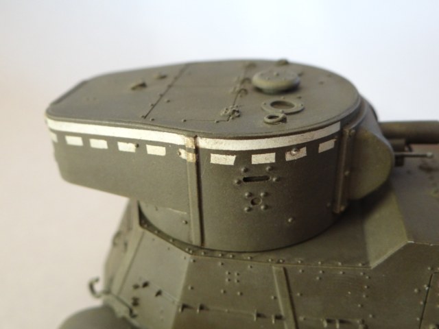 Весь объем доработок я не делал. Выполнено следующее: колеса заменены на смоляные колеса ГАЗ/БА ранние"Резинообъединение") от Комплект ЗИП 35047, бампер изготовил из остатков травления, сточена бронекрышка на заливной горловине радиатора, переделана башня, как указано выше, добавлен ранний металлический ствол 45-мм пушки 20К образца 1932 года от РБ-Моделс.