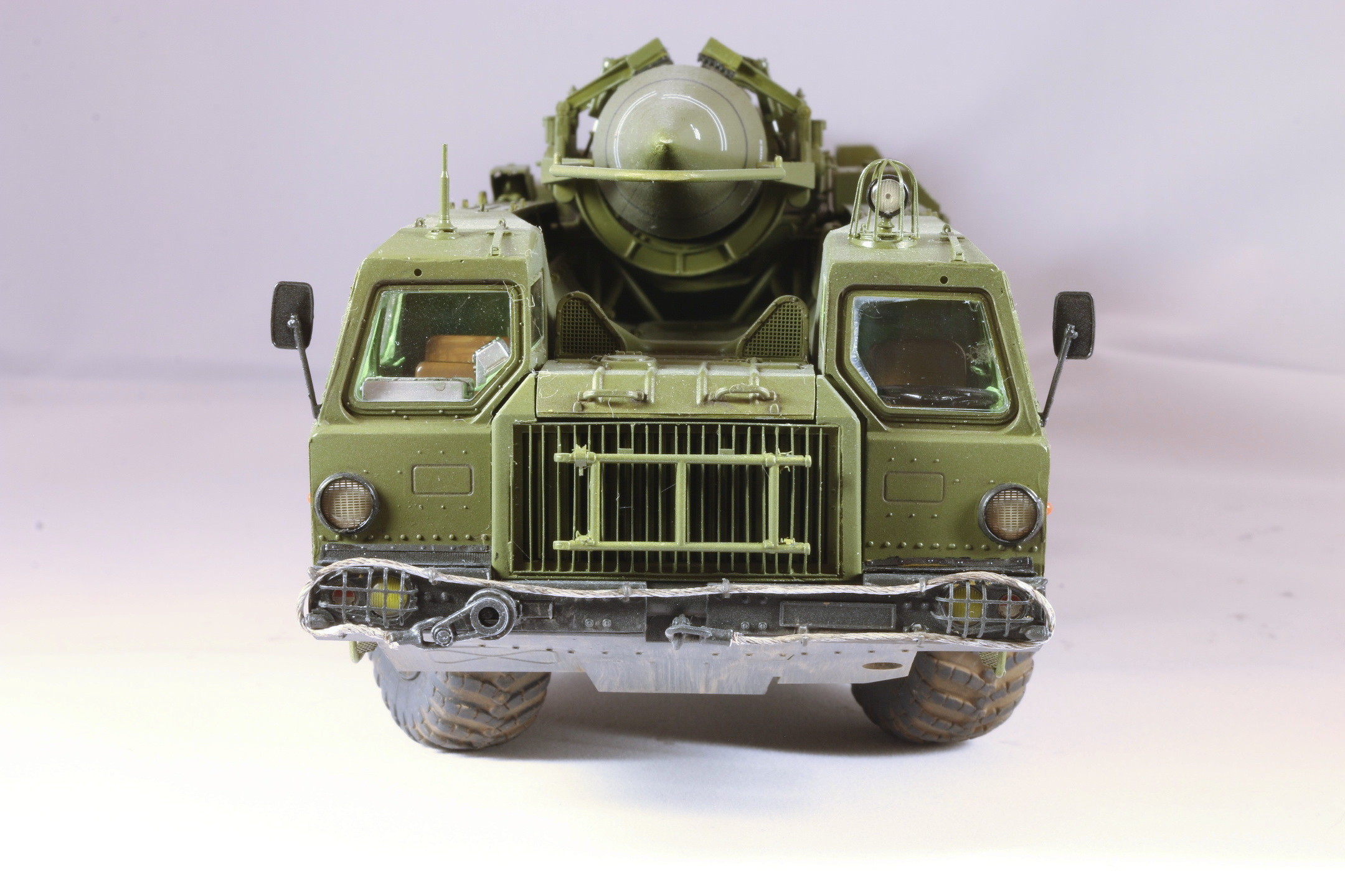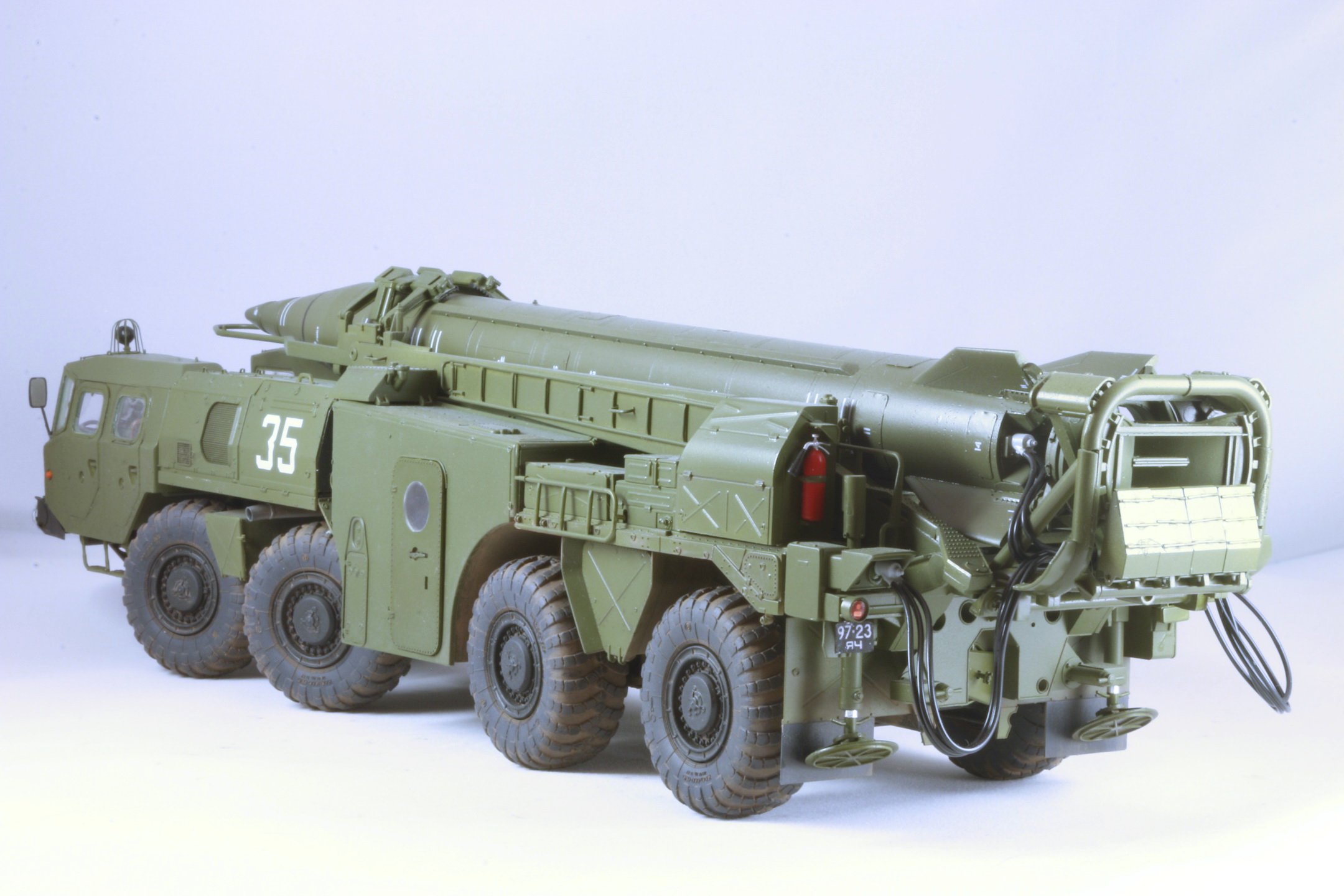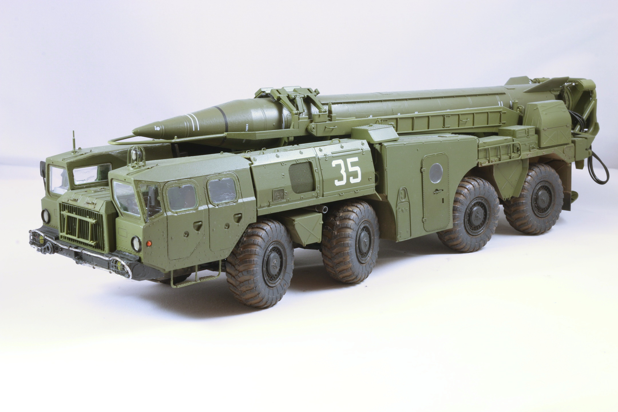 Моя первая модель в масштабе 1/35, да и вообще наверное первая. Строил по выходным к юбилею отца, бывшего в 80-х годах командиром 3 батареи 75 ракетной бригады, на вооружении которой состоял оперативно-тактический ракетный комплекс 9К72. В работе использовал частично набор фототравления от Voyager Model PE35737. Частично, во-первых из-за ограниченного, как оказалось, времени и во-вторых, из-за избыточности, как мне показалось, деталировки, некоторые детали вполне прилично оказались отлитыми на модели в пластике. Кроме того, использовал набор линз фар и задних фонарей того же Voyager Model BR35099. При сборке пользовался жидкими клеями от Tamiya и GSI Creos (Gunze Sangyo). В модели допустил некоторое количество косяков: стекло со стороны механика-водителя заляпал клеем, отсек с баками приклеил к раме криво, допустил невнимательность при установке дверей в кабины, в результате чего получил ступеньку, недопылил некоторые участки, после снятия масок нашёл пару непрокрасов. Кроме того, залил клеем петли, после чего решил двери сделать закрытыми. Двери боевой рубки не приклеивал, только приложил, для доступа к внутренностям рубки. По матчасти в основном отдался на волю производителя, только декали взял не из набора, а соответствующие пятому агрегату дивизиона, из состава 3 батареи.