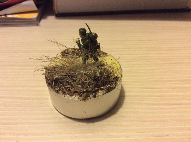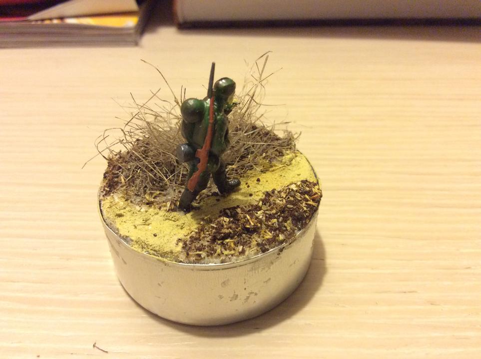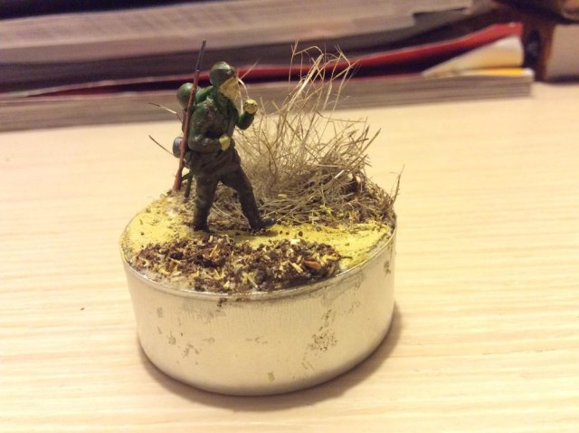 Собрал виньетку из чайной свечки,украсил песком,высушенным молотым кофе и приклеил паклю в виде иссохшихся кустов.Критику принимаю