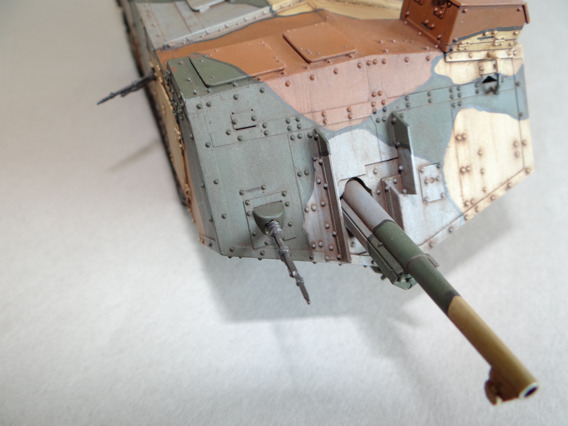 Модель достаточно точно воспроизводит позднюю машину, за исключением нескольких моментов. Например, траки шириной 500 мм выполнены без накладных шевронов, и насколько я знаю, ни один производитель афтемаркета не выпускает правильные поздние траки. Недостающие заклепки на щитке заднего поста управления добавить достаточно легко, есть неточности в расположении усиливающих накладных полос.