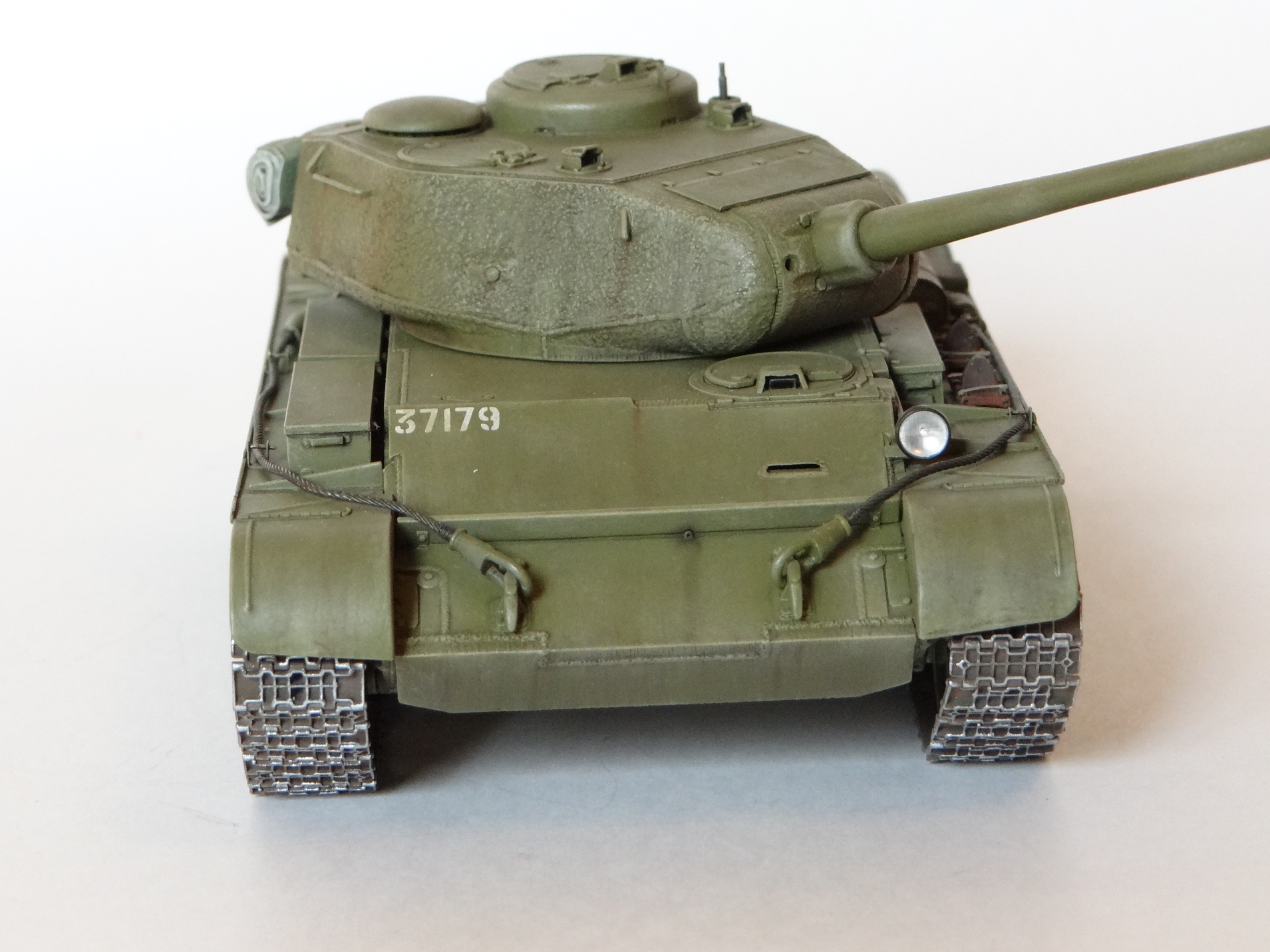 Пластиковые траки, к моему сожалению я не осилил… они «типа» (сколько раз я это повторяю???) подвижные, но в реальности разваливаются от малейшего чиха…(та же история у меня сложилась с их траками на СУ-122((( ). Честь и хвала тем моделистам, кто их одолел. В общем, поставил металл. Фара от Эльфа мне тоже понравилась гораздо больше.