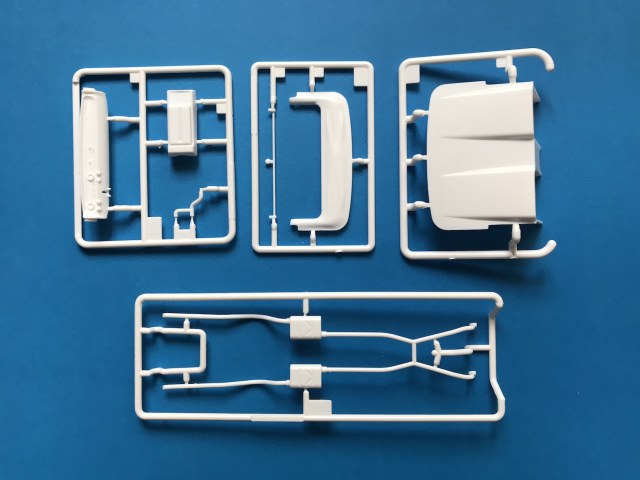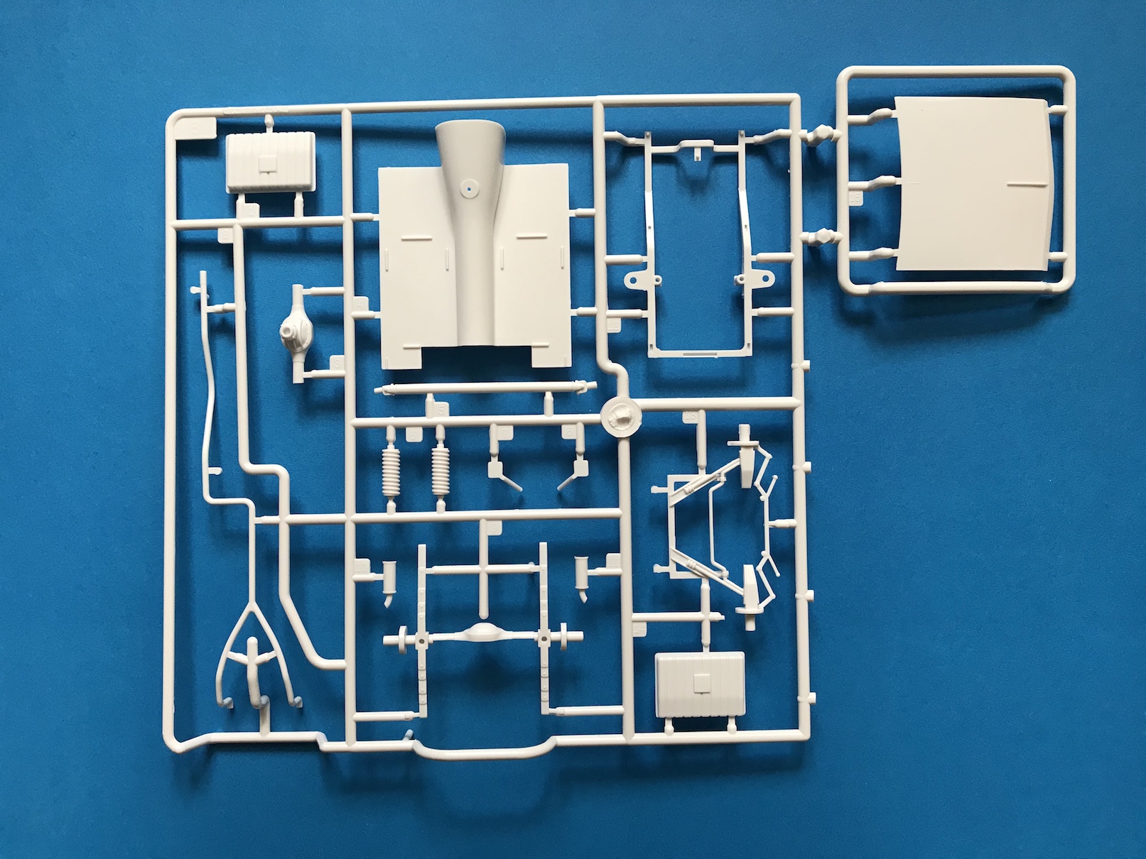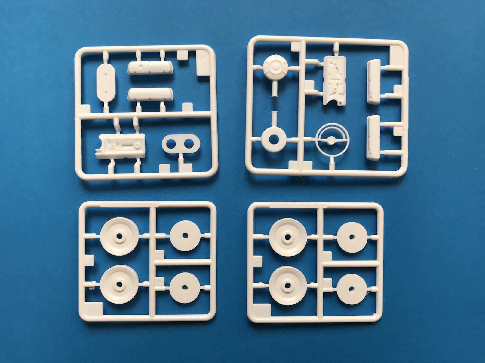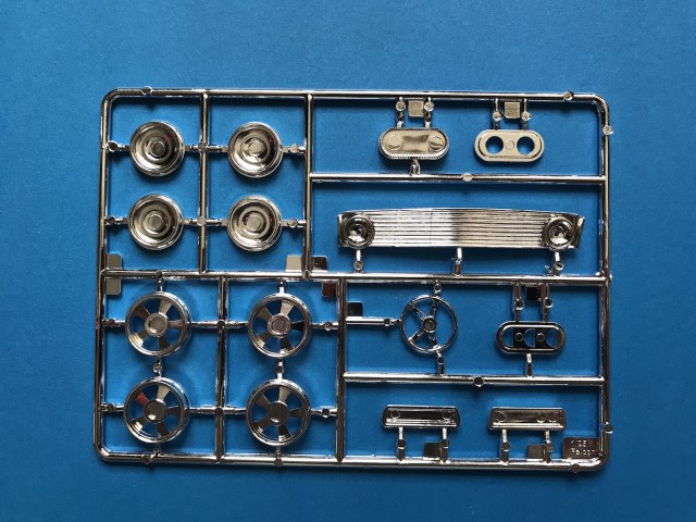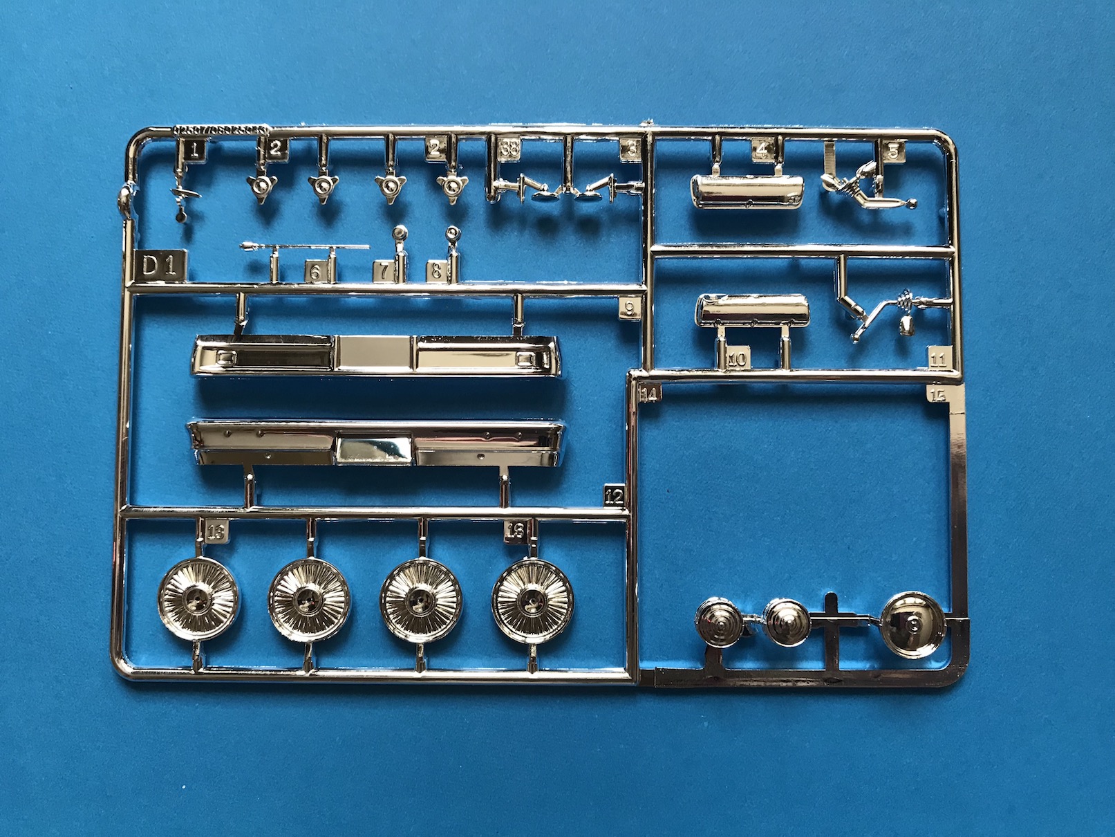 Первое, что бросается в глаза после открытия коробки - огромное количество литников, аж 18 штук, плюс отдельно кузов и шасси. Объясняется это широкой вариативностью сборки модели даже «из коробки». Можно собрать двухдверный вариант, четырёхдверный, с разными вариантами колёс, хромированными или крашенными деталями двигателя и салона. И для всех вариантов в наборе присутствуют готовые детали - карты дверей, диски, различные детали двигателя и салона, сидения и всё прочее. И даже цвет краски для многих деталей не указан - как хочешь, так и крась. Меня така вариативность очень впечатлила.