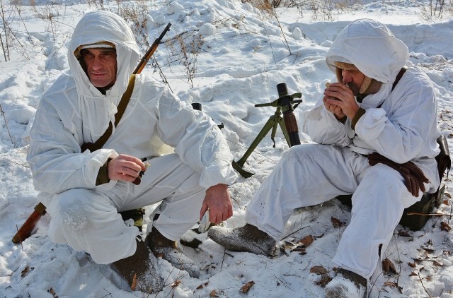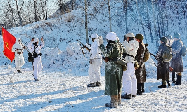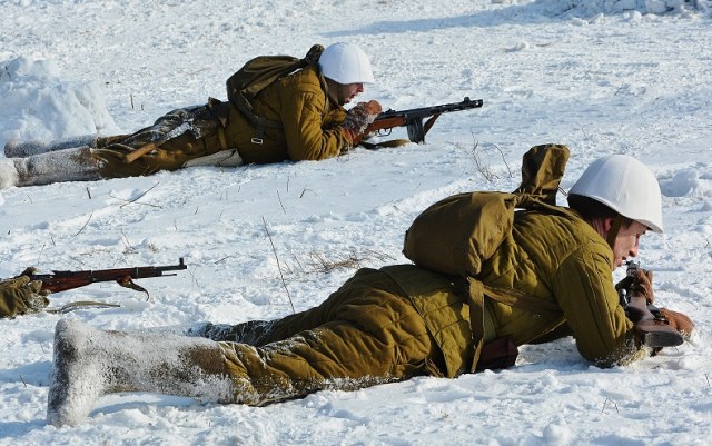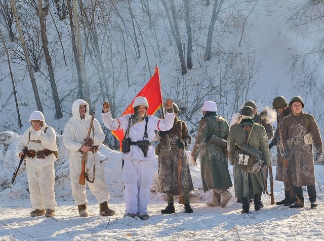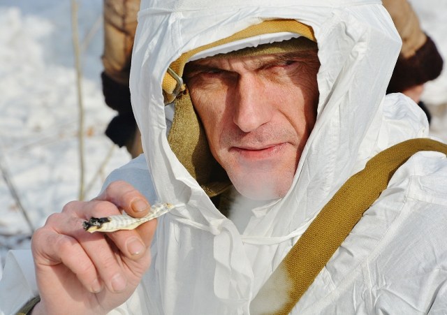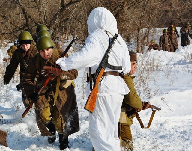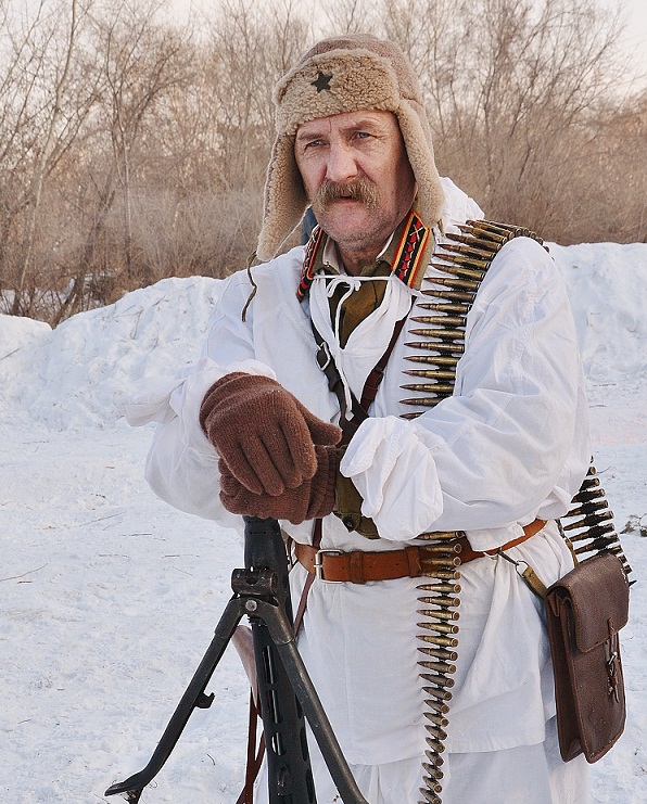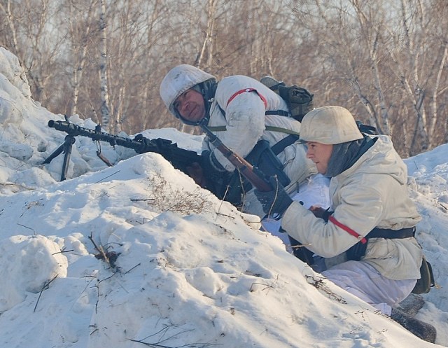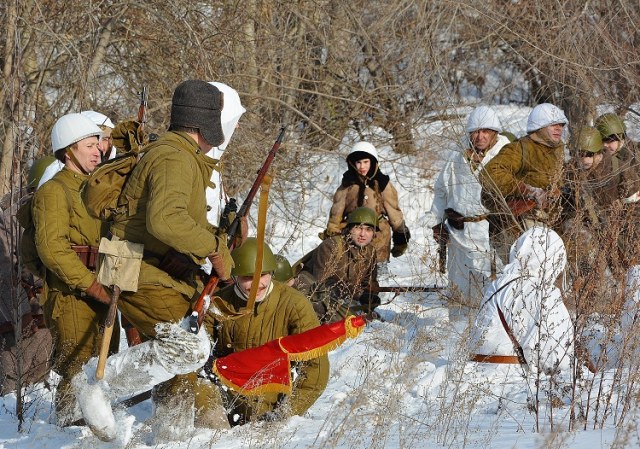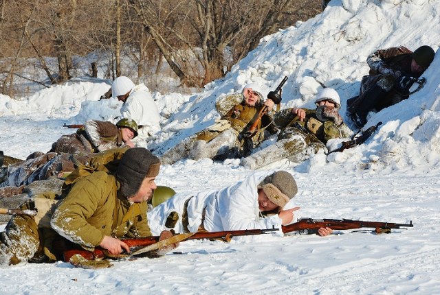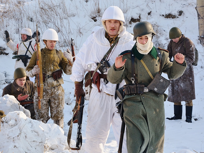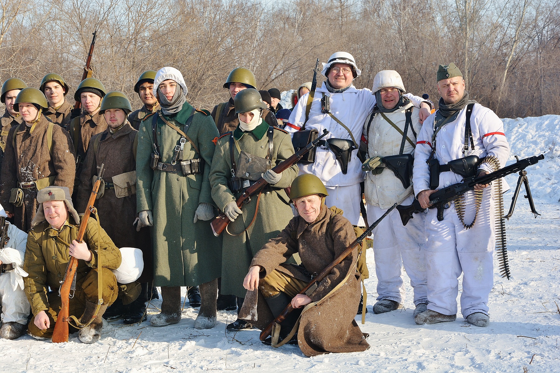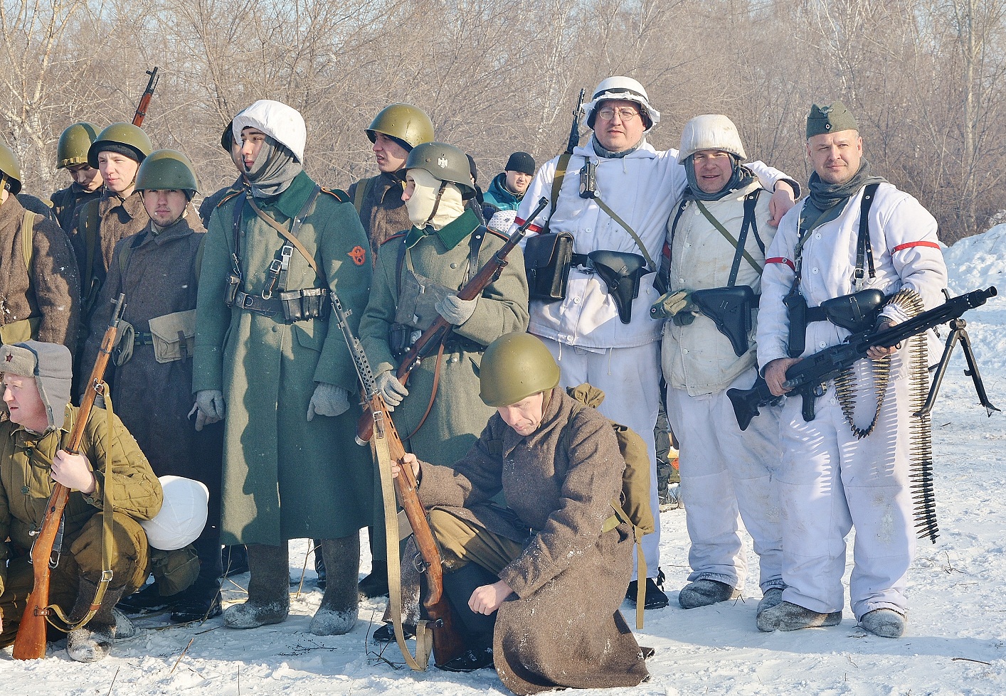 Всем спасибо. Артем, (кстати, я вижу - земляк, а Вы сами на мероприятии не были, случайно?), ну, с точки зрения исторической достоверности и дроны-коптеры над полем боя не летали. :-) И ДОТы из снега никто не строит. :-) Зато как красиво и эпично этот колоритный усач-знаменосец погибал... Мне другой момент глаз резанул. С точки зрения режиссуры и постановки. Вот когда "наши" захватили позицию "фрицев" и начали их в "плен" брать. Немцы подняли лапки и угрюмо-послушно под конвоем отправились в плен... Прям так с кобурами и подсумками. Ясно-понятно, что боец беря противника в плен, первым делом должен его разоружить, обыскать-ощупать, а если нужно, особо борзого - обездвижить. Либо связать руки, либо вырубить прикладом по тыковке. Либо ногу прострелить. Такова уж жесть войны, и с этим ничего не поделаешь. На этой реконструкции ребята чего то не доиграли, не учли... Гораздо правдивее смотрелось бы, как один боец держит врага на мушке, а второй сдергивает с него всю эту сбрую с обвесами и подсумками, шмонает, финку из сапога достает, часы снимает, портсикгар - себе за пазуху, документы листает а там фотка - фрау Бругхильда с парой упитанных гитлерюгентов... :-) Надеюсь такие нюансы учтутся при следующих мероприятиях.