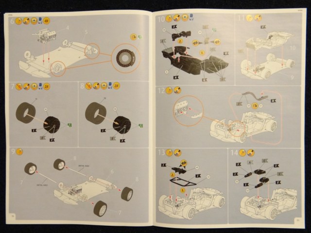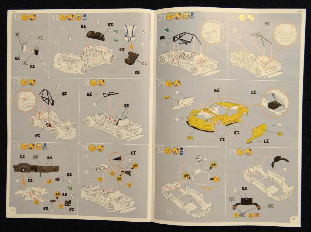 Открыв коробку мне сразу бросилась в глаза цветная иллюстрация гоночного автомобиля на инструкции, но больше я удивился тому, что вся инструкция исполнена в цвете! Теперь Revell предлагает нам не только буквенное обозначение окраски, но и показывает к какой букве какой относится цвет. Так же в самой инструкции нам показывают все детали сборки уже окрашеные по цветам.