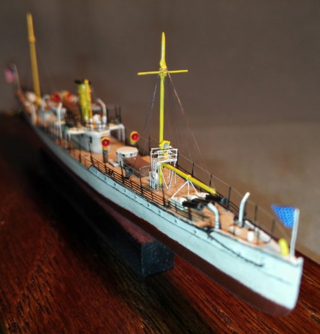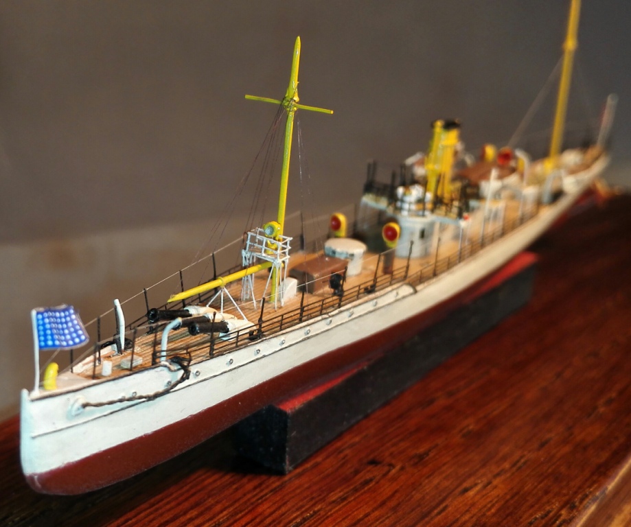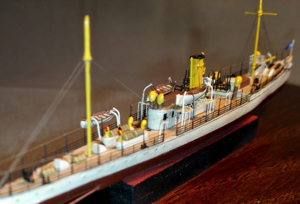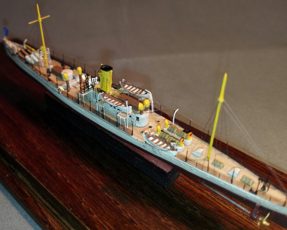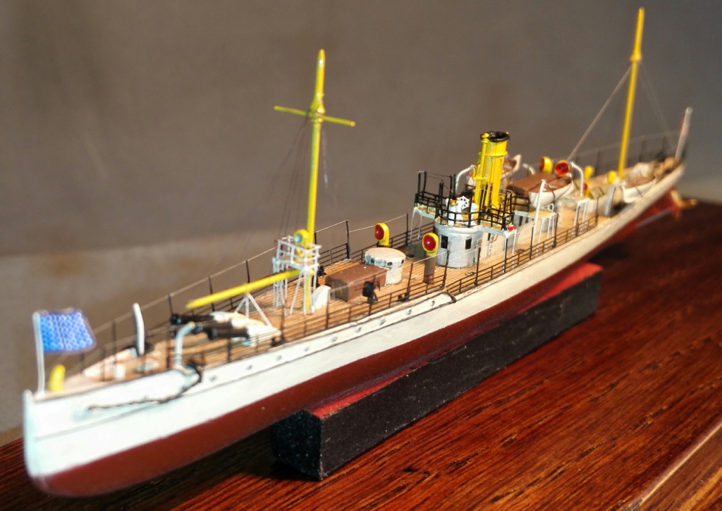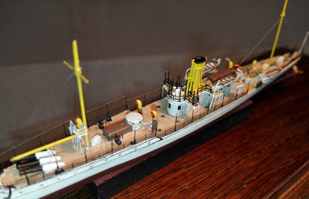 Эта модель мне досталась в подарок с целой кипой других изделий,но с условием собрать максимально хорошо. В исходнике был только корпус по ватерлинию,палуба надстройки,труба,дефлекторы,шлюпки и поведённые мачты и шлюпбалки. Так как я люблю делать полнокорпусные модели,то первым делом сделал подводную часть по фотографиям картонной модели от Бумажного Моделирования (если не ошибаюсь). Были сделаны валы и гребные винты с рулем. На бортах установил по фотографиям иллюминаторы,сделал шлюпбалки и подпорки под крылья мостика. Из проволоки выточил мачты. Сделал площадку носового прожектора и сам носовой прожектор,якоря и три пушки Гочкиса.
