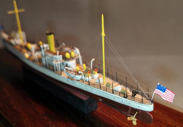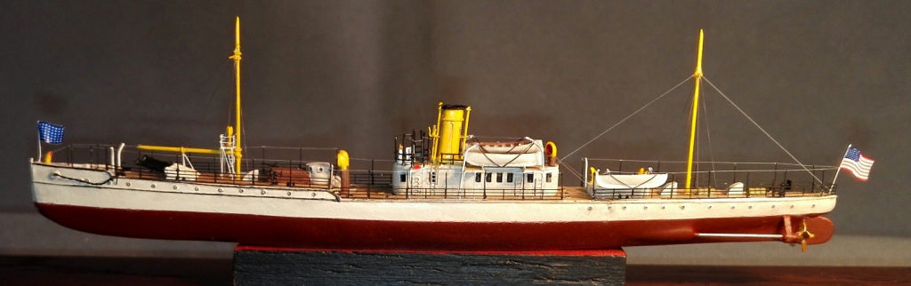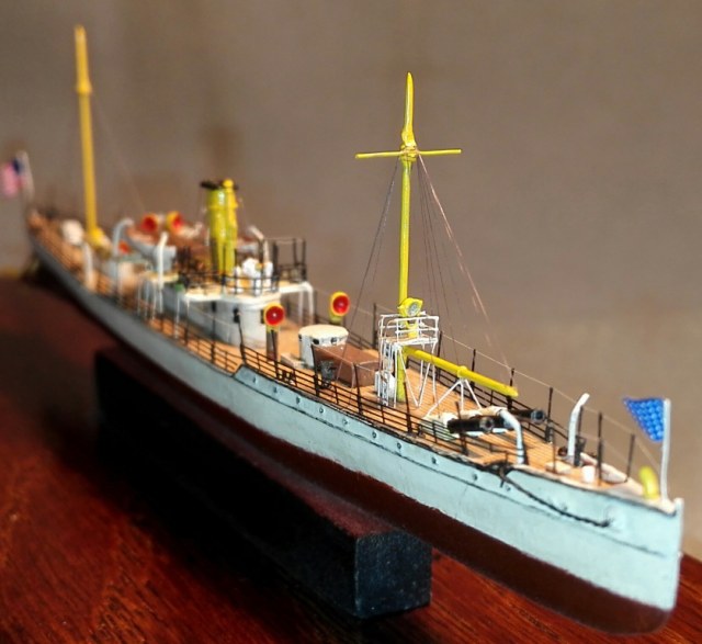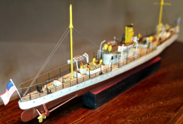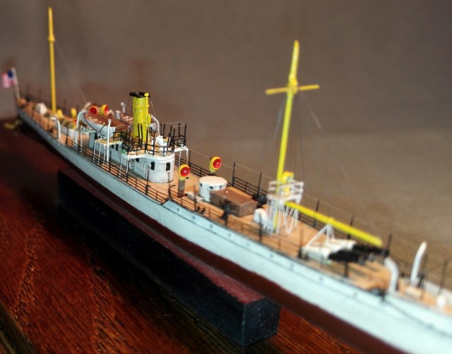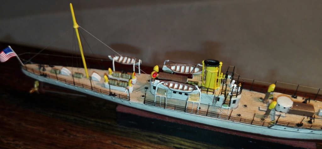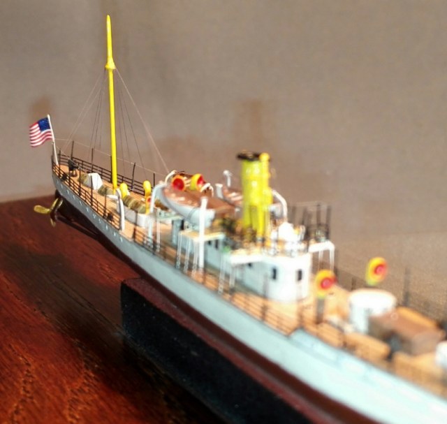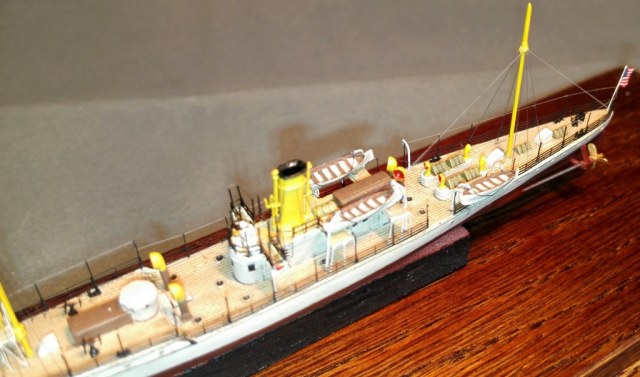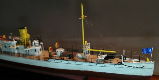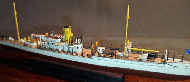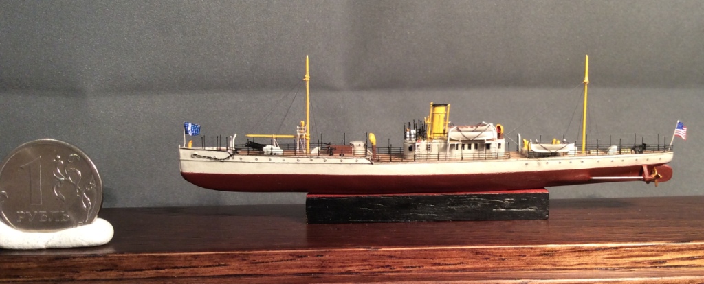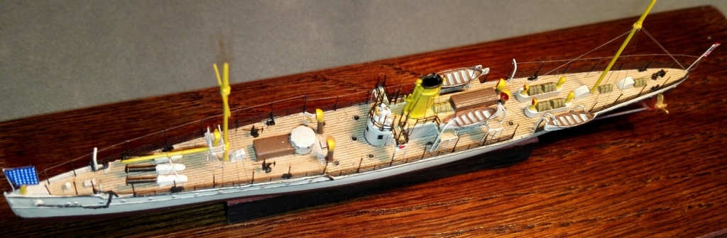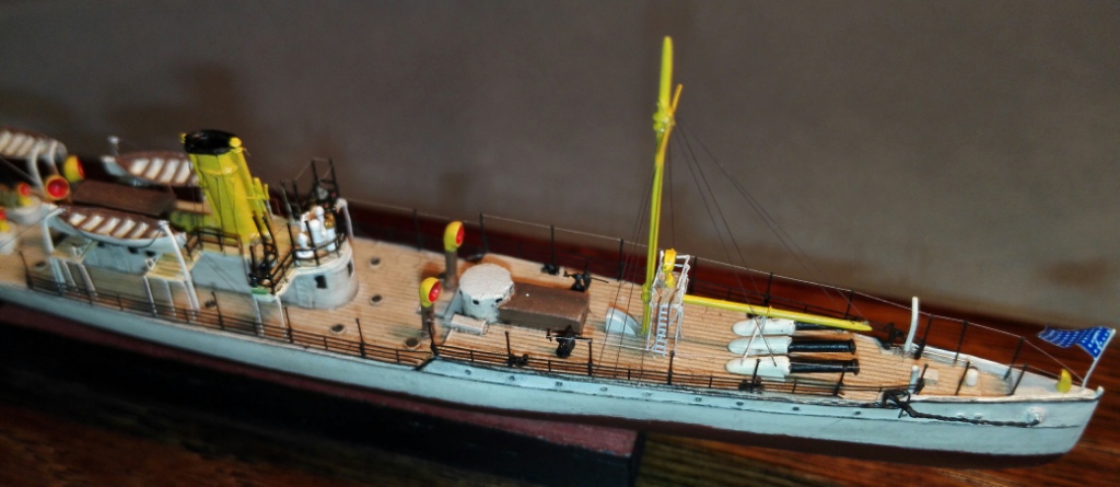 Эта модель мне досталась в подарок с целой кипой других изделий,но с условием собрать максимально хорошо. В исходнике был только корпус по ватерлинию,палуба надстройки,труба,дефлекторы,шлюпки и поведённые мачты и шлюпбалки. Так как я люблю делать полнокорпусные модели,то первым делом сделал подводную часть по фотографиям картонной модели от Бумажного Моделирования (если не ошибаюсь). Были сделаны валы и гребные винты с рулем. На бортах установил по фотографиям иллюминаторы,сделал шлюпбалки и подпорки под крылья мостика. Из проволоки выточил мачты. Сделал площадку носового прожектора и сам носовой прожектор,якоря и три пушки Гочкиса.