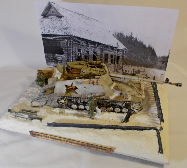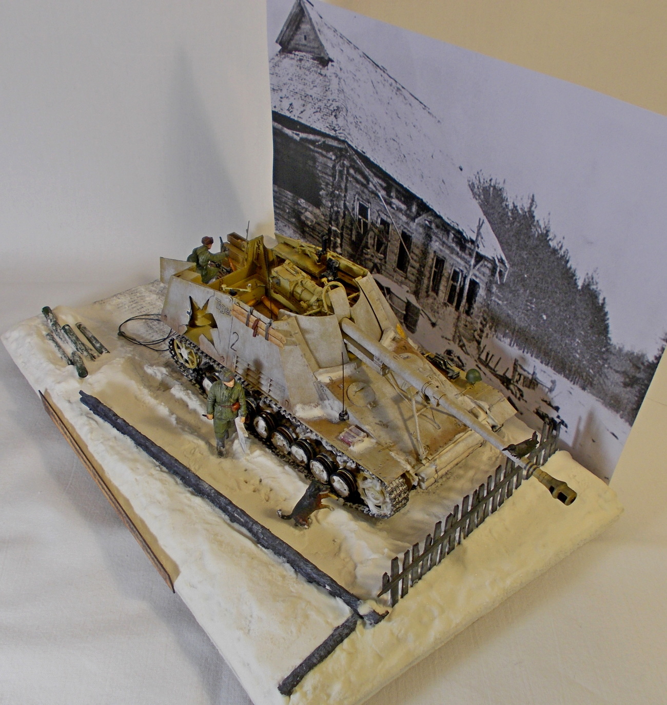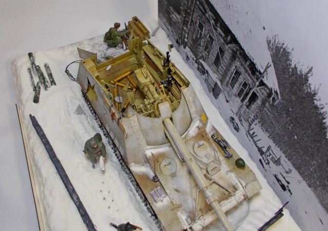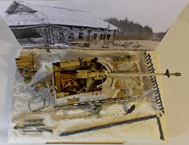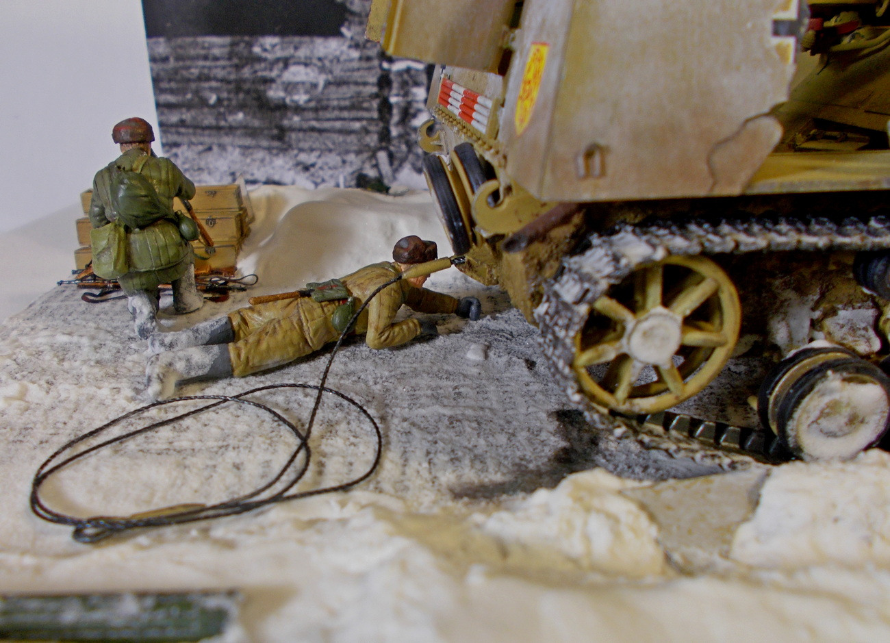 Смотрел работу с интересом еще на стадии "сказка о стройке". Я 35 масштабом не занимаюсь, но диорамы люблю любые. Мне работа понравилась. Я не большой специалист в нюансах. А смотрю как обычный посетитель музея. Насколько я понимаю снаряд как раз и прошел на вылет (левый нижний угол машины тоже разбит). про следы собаки - точно могу сказать что цепочку она оставляет когда бежит, а если как тут прыгает за вороной и рядом хозяин то следов вообще будет куча в любой конфигурации.