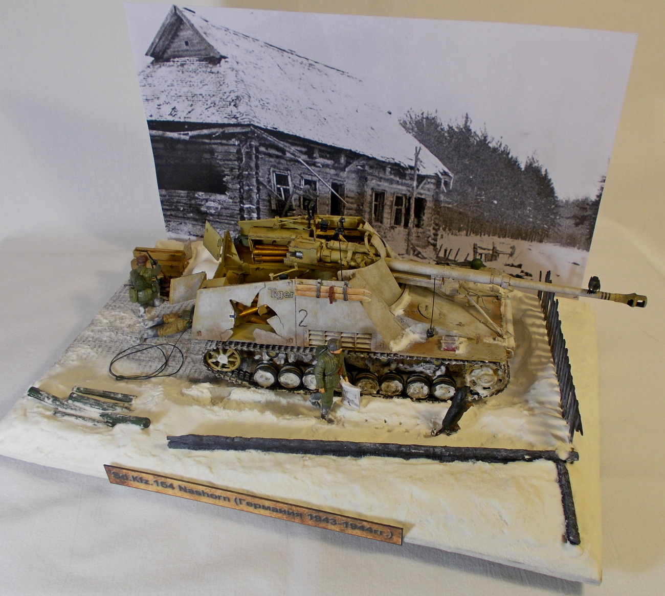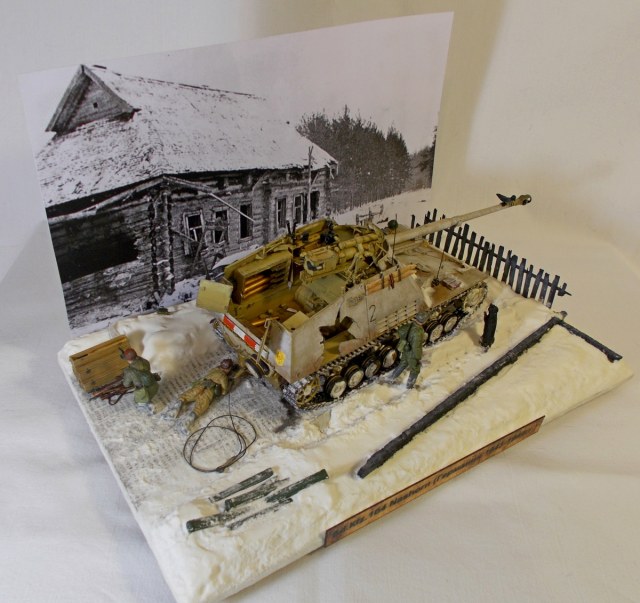Основной сюжет диорамы - советская трофейная команда осматривает подбитый Nashorn после боя и собирает брошенное и трофейное оружие с поля боя.