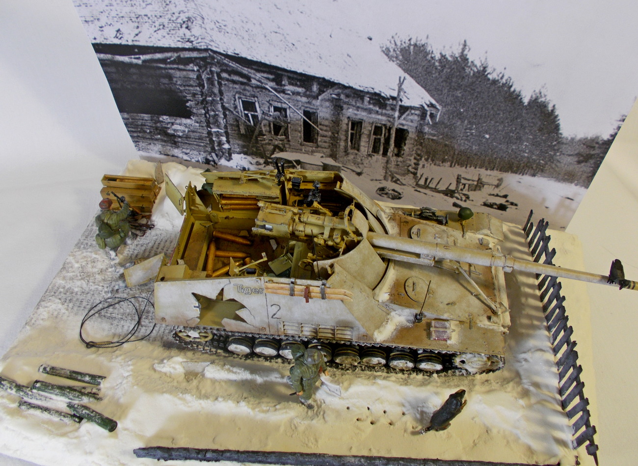 Самоход в снегу, а рубка и снаряды чистые, как будто их протерли перед приходом трофейщиков. Под самим самоходом и между гусениц снега надо было сделать больше. Вряд ли он бы долго простоял без маскировки за одним только забором. А если снега полно по сторонам, то должно быть полно и под ним или на нем и внутри.