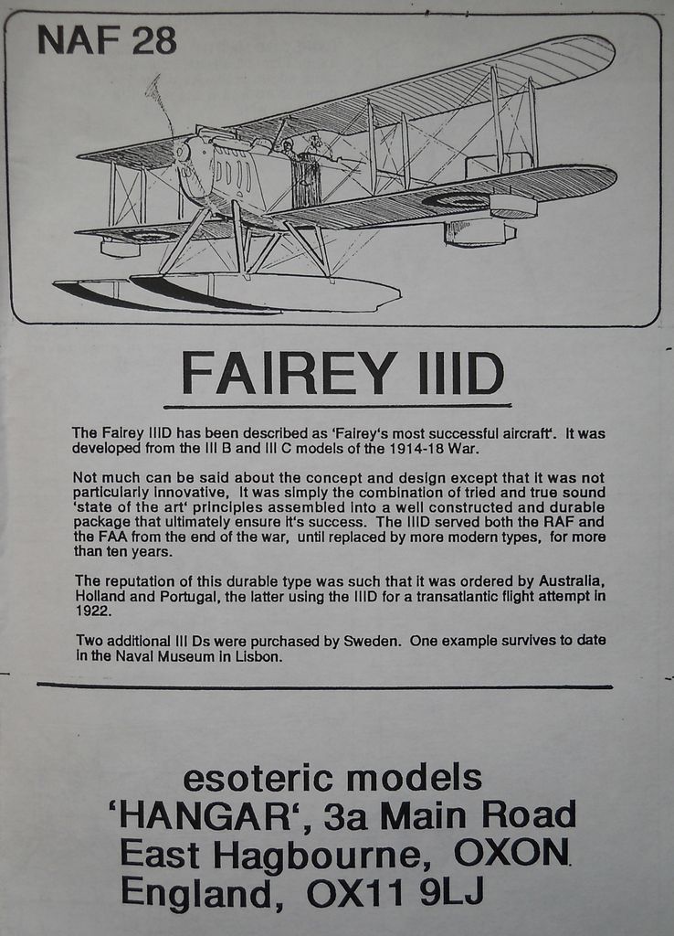 Вакуумформованная модель от фирмы Esoteric Models упакована в картонную коробку с верхним открытием. Масштаб 1/72 (номер по каталогу NAF-28). Основные детали отформованы на одном листе пластика с весьма неплохой проработкой. В наборе присутствуют деталировка из белого металла и профили из пластика. Профили недостаточно жёсткие и потребуют замены. Козырьки кабины предполагается изготовить самостоятельно. В набор заложена возможность сделать модификацию Fairey III D на выбор в колёсном или поплавковом варианте. Декаль на пять вариантов самолёта. Инструкция по сборке дана на «удовлетворительно» и отличается малой информативностью.