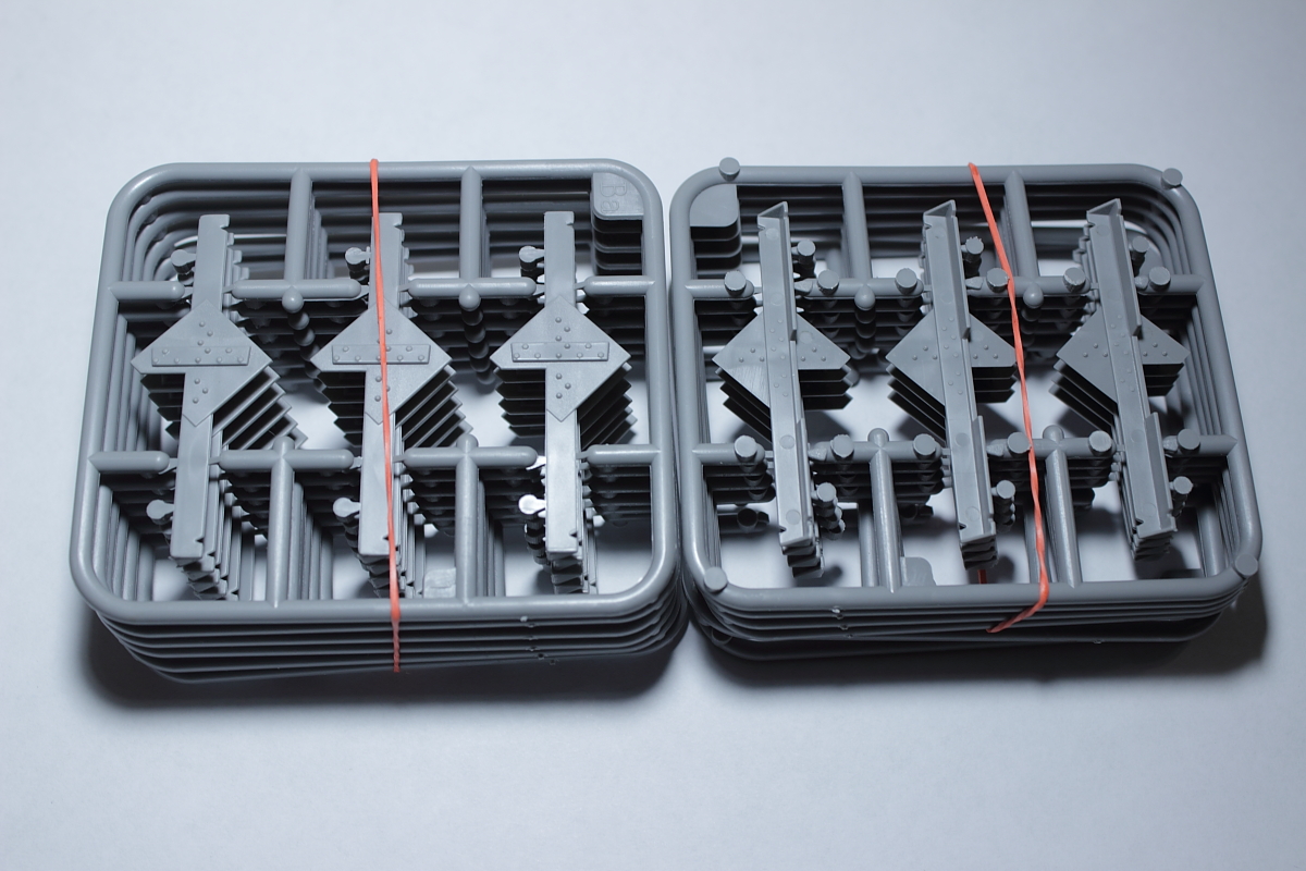 В коробке находятся литники обвязанные резинкой и упакованы в прозрачную пленку.В наборе 36 деталей из которых можно собрать 12 противотанковых ежей, пластик гибкий, серого цвета.