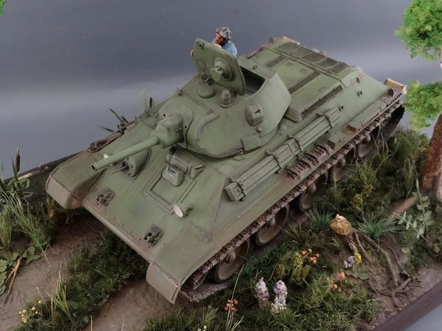 Зрелищная работа. Очень интересно сделана растительность - живо и естественно. Танк очень понравился. У меня почему-то никак не удаётся попасть в такой цвет. Изначально всё нормально, а когда начинаю фильтровать, смывать - всё меняется не пойми к чему. А здесь всё любо-дорого. С уважением!