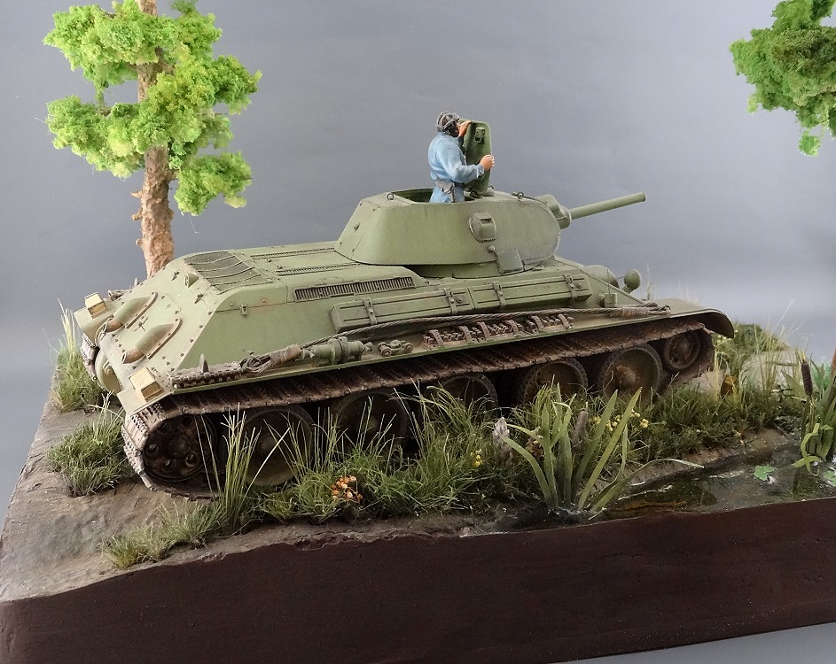 Танк, танкист, трава, земля и вода, деревья - не самое простое сочетание, но смотрится живо и красиво.