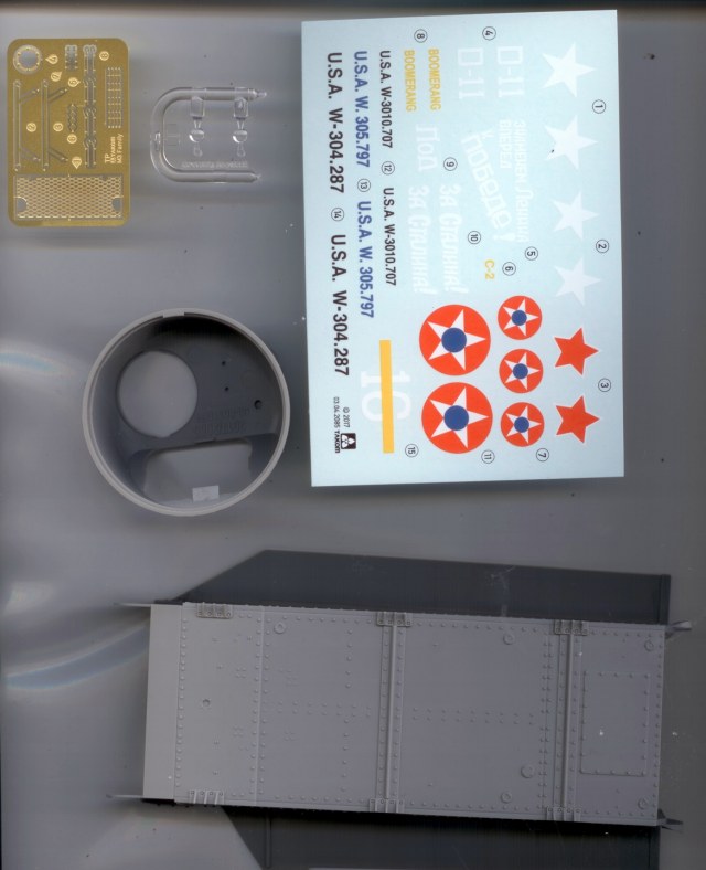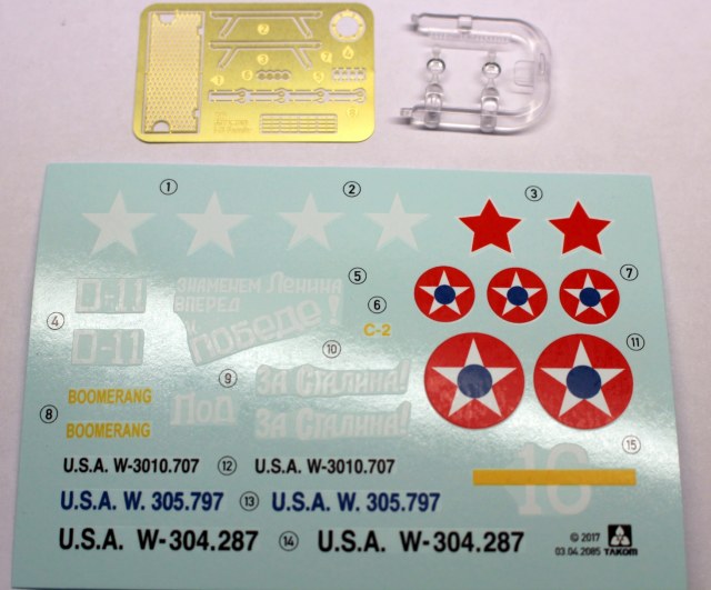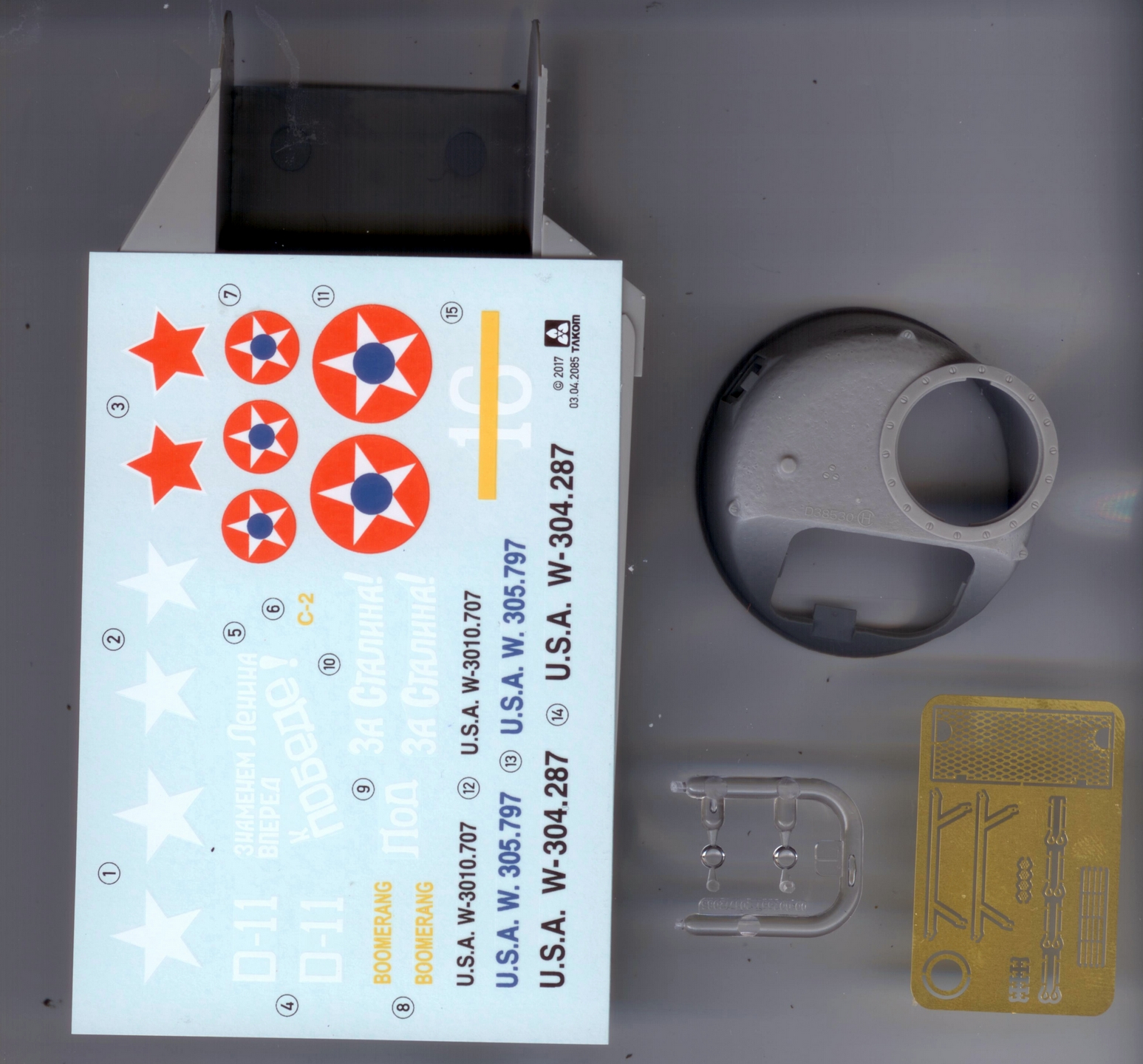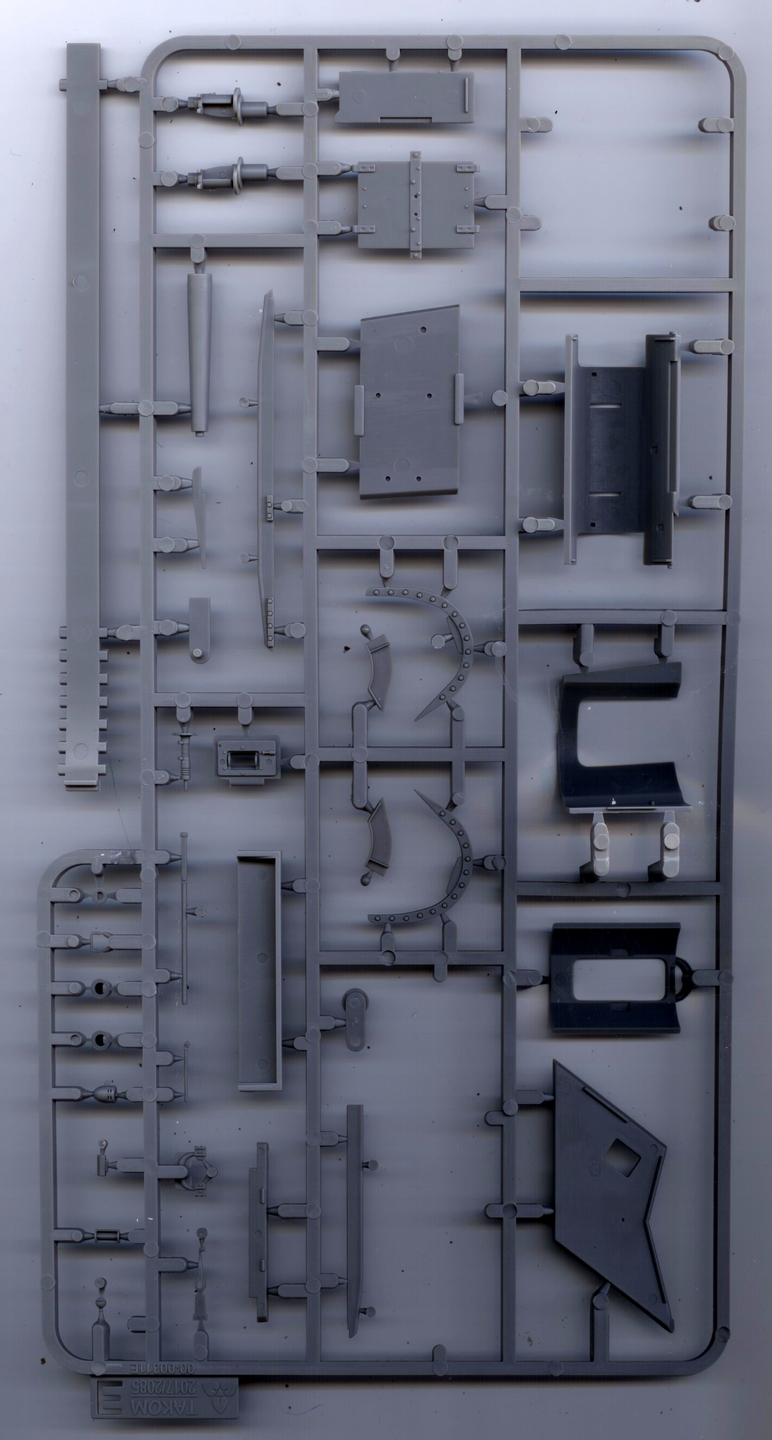 Внутри литников не так уж и много, инструкция маленькая книжечка, платка травления, стекляшка с линзами фар, добротная декаль.