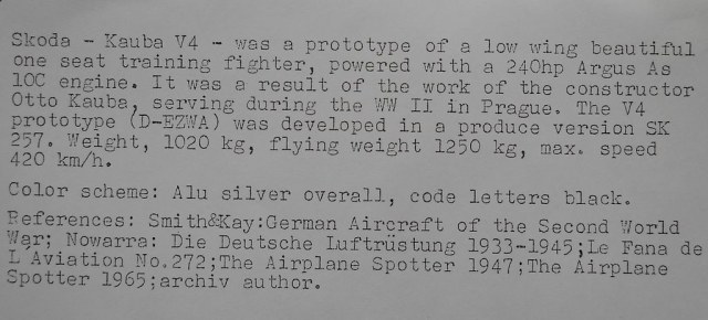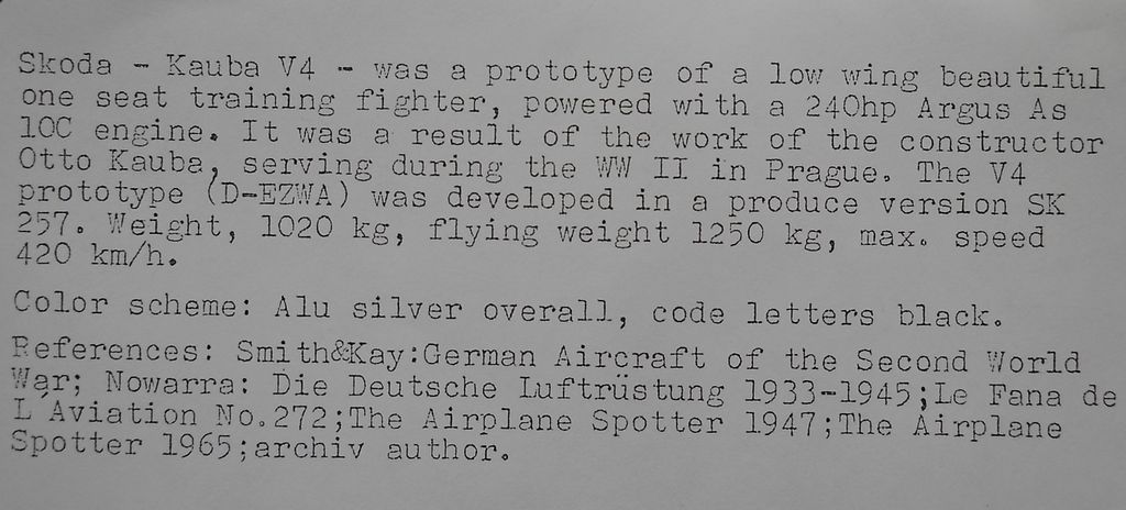 Учебно-тренировочный самолет Skoda-Kauba V4 был создан в 1943 году. В 1944 году было построено четыре опытных образца учебного истребителя SK.257. В серию машина не пошла.