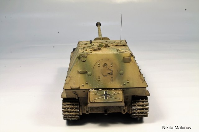 Ящик, тот что сзади на Фердинанды уже не ставился, нет креплений для запасных траков, проводки к фарам тоже нет (во всяком случае из тех фото, что есть не видно). Крепление для задней антенны можно было б высверлить. Ввод основной антенны резиновый, д.б. черный.