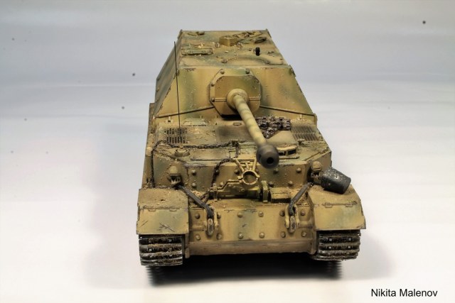 С землёй на мой взгляд перебор и сколы тоже не очень хорошо получились. Однородно как-то, симметрично. Куда делся конвойный фонарь??? Ну, а про ящик ЗИП сзади уже говорили. Его на корму, насколько я помню, экипаж на некоторых машинах переносил самостоятельно уже после боёв на Курской дуге. Обмотка буксировочных тросов не очень правильная. Замечания коллег выше имеют все основания.