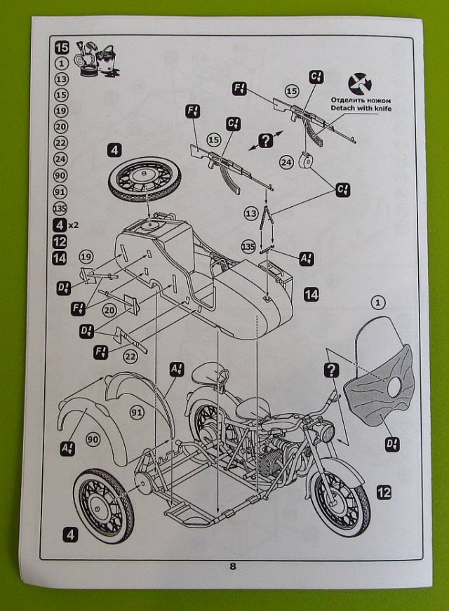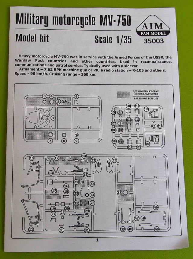 Модель этого замечательного мотоцикла выпустила украинская фирма Aim Fan model. В коробке из плотного картона, с боковой загрузкой, находятся пять литниковых рамок обычного пластика, одна прозрачного, платка фототравления и инструкция. Инструкция на двух листах формата А4, сложенных в миниброшурку содержит предельно краткую историческую справку на английском языке, схемы литников с номерами деталей и хорошие, наглядные схемы этапов сборки с указаниями по окраске отдельных деталей. Качество литья, для ЛНД, весьма неплохое, хотя до последних моделей АСЕ недотягивает: присутствует некоторая замыленность, особенно заметная на цилиндрах двигателя, облоя немного, но есть. Пластик хрупковат: обе половинки рамы в моём наборе оказались надломаны. В наборе довольно много "лишних" деталей: две пары глушителей, передняя крышка блока двигателя, головки цилиндров, комплект "шин и т.д.. Кстати о шинах, они отлиты из обычного полистирола, рисунок протектора присутствует, но настолько "нежный", что практически гарантированно погибнет под слоем грунта и краски. Спицы колёс даны фототравлением. Вооружение мотоцикла составляют два АКМ и РПК к которому, опционально, предусмотрен барабанный магазин. На литнике имеется ещё и ПК, но он помечен как неиспользуемая деталь. На прозрачном литнике, помимо стекла для фары и самой фары, имеется ветровое стекло с имитацией брезентового фартука. Декали в наборе, к сожалению, нет, так что номера или тактические знаки придётся изготавливать самостоятельно.