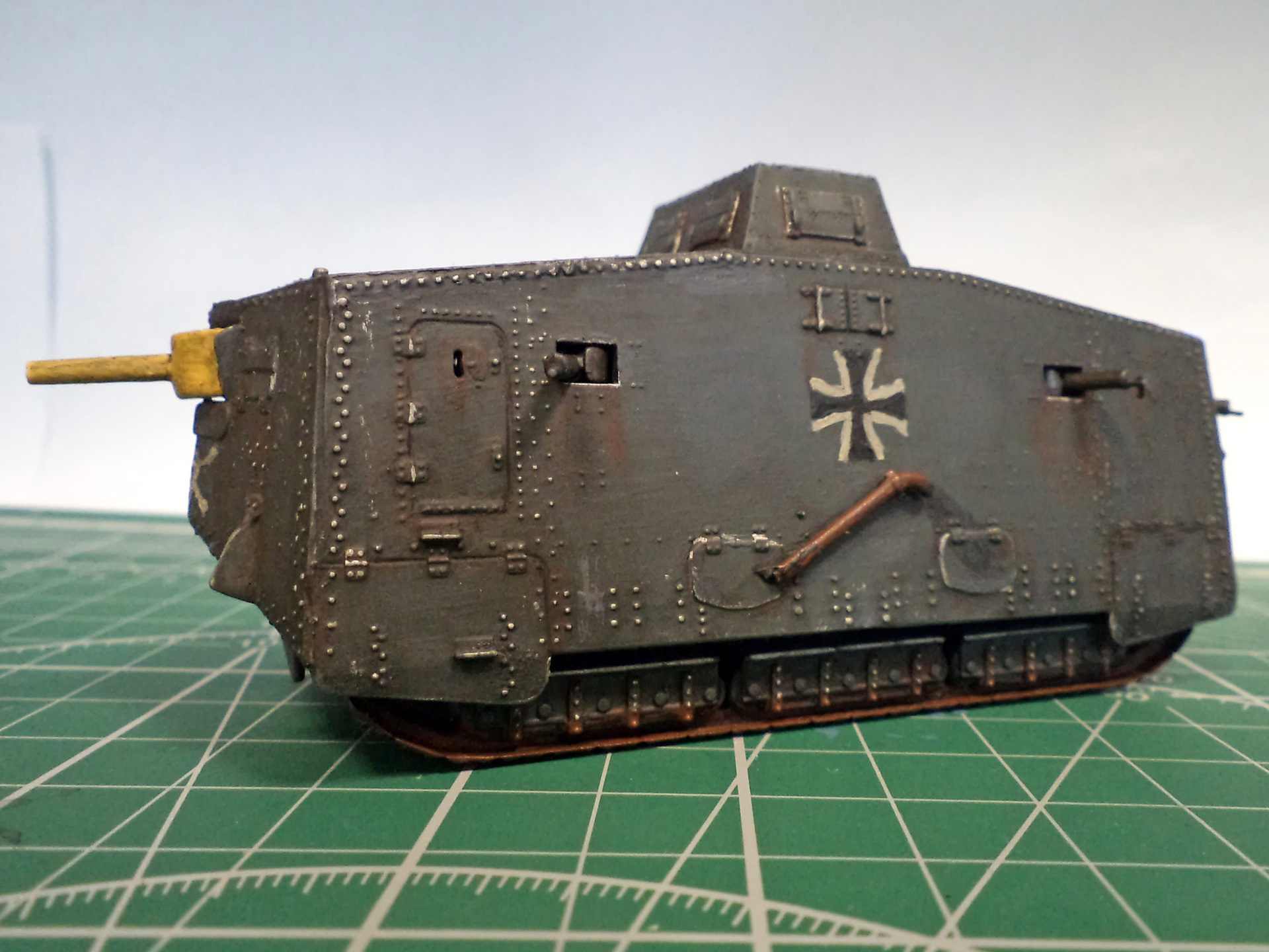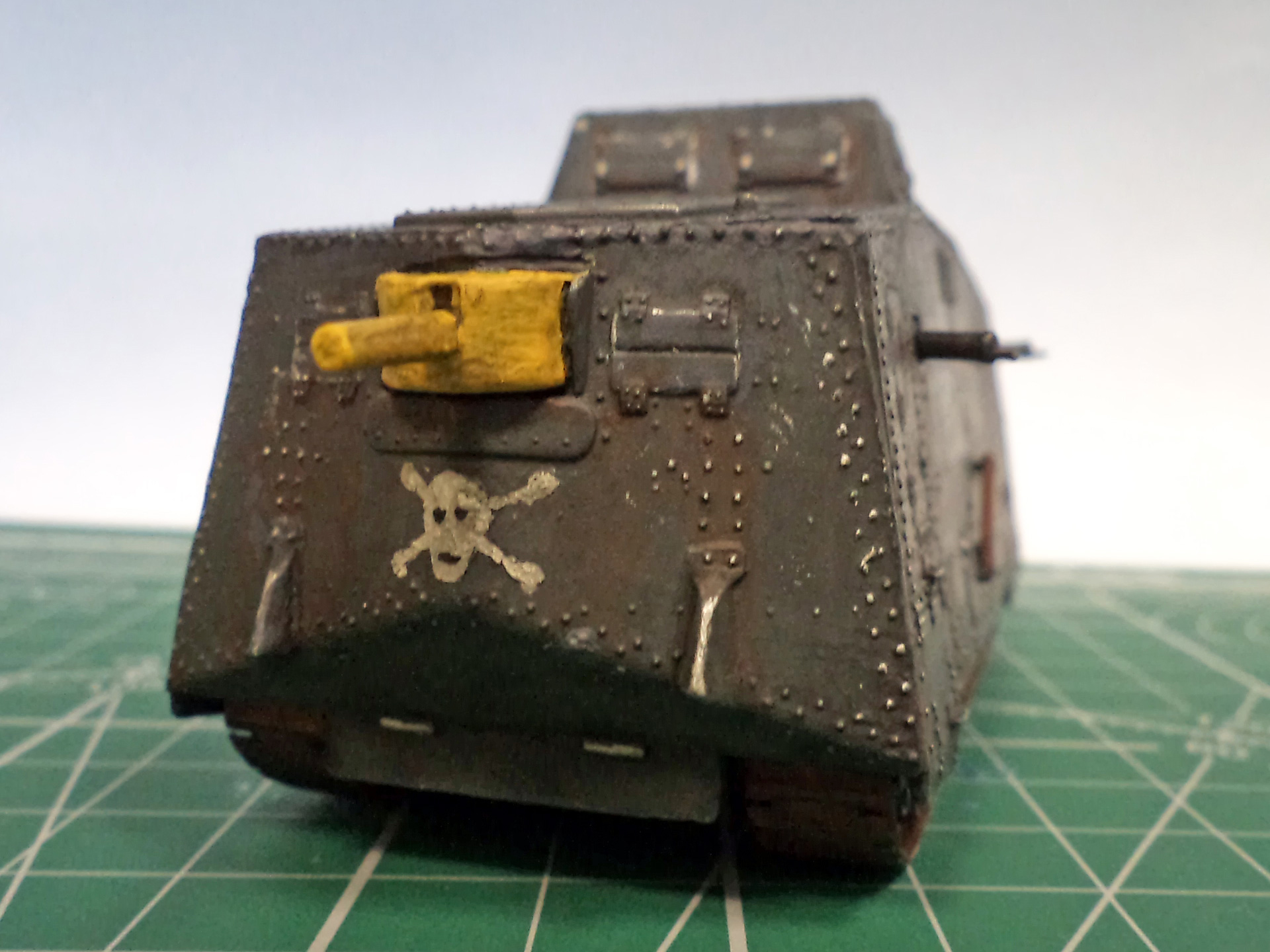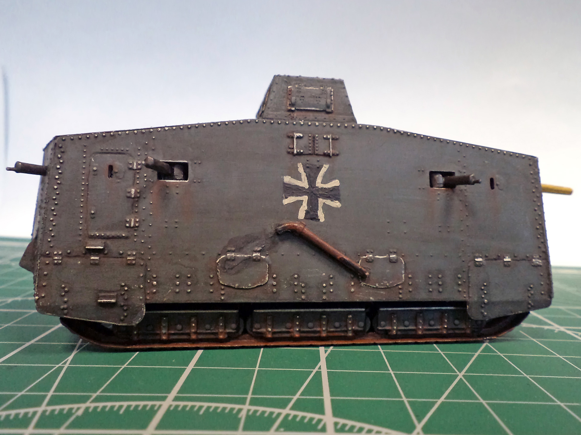 Я не уверен, не помню уже сейчас, но кажется там и правда была большая проблема со стыкуемостью деталей корпуса. Все хочу еще один такой - и собрать заново, уже нормально. Стыки корпуса проработать, амбразуру и щит тумбовой пушки нормально сделать, и задуть из аэрографа, вместо такого заливания краской. Там уж главное будет - клепку не спилить в процессе стыковки корпуса.