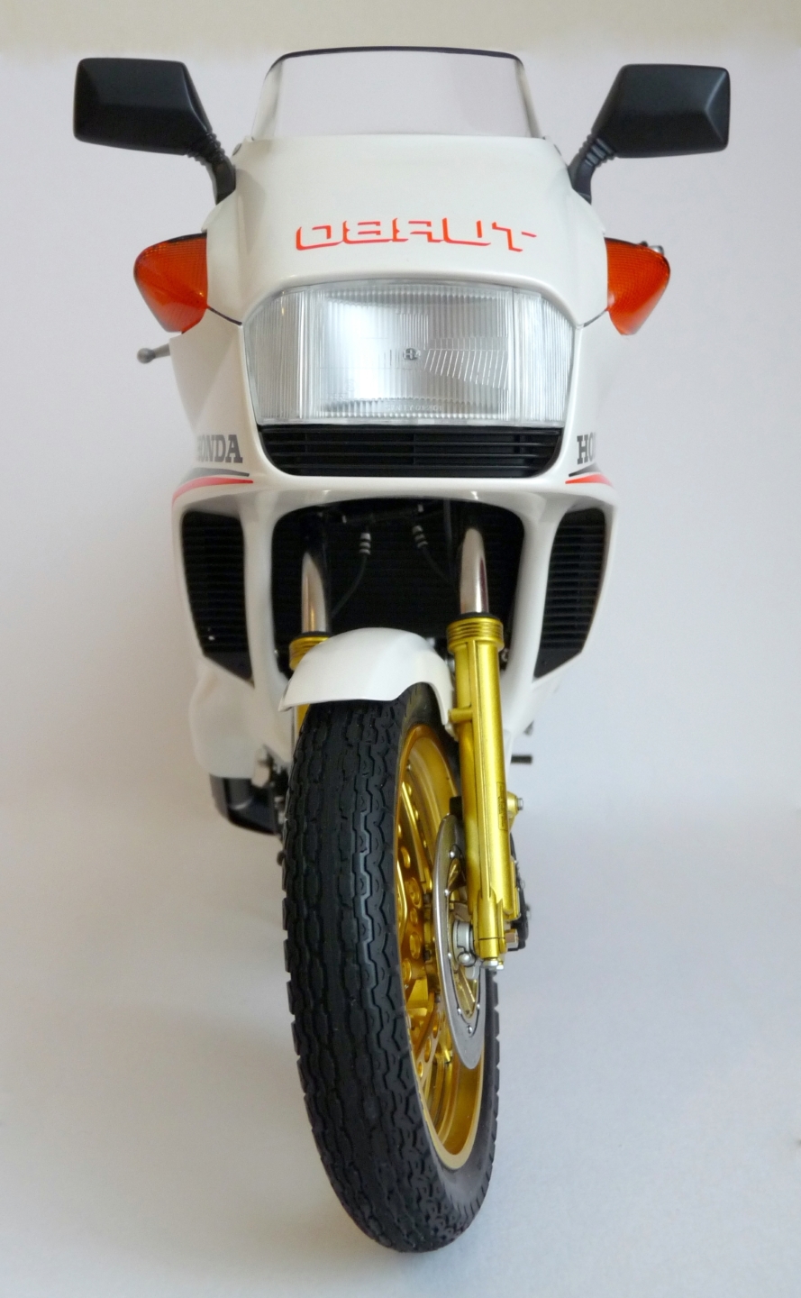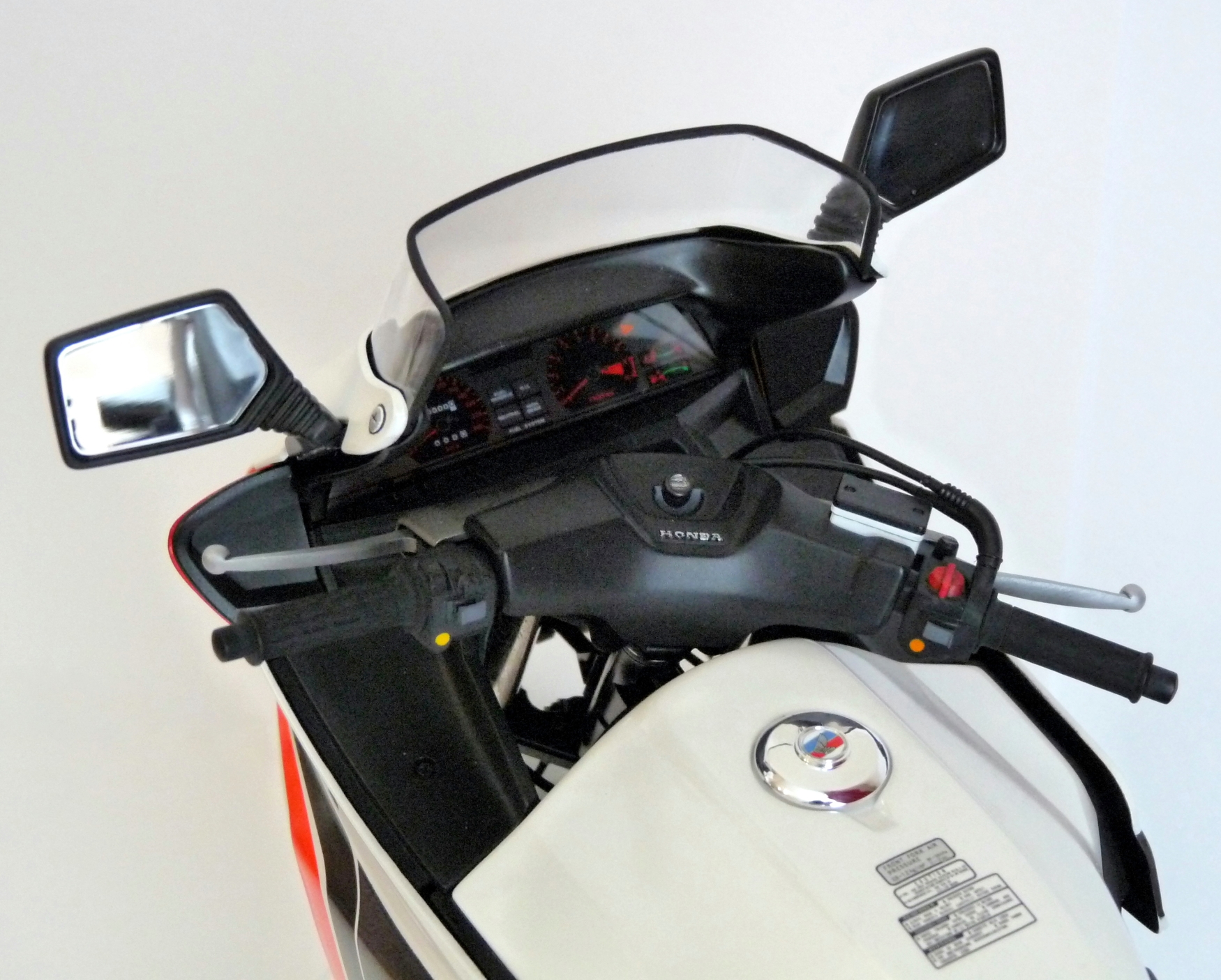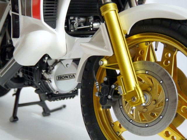 Модель довольно старая. Представляет серию моделей мотоциклов в масштабе 1/6. При работе над ней меня ждало достаточно много неприятных сюрпризов. Особенно не понравилась стыкуемость деталей двигателя. До текущего качества присущего моделям фирмы Tamiya мягко говоря "не дотягивает". Ложку дёгтя в работу подкинули декали. С маленькими по площади проблем не возникает, а вот с большими беда! Они выполнены на такой толстой подложке, что нанести их на криволинейные поверхности без складок и разрывов невозможно. Промучавшись с ними пару дней было принято решения вместо декалей произвести окраску по трафаретам. Краску подбирал на глаз и роде попал. В работе использовалась рекомендованная в инструкции по сборке краска всё той же Tamiya. Модель собрана из коробки за исключением номерного знака и мелочёвки. Добавлены хомуты из самоклеяющейся фольги. Номерной знак, что идёт в наборе мне не понравился и был заменён на оставшийся от сборки другой модели. В данный момент данная модель уже снята с производства.