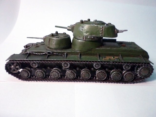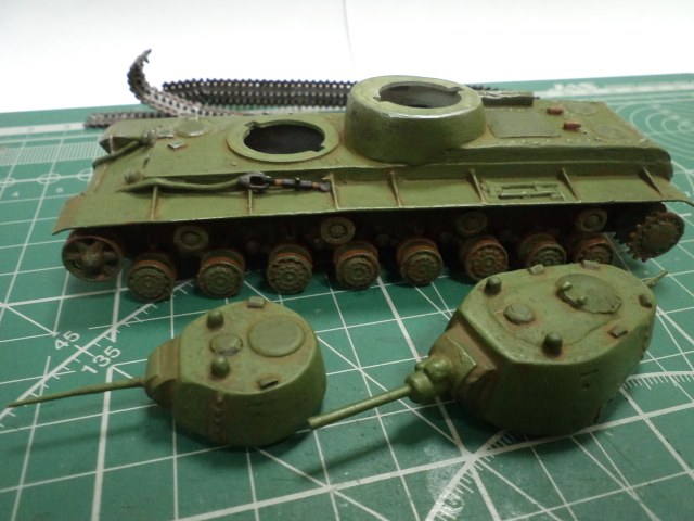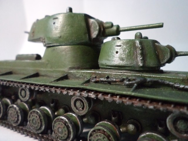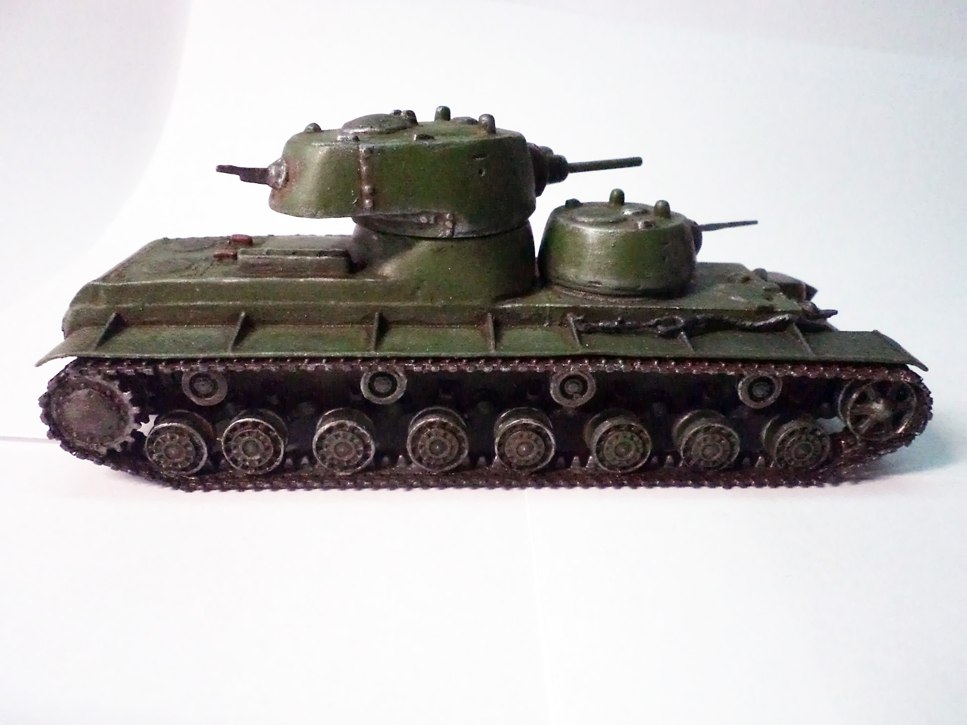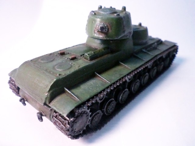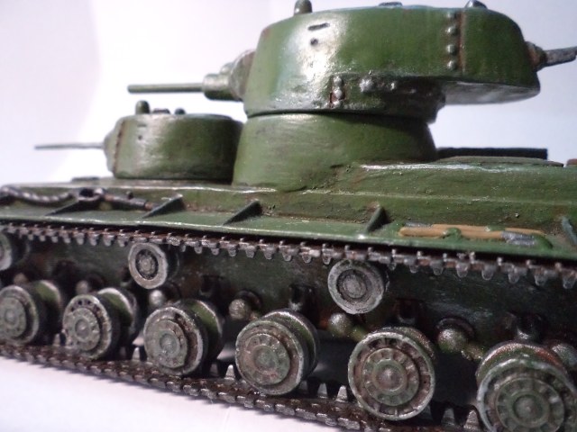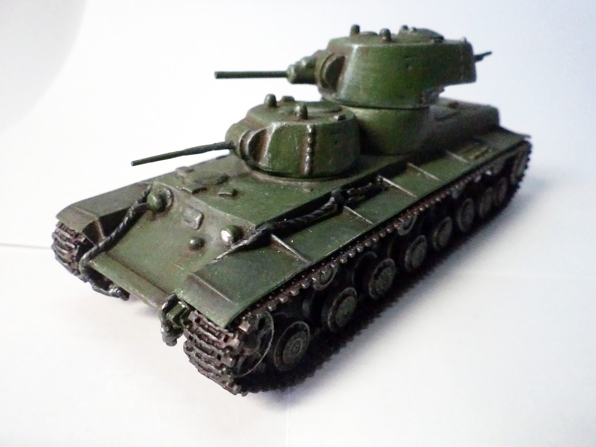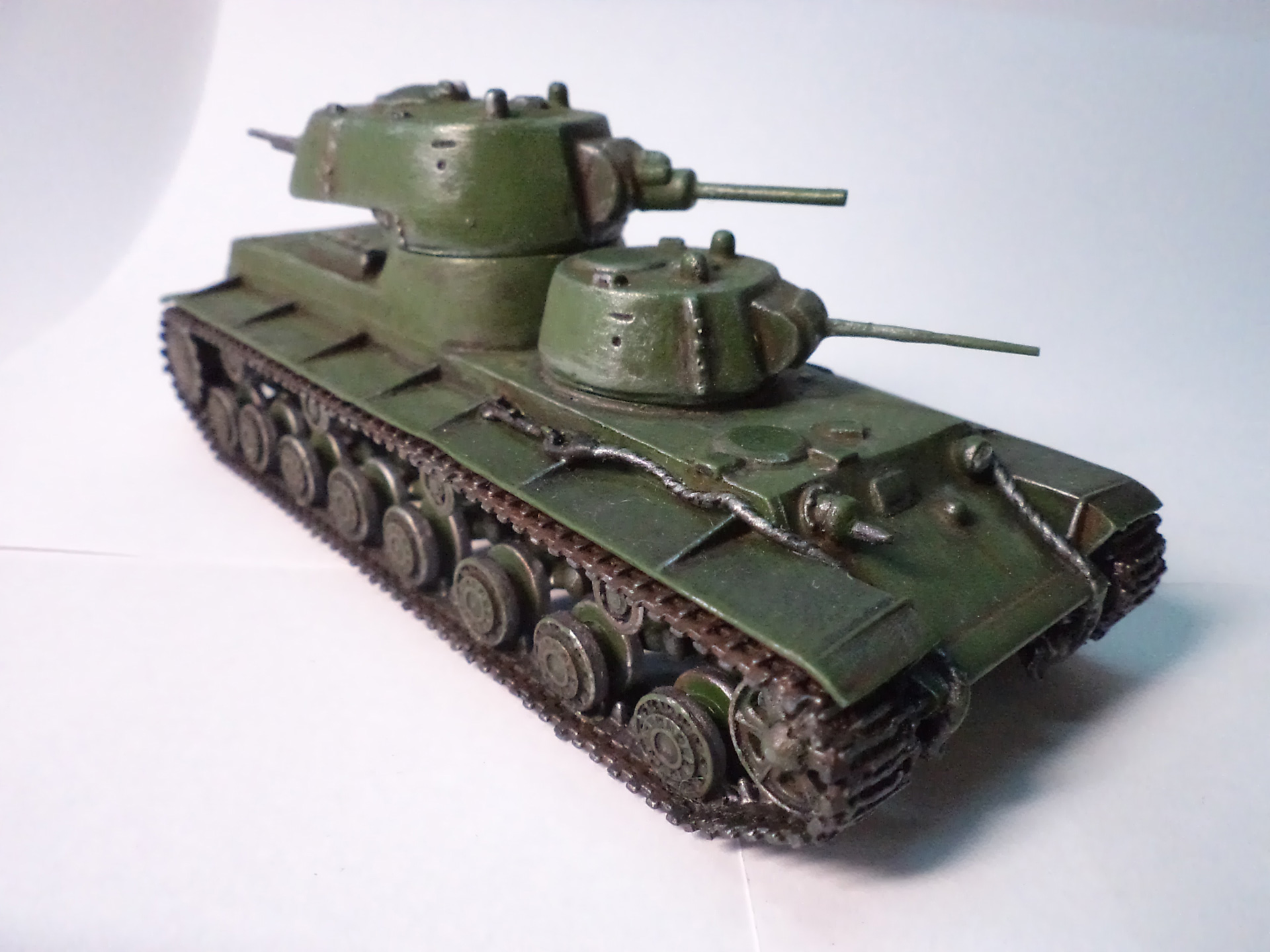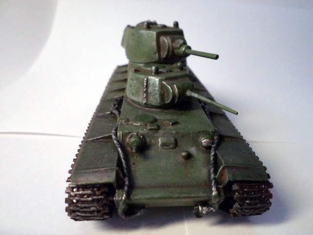 Танк собран из пары КВ от PST. Корпус-ходовая распилены и заново собраны. Верх корпуса был очень сильно доработан, корма сделана с нуля. Башни лепились из "эпоксилина" по чертежам, выведенным в масштаб 1/72. Красилось акрилом, кистью, ржавинг, загрязинг, металинг.