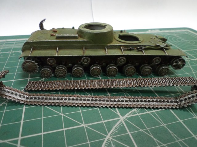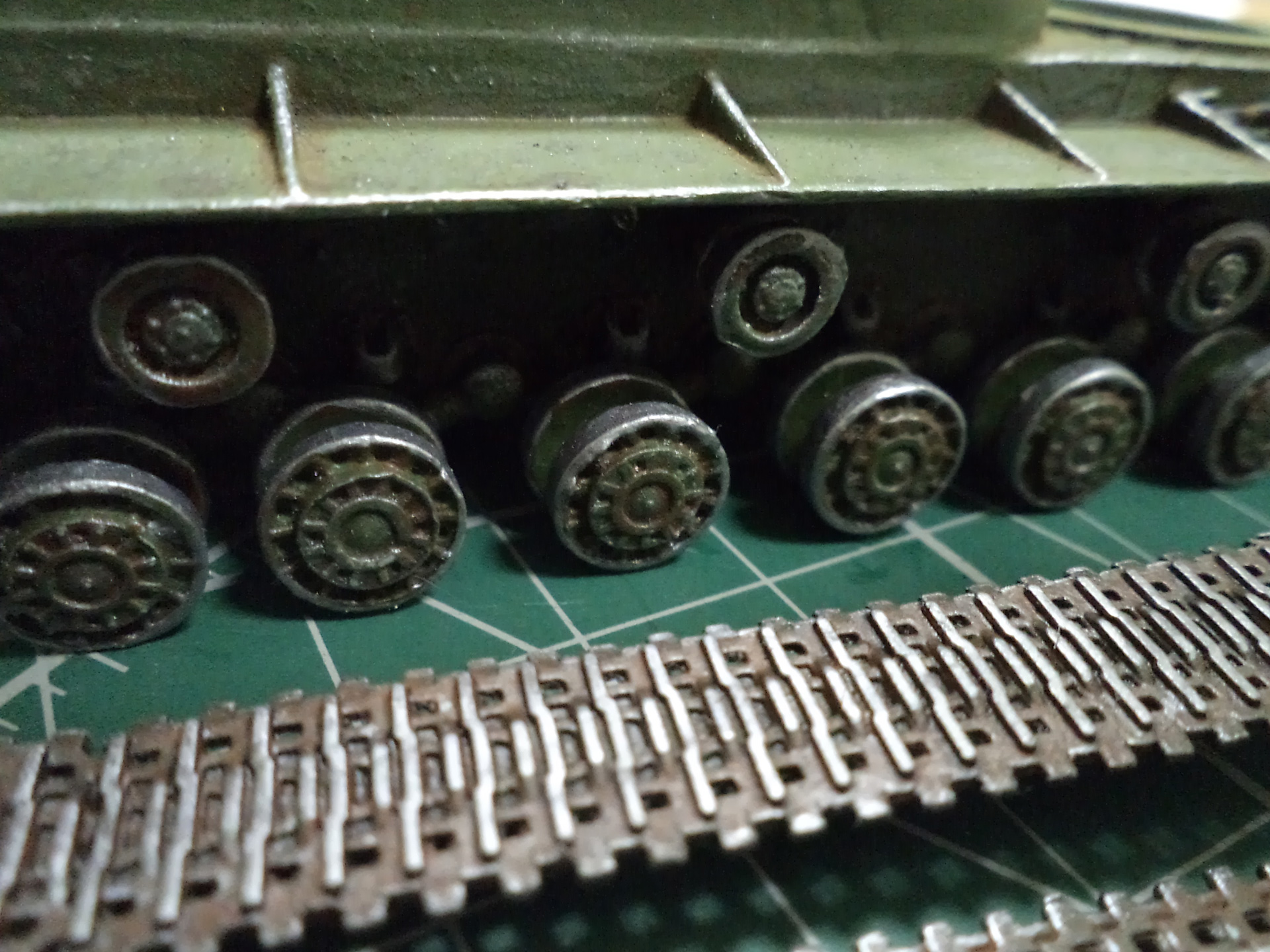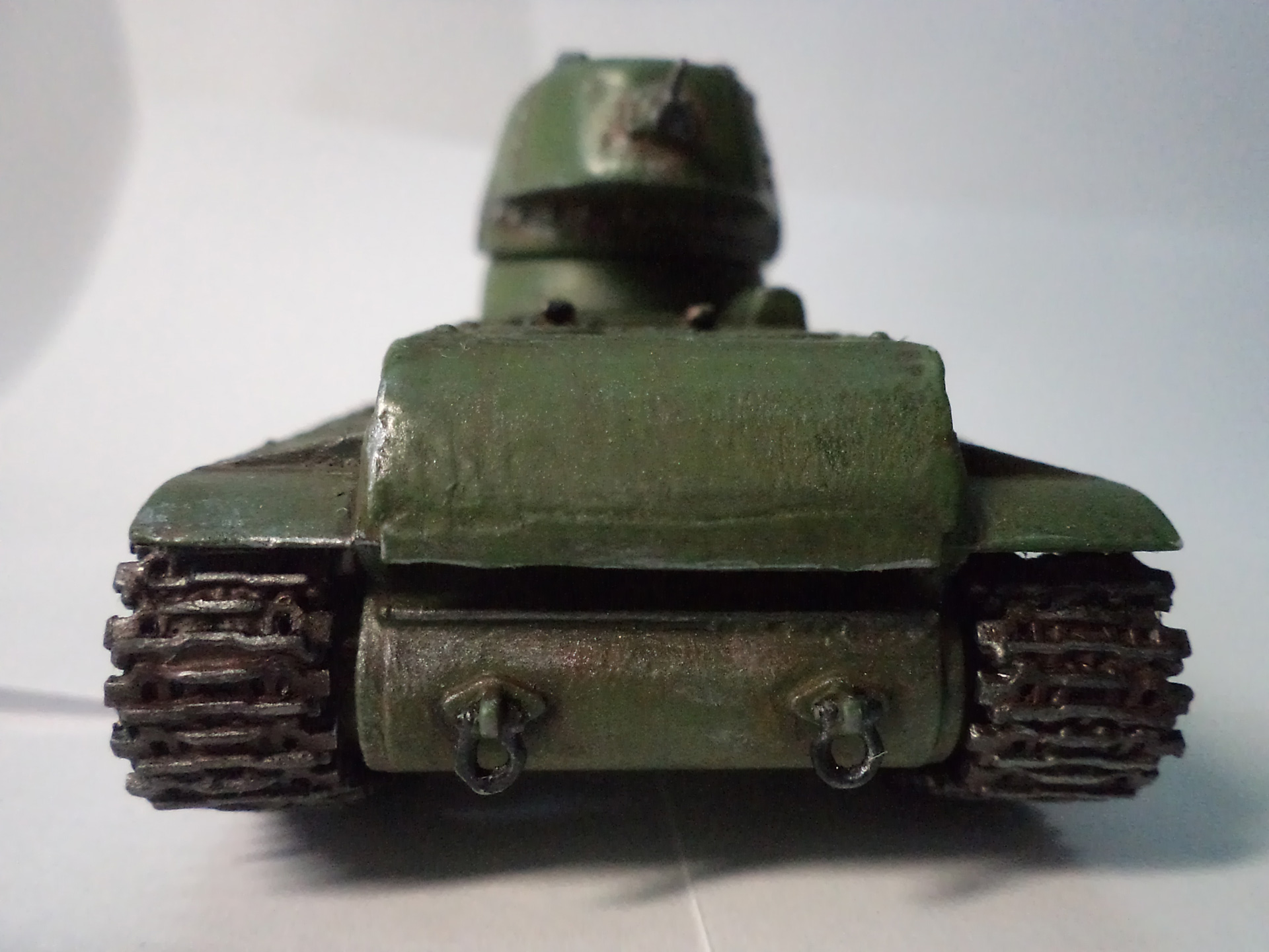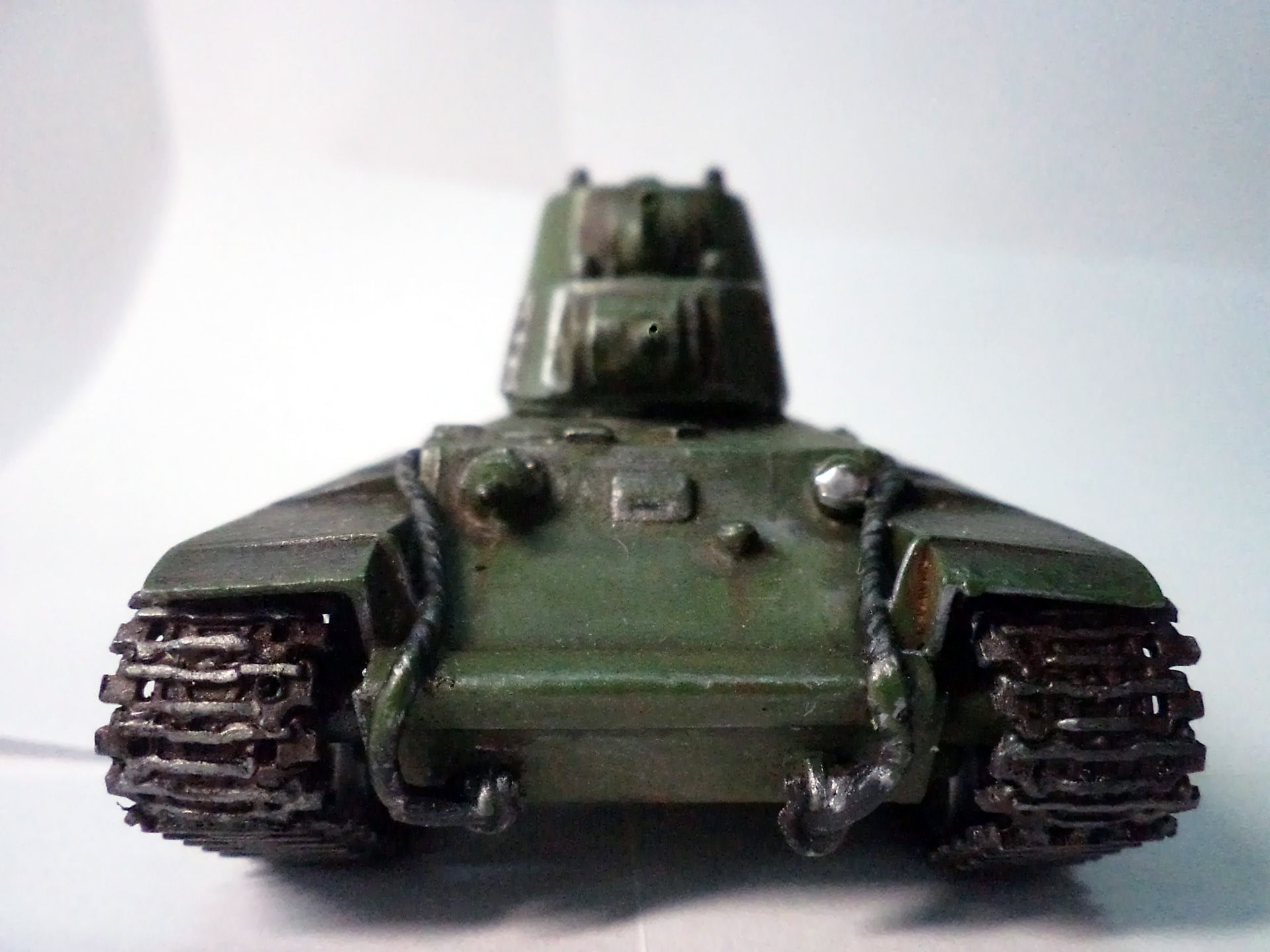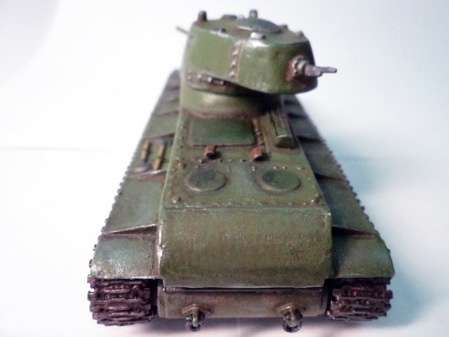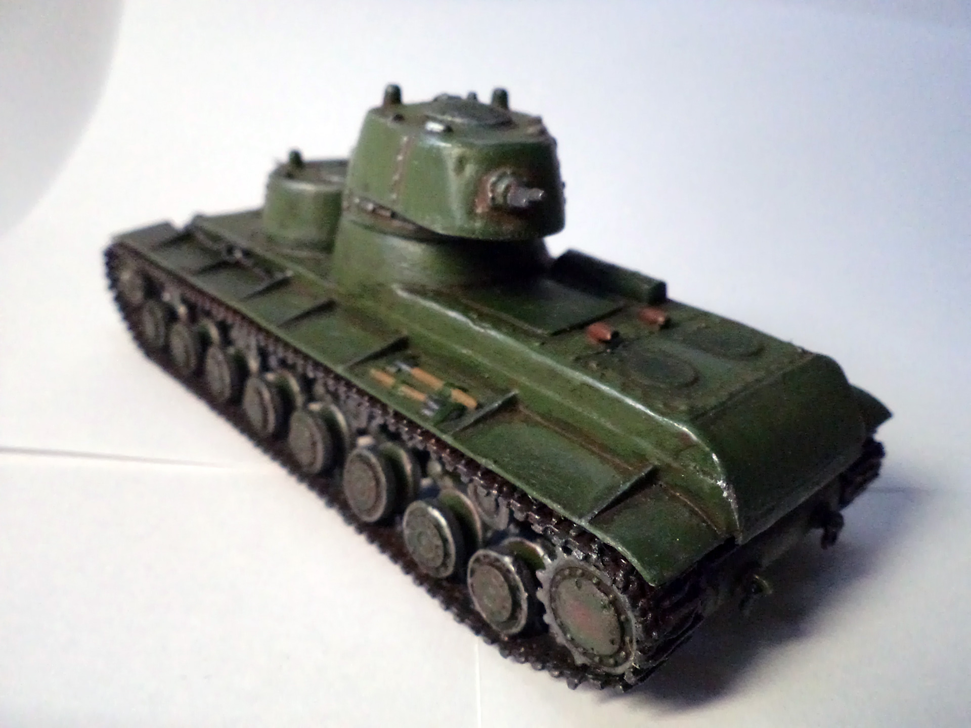 Танк собран из пары КВ от PST. Корпус-ходовая распилены и заново собраны. Верх корпуса был очень сильно доработан, корма сделана с нуля. Башни лепились из "эпоксилина" по чертежам, выведенным в масштаб 1/72. Красилось акрилом, кистью, ржавинг, загрязинг, металинг.