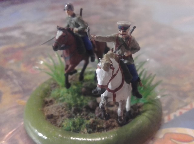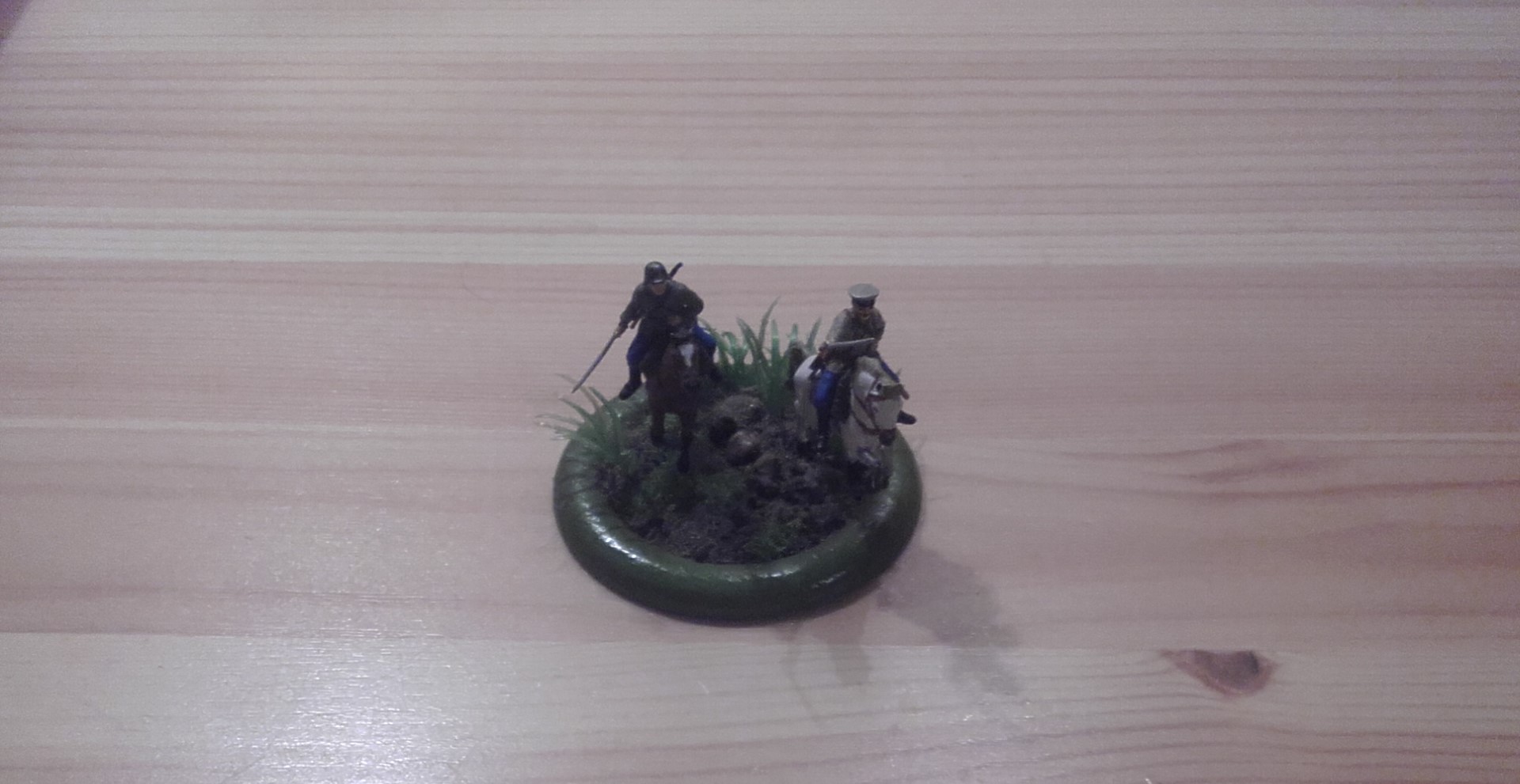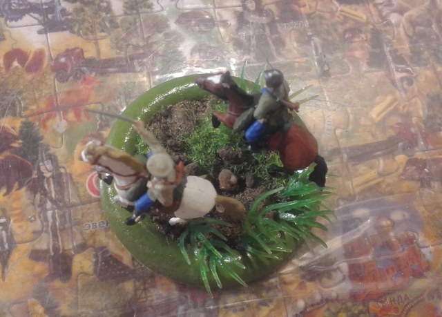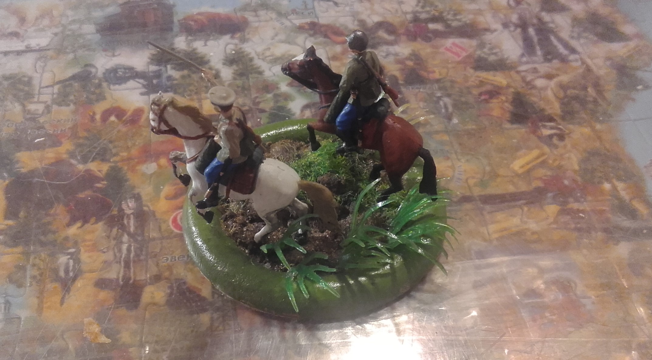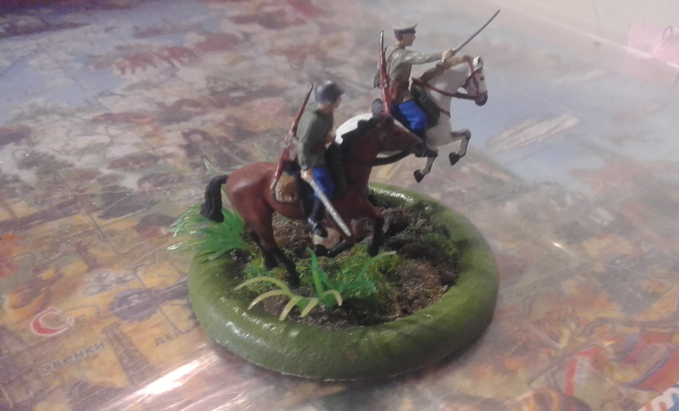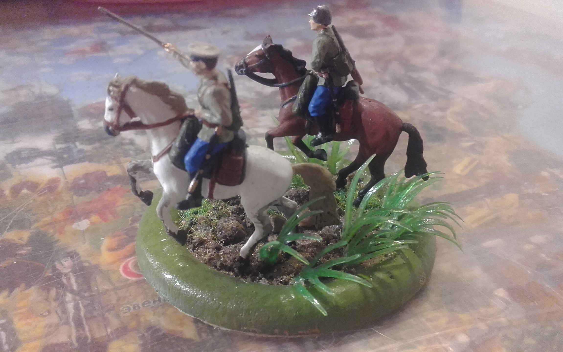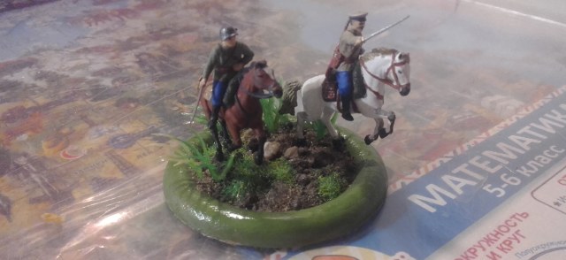 Доброго дня. Представляю Вашему вниманию первую выкладываемую мной модель - кавалеристы из широко известного набора Звезды, окрашенные акрилом от той же Звезды. Трава Das model и от искуственных водорослей из аквариума, на которых бликует лак. Но что может быть лучше, чем скакать на коне по травке после летнего дождя..