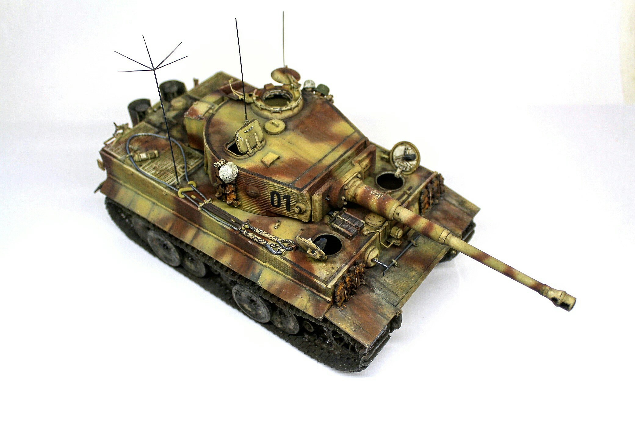 Всем доброго времени суток,представляю вашему вниманию мой крайний и на данный момент самый сложный проект: драконовский средний тигр с большущим набором вояджеровского травления,траками от Сектор35 и стволом от РБ-модел. Многое вышло не так, как задумывалось, но мне результат, в принципе,пришёлся по душе. Сама модель нарочно выполнена в таком ярком и контрастном стиле .( люблю яркие безделушки). Окрашивался танк полностью акрилами от пасифик88, тонировка производилась химией от АММО и АК. Прототип - собирательный образ штабной машины 504 ттб на весну 1944-Го. Танк планируется на небольшую подставку,поэтому грязью он вымазан обильно. По установке его на неё добавлю разной мелочи и мусора. Только глядя на фото понял,что забыл оттонировать деревянные части и убрать с троса S-образный крюк ( фиксировал трос до его окончательной приклейки) . Фоткал на тапок и ,к сожалению, всей "мокроты" ходовой изображение вообще не передаёт.
