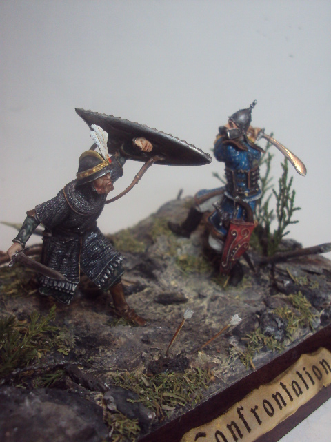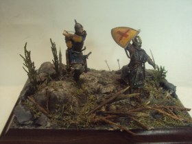 Это , видимо, битва в 732 между консулом Карлом Мартелем и войском Халифата? Вроде похоже, вот только как по мне ,если франк соответствует, то второй воин как то больше на монгола похож.