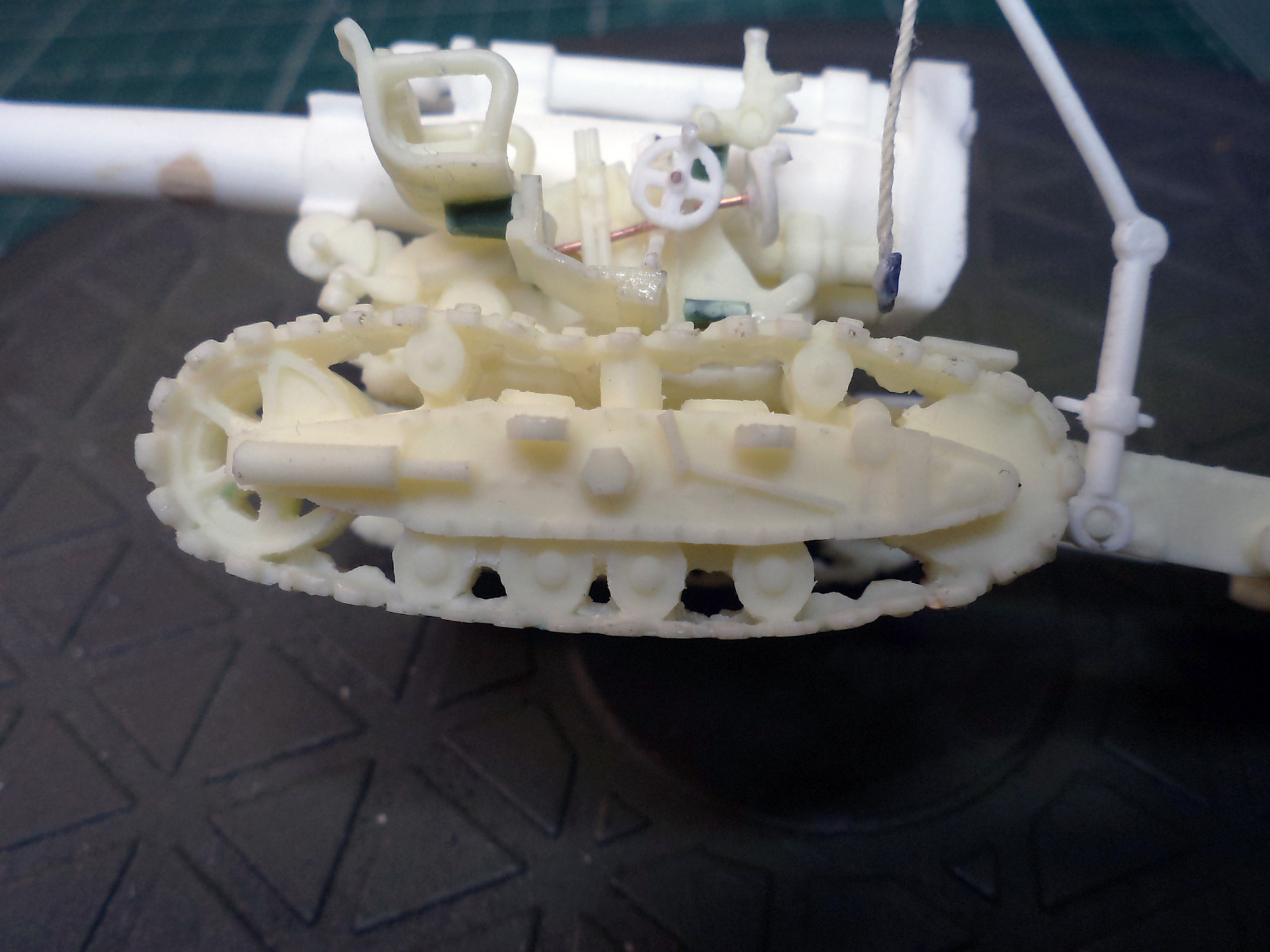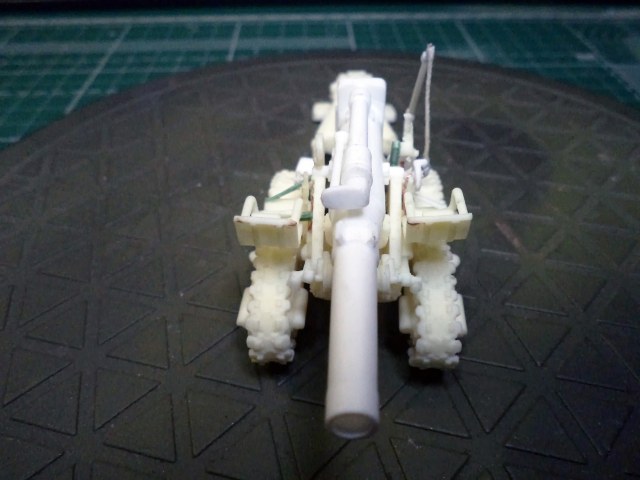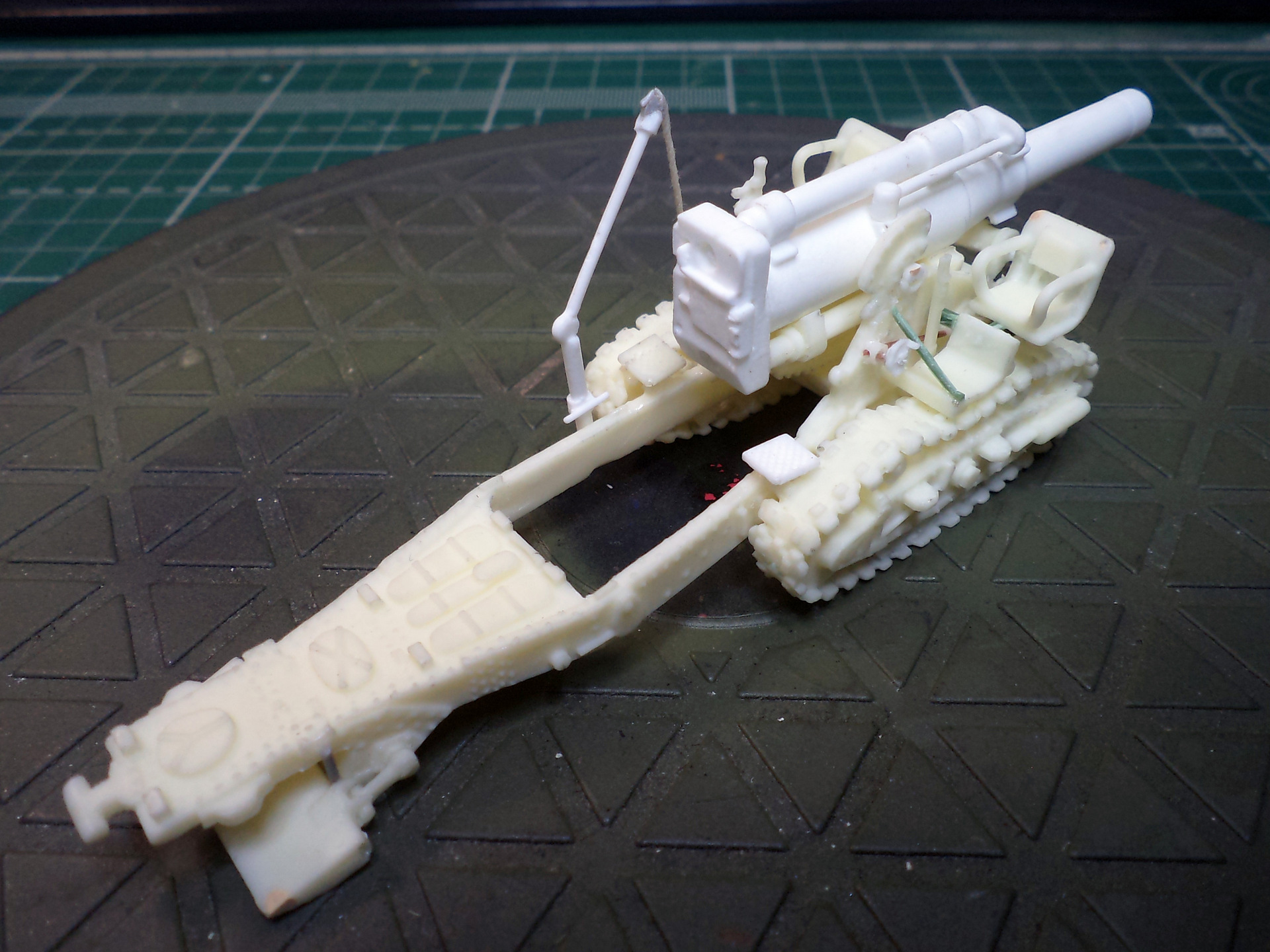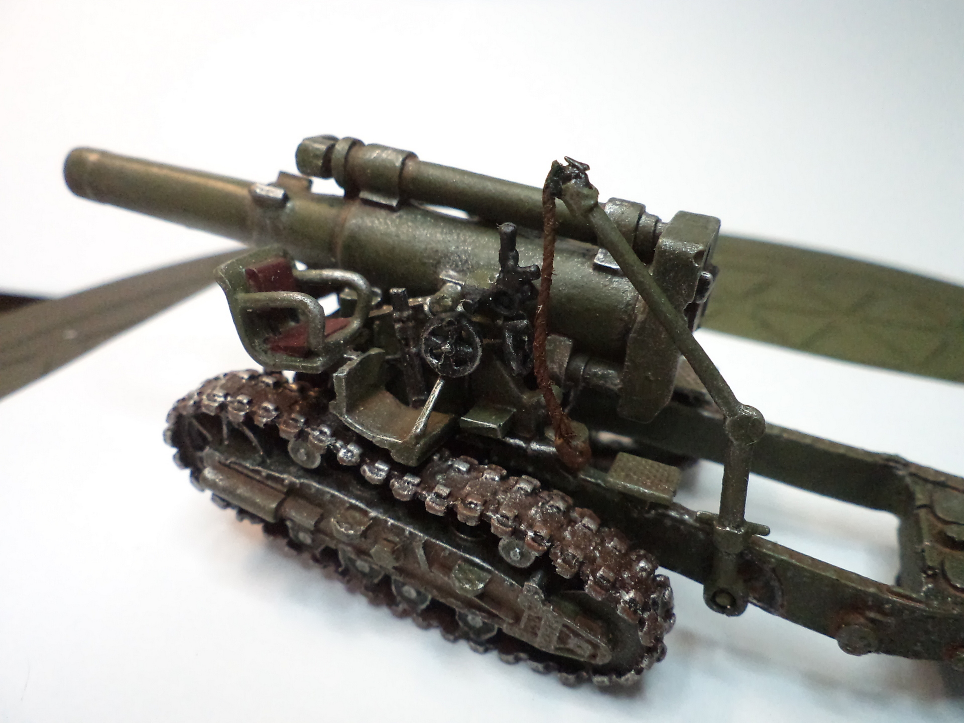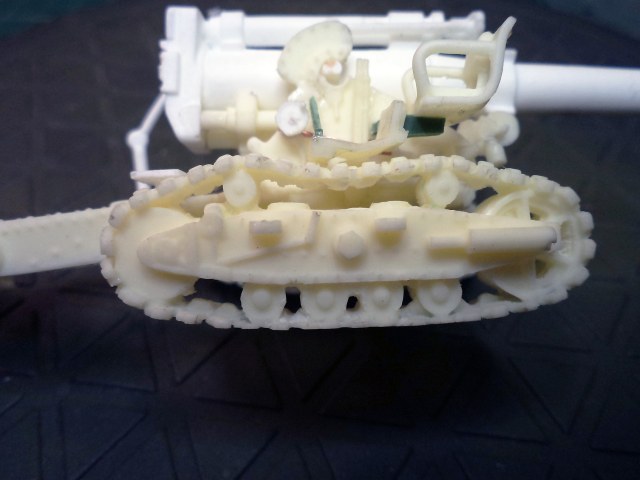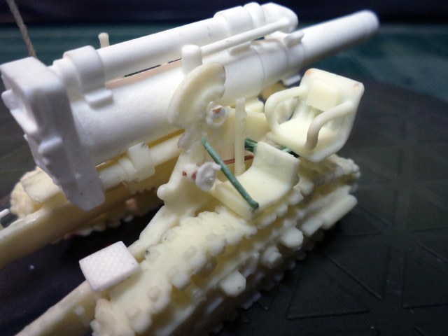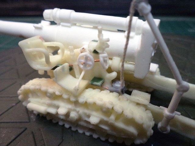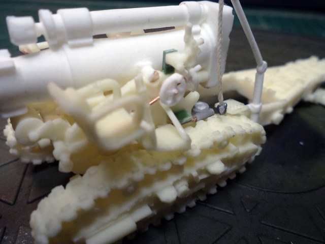 Смола колется - некоторые детали пришлось собирать из осколков. Кое-где пришлось вообще выпиливать детали с нуля - на модели их просто не было. Пару-тройк тяг, которые на модели были хреново пролиты вместе с лафетом, я сделал из проволоки. Трос и крюк на лебедке заряжания изготовлены отдельно. Выпиливать залитые смолой катки ходовой и центральный проем лафета - это было мучение. В качестве образца для всей мелочевки, вроде тяг, использовалась модель гаубицы Б-4 в масштабе 1/35 - пришлось купить и собрать эту здоровую дуру.