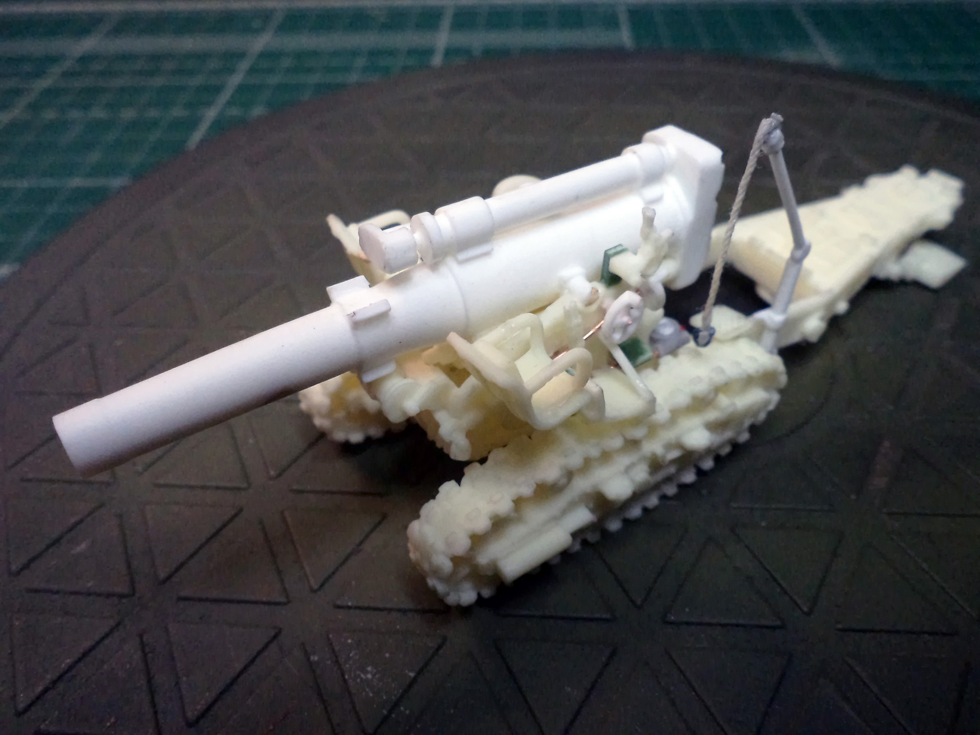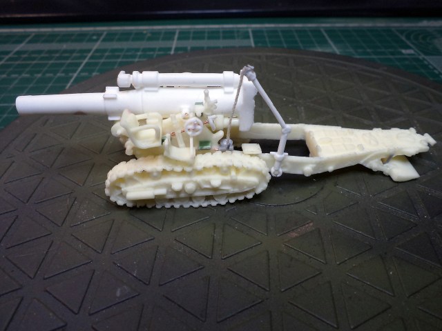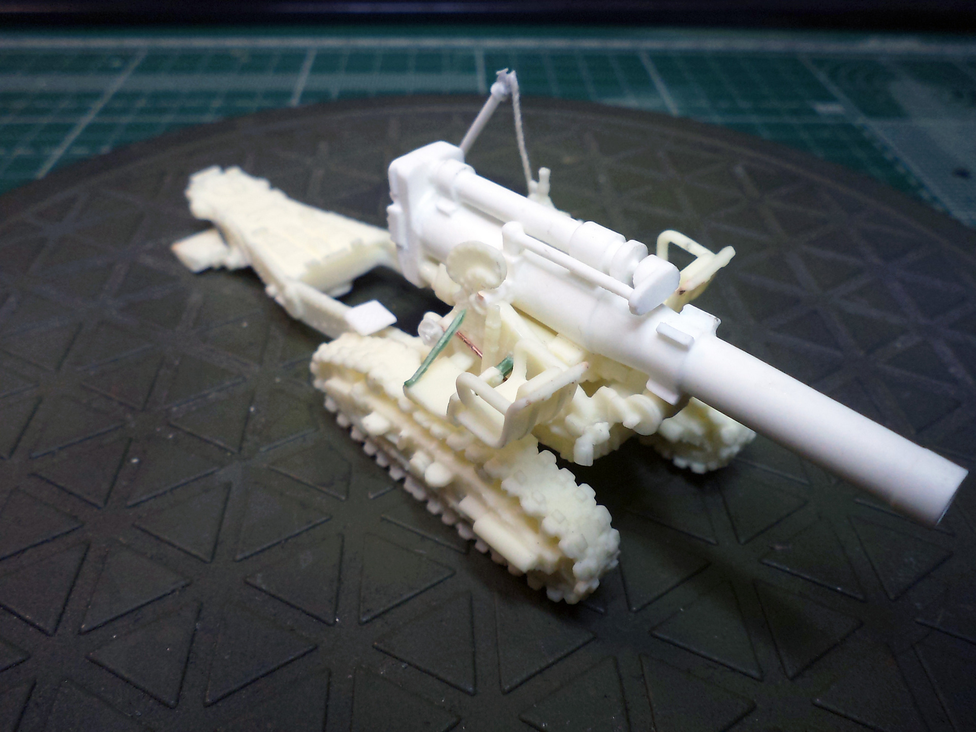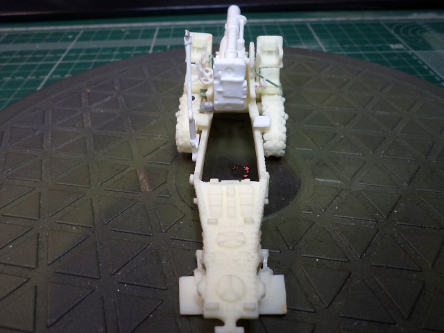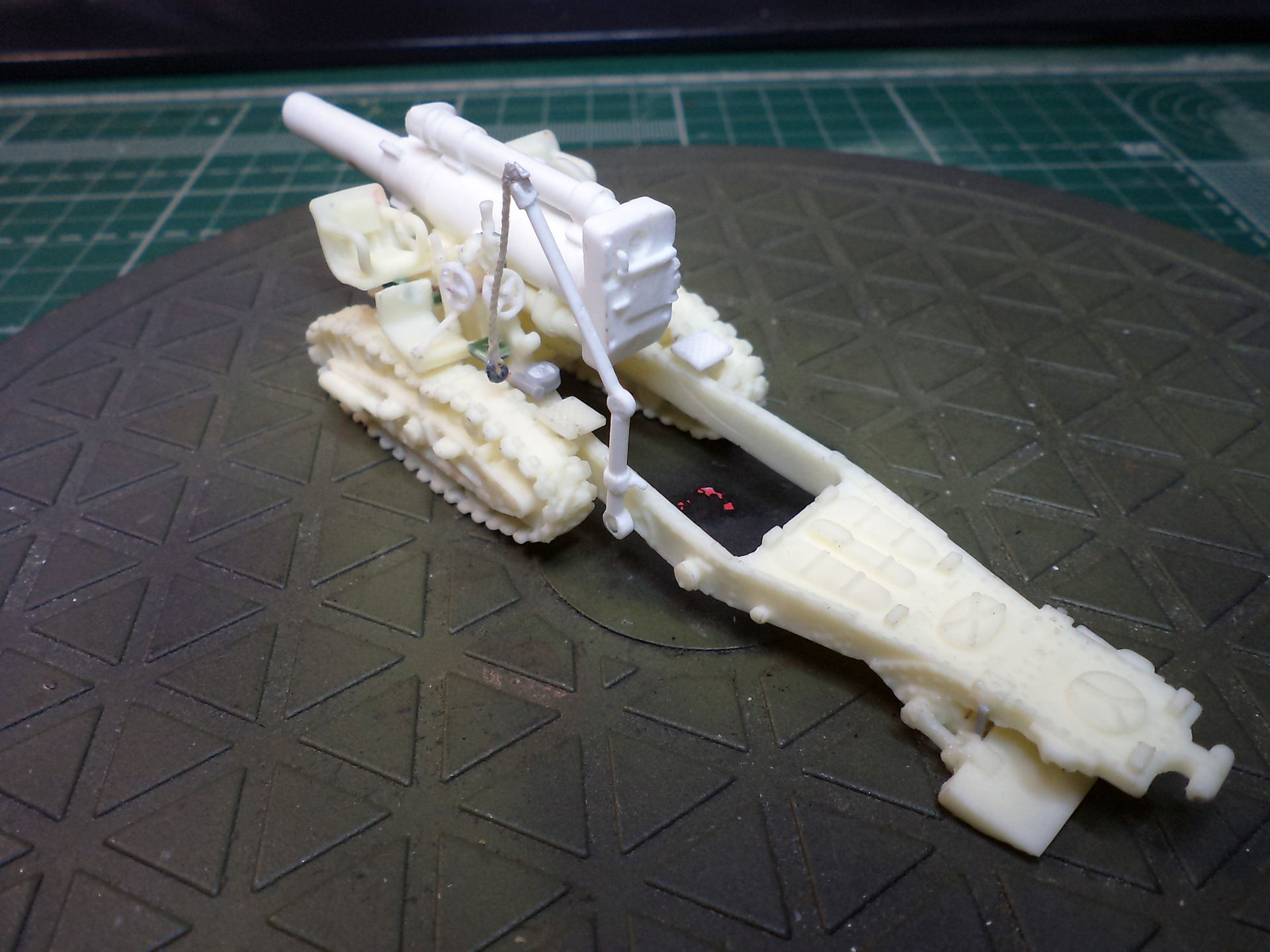 Смола колется - некоторые детали пришлось собирать из осколков. Кое-где пришлось вообще выпиливать детали с нуля - на модели их просто не было. Пару-тройк тяг, которые на модели были хреново пролиты вместе с лафетом, я сделал из проволоки. Трос и крюк на лебедке заряжания изготовлены отдельно. Выпиливать залитые смолой катки ходовой и центральный проем лафета - это было мучение. В качестве образца для всей мелочевки, вроде тяг, использовалась модель гаубицы Б-4 в масштабе 1/35 - пришлось купить и собрать эту здоровую дуру.