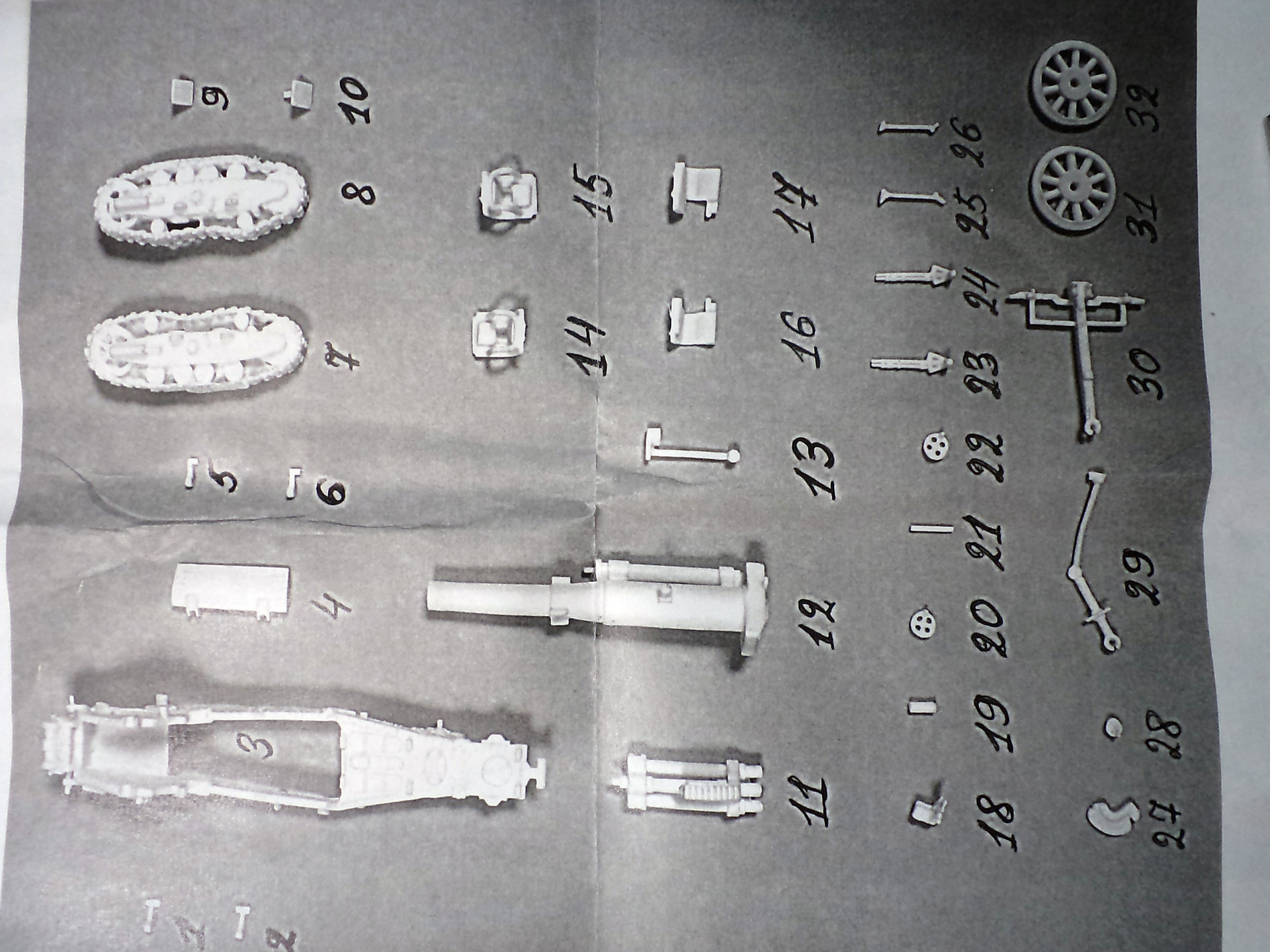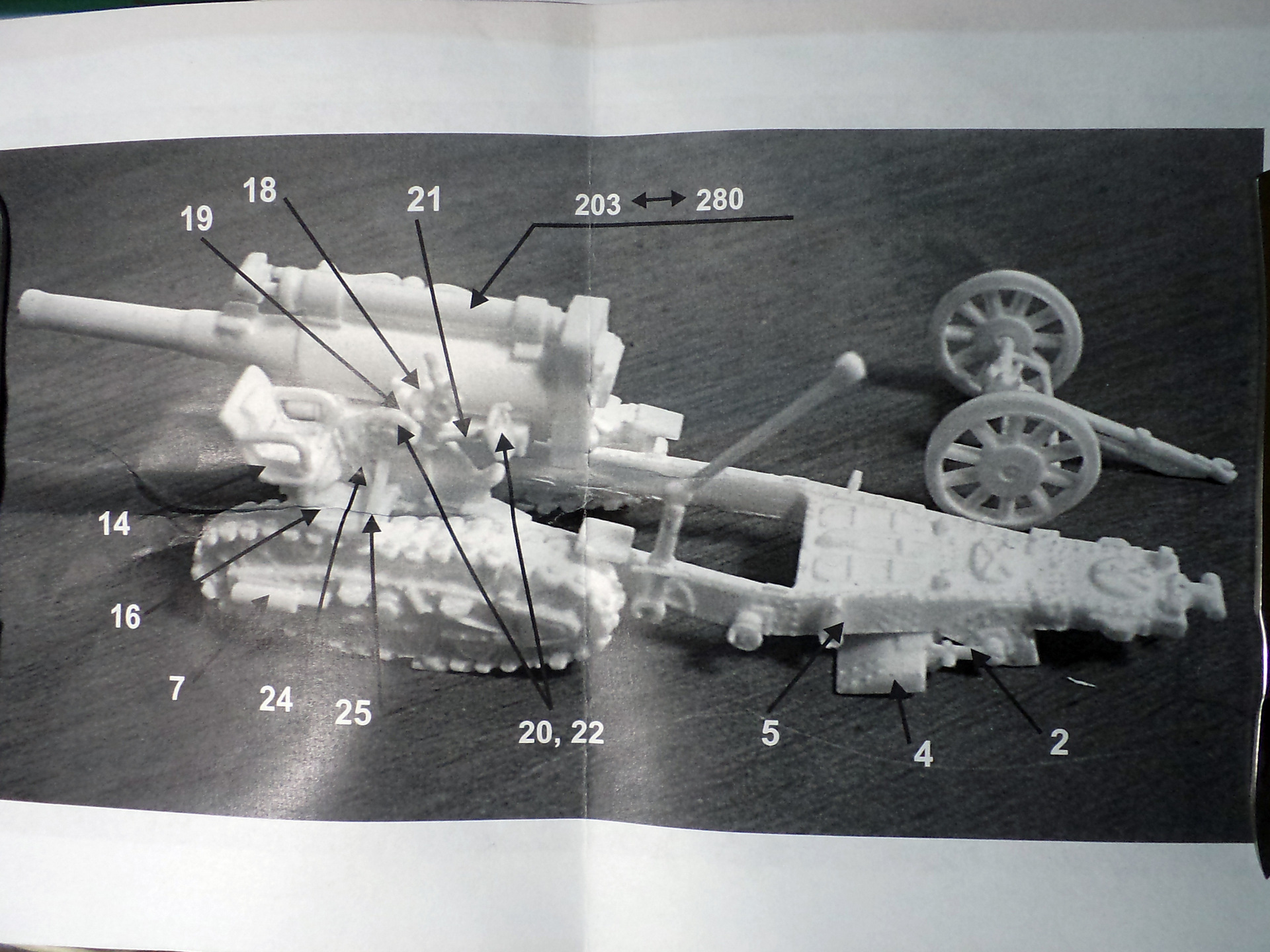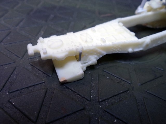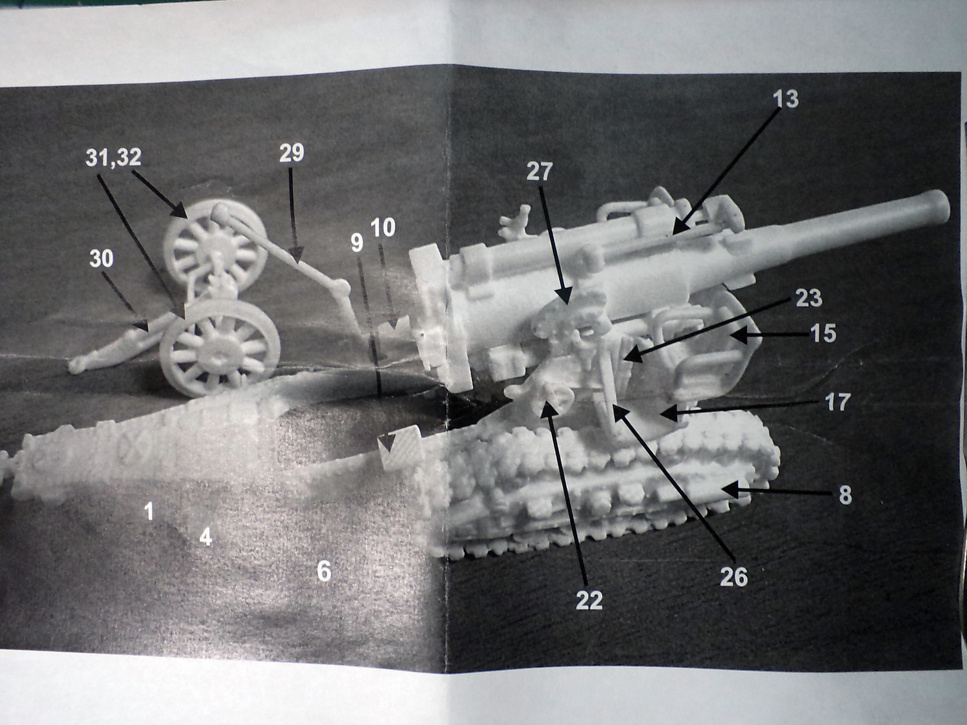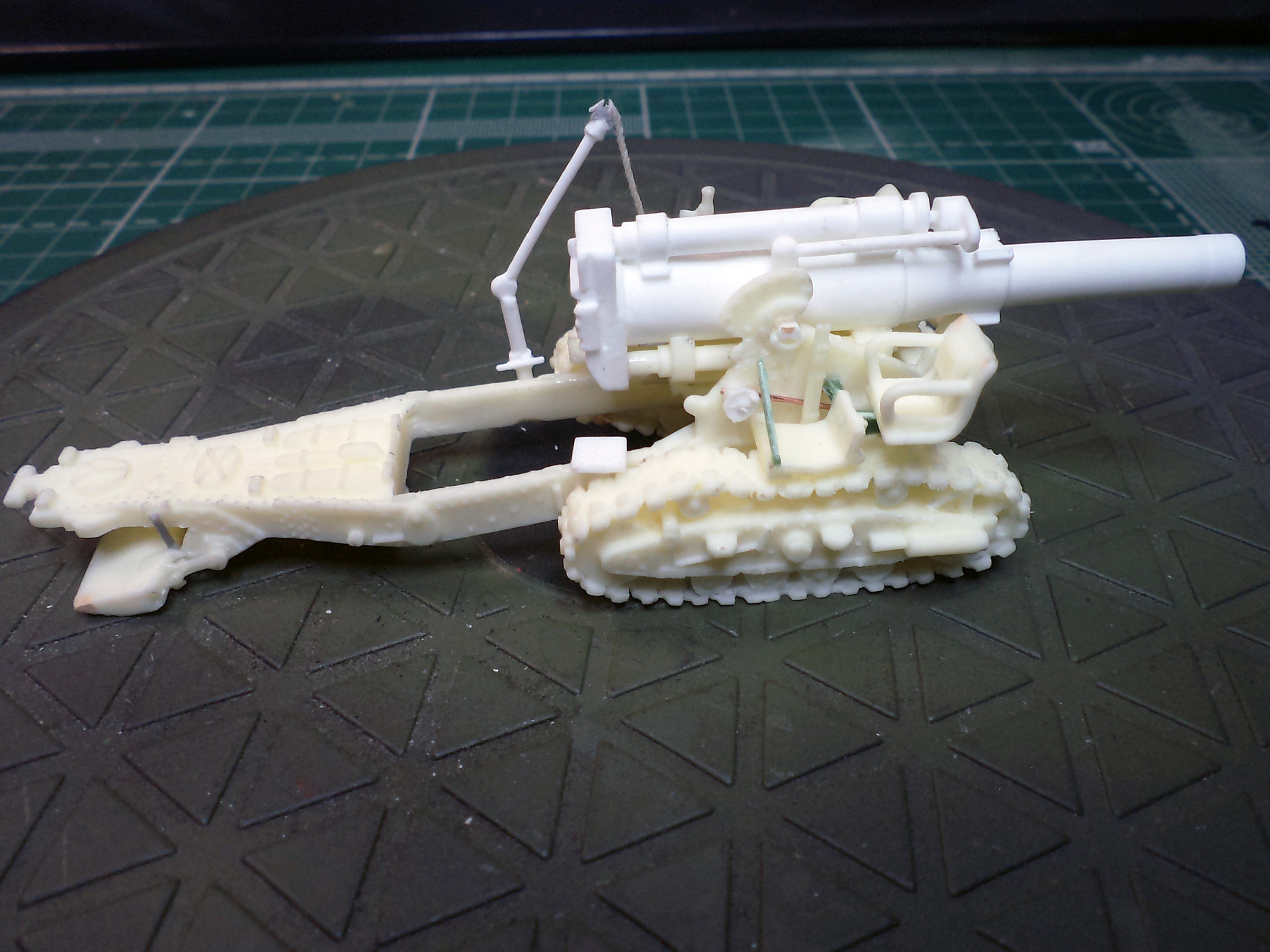 Смола колется - некоторые детали пришлось собирать из осколков. Кое-где пришлось вообще выпиливать детали с нуля - на модели их просто не было. Пару-тройк тяг, которые на модели были хреново пролиты вместе с лафетом, я сделал из проволоки. Трос и крюк на лебедке заряжания изготовлены отдельно. Выпиливать залитые смолой катки ходовой и центральный проем лафета - это было мучение. В качестве образца для всей мелочевки, вроде тяг, использовалась модель гаубицы Б-4 в масштабе 1/35 - пришлось купить и собрать эту здоровую дуру.