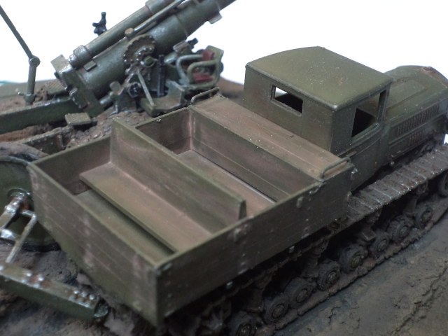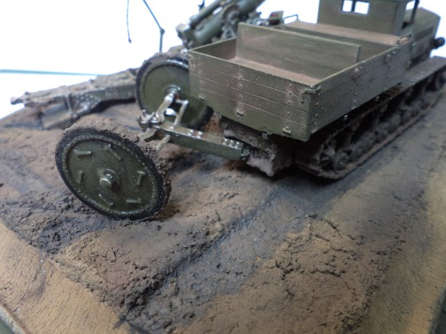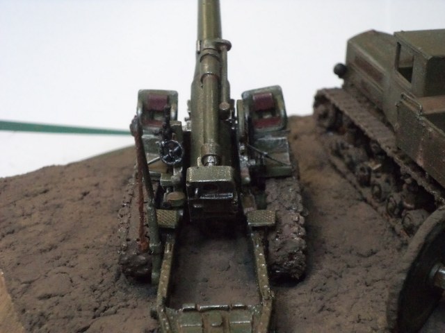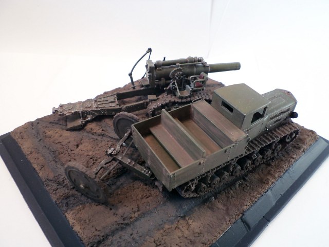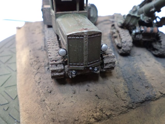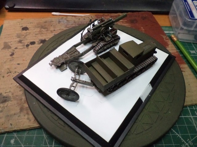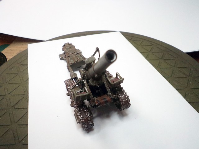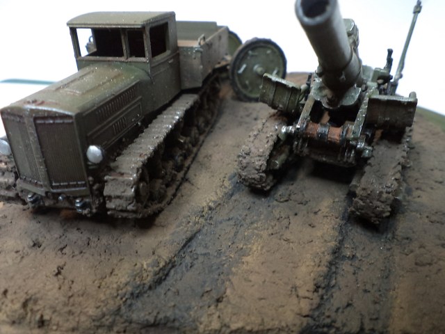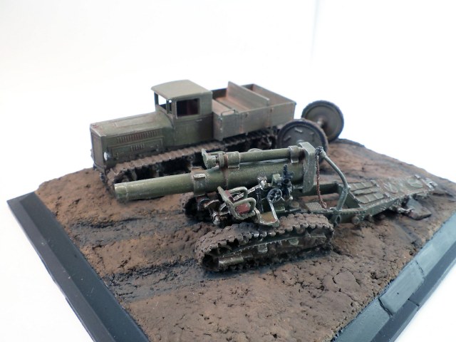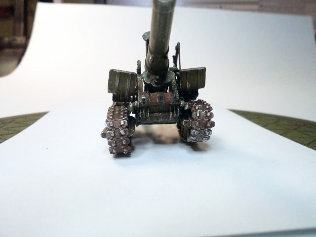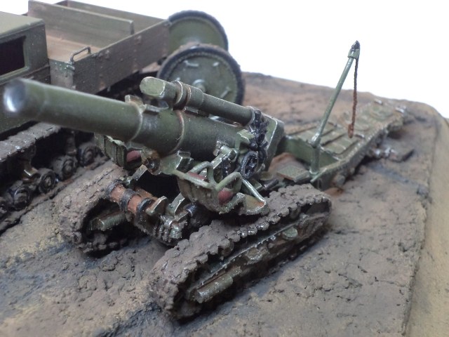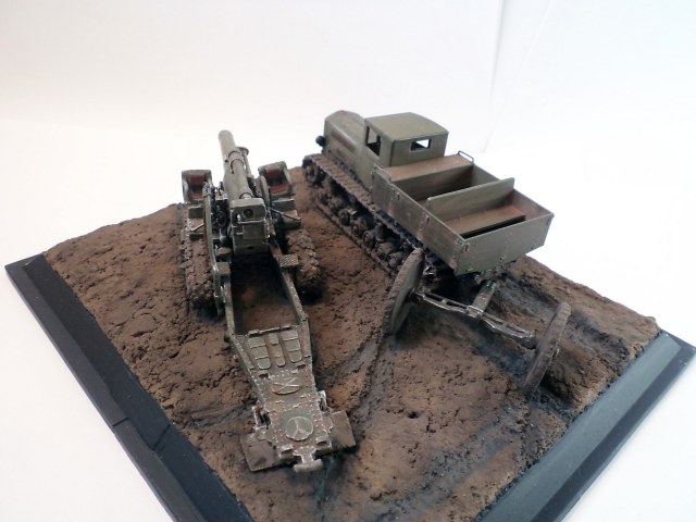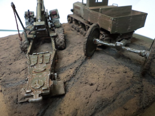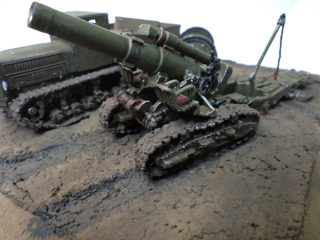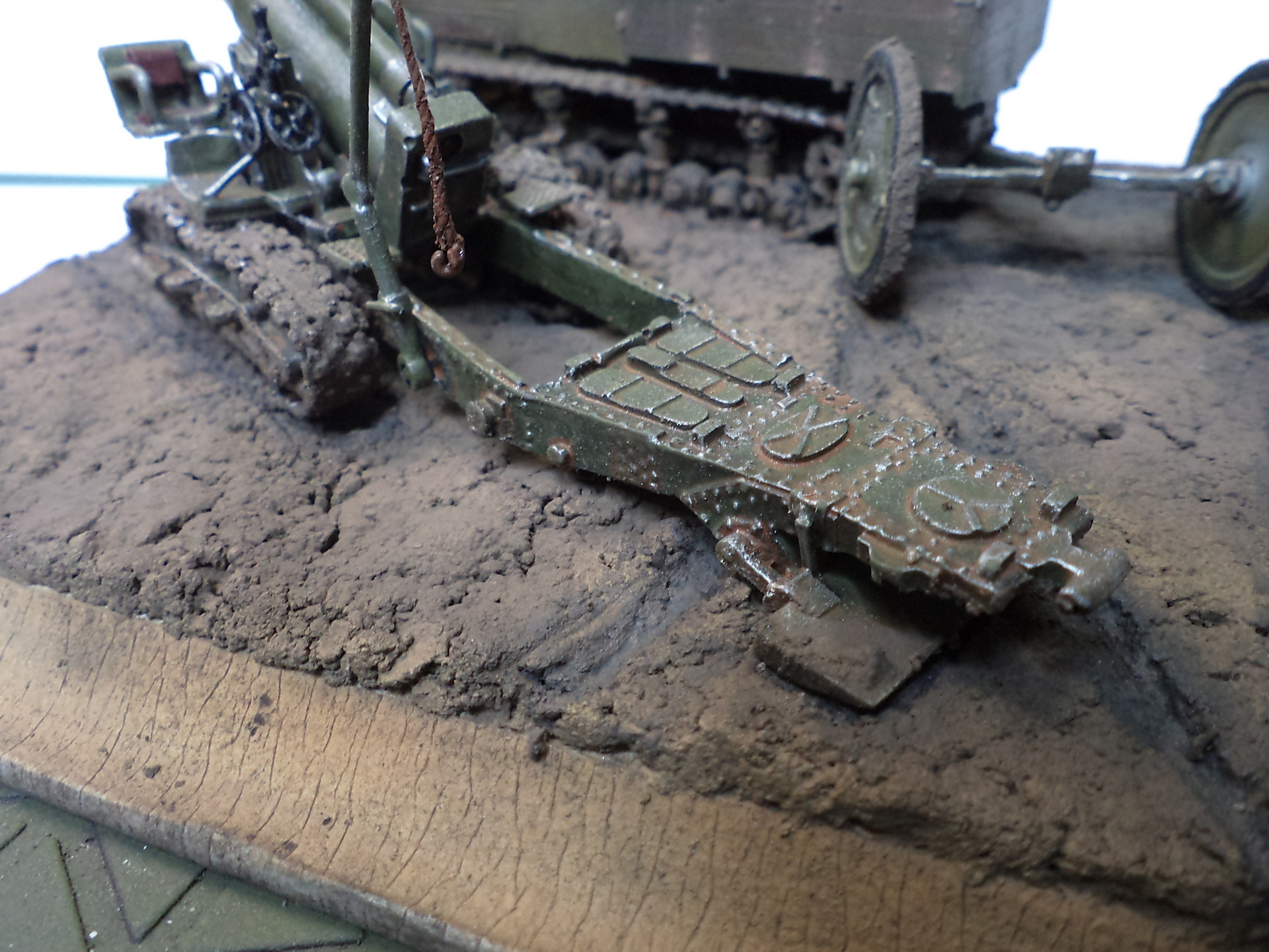 Когда делал подставку, провонял скипидаром весь офис - сотрудник пришел на работу и очень ругался. Сегодня раза три-четыре тонировал и докрашивал подставку, добавил жирности грязи в следах, вымазал в грязи ходовую мортиры и тягача.