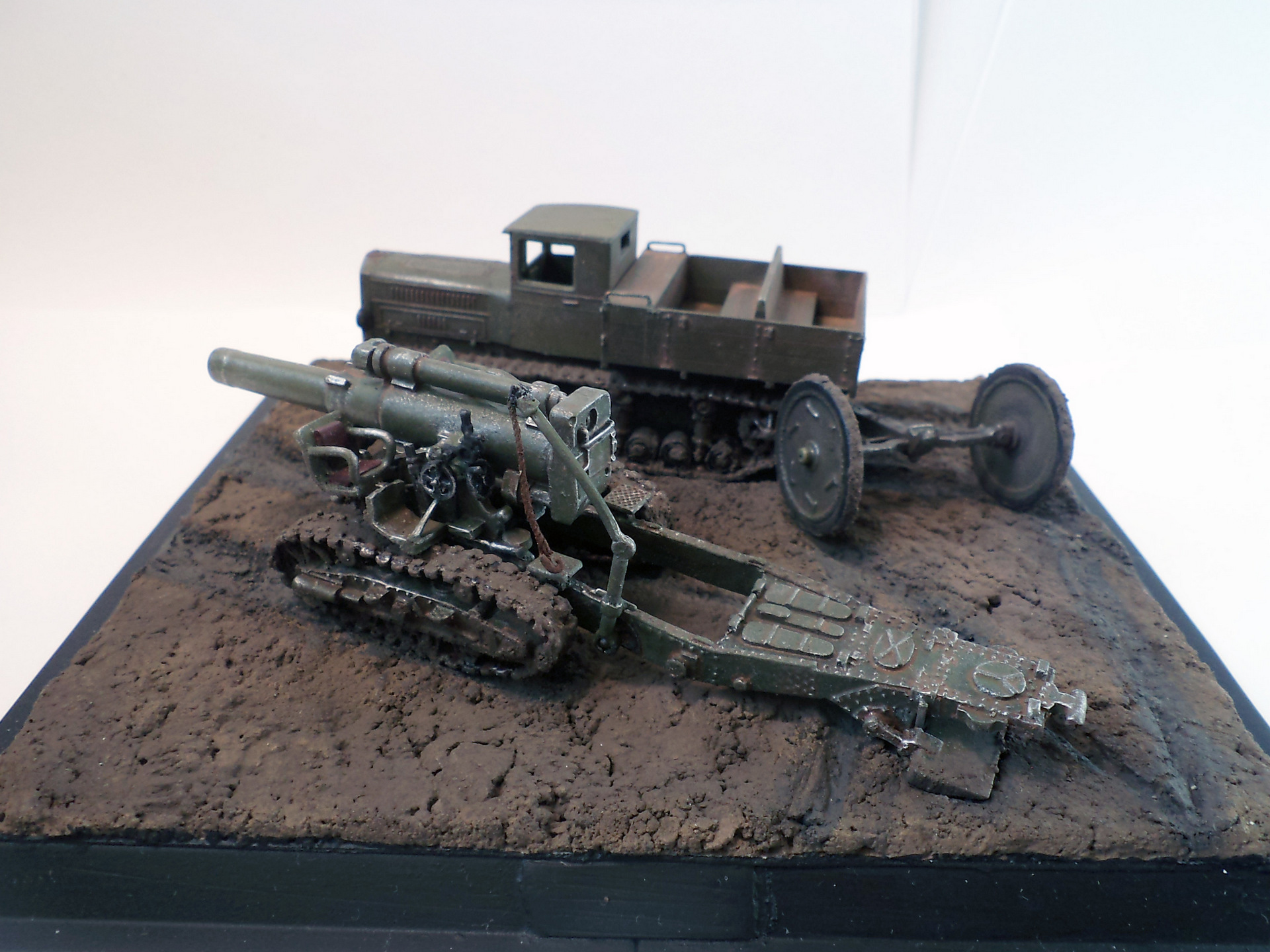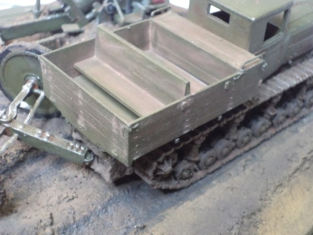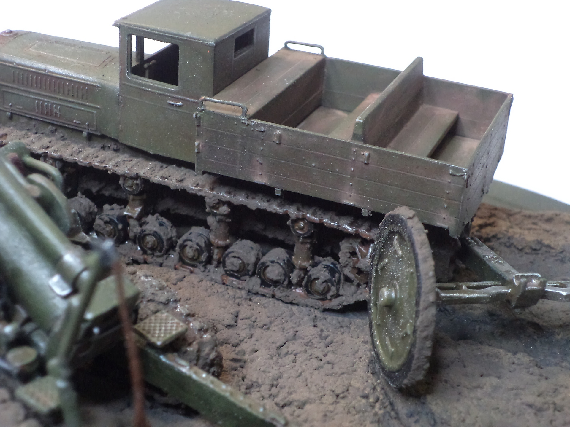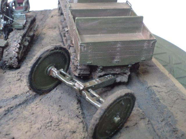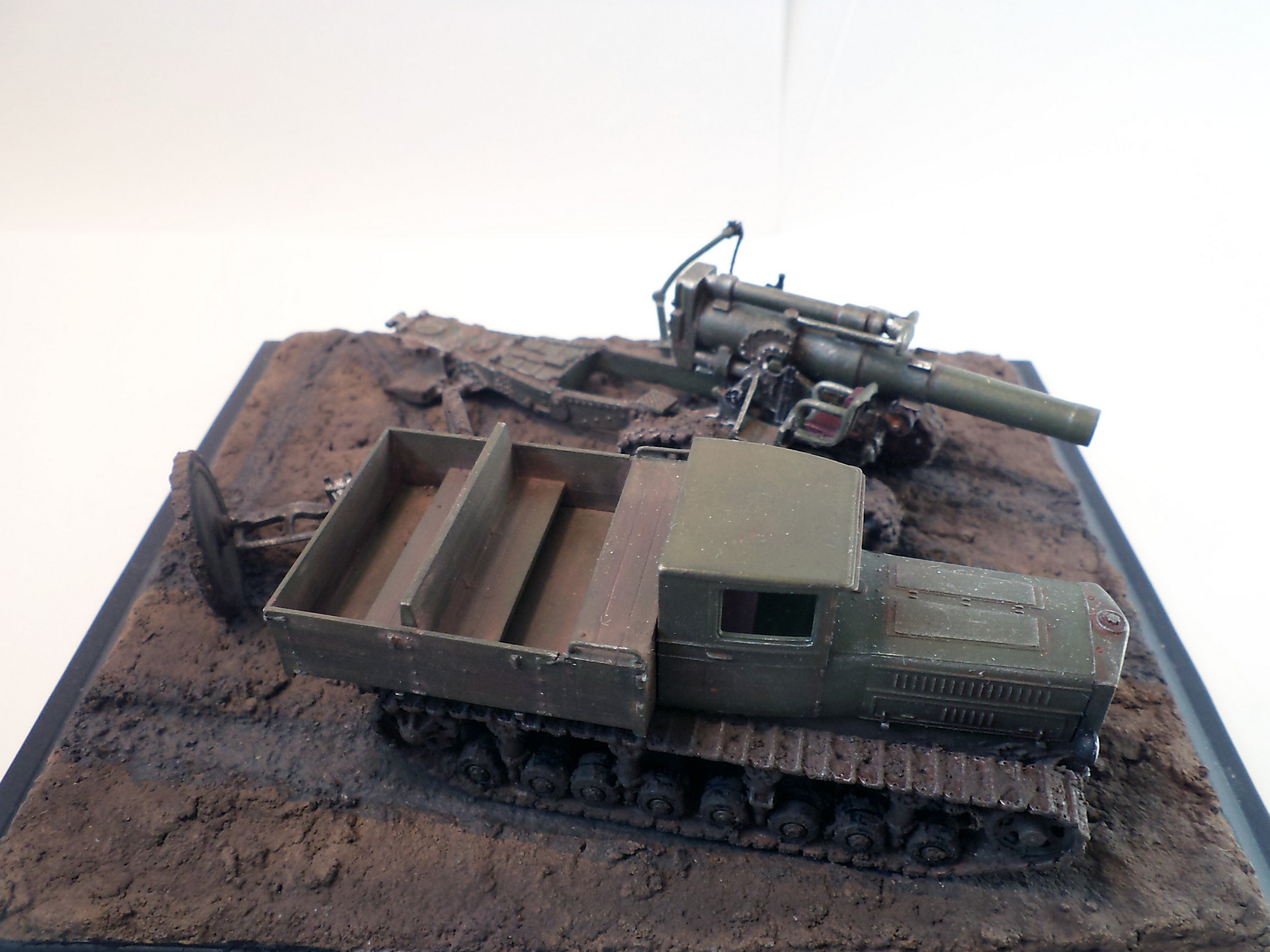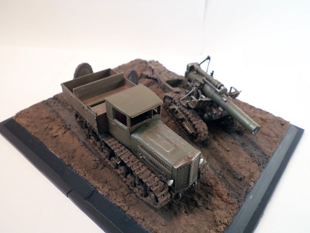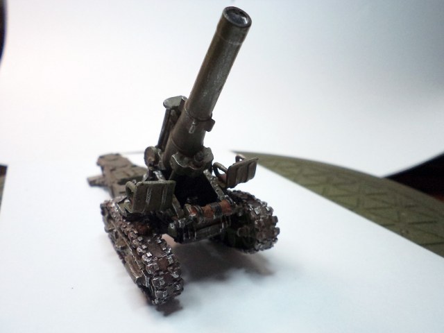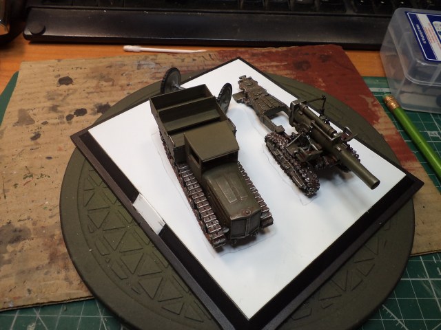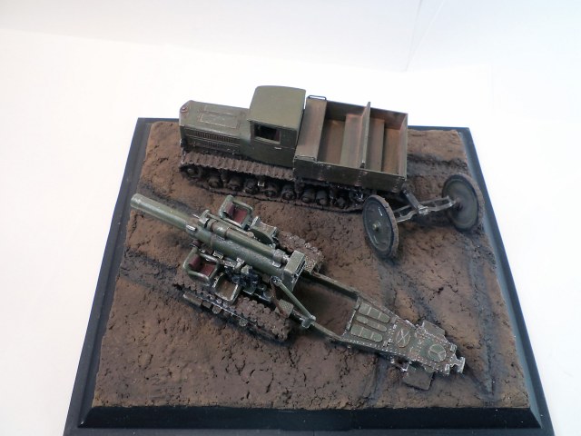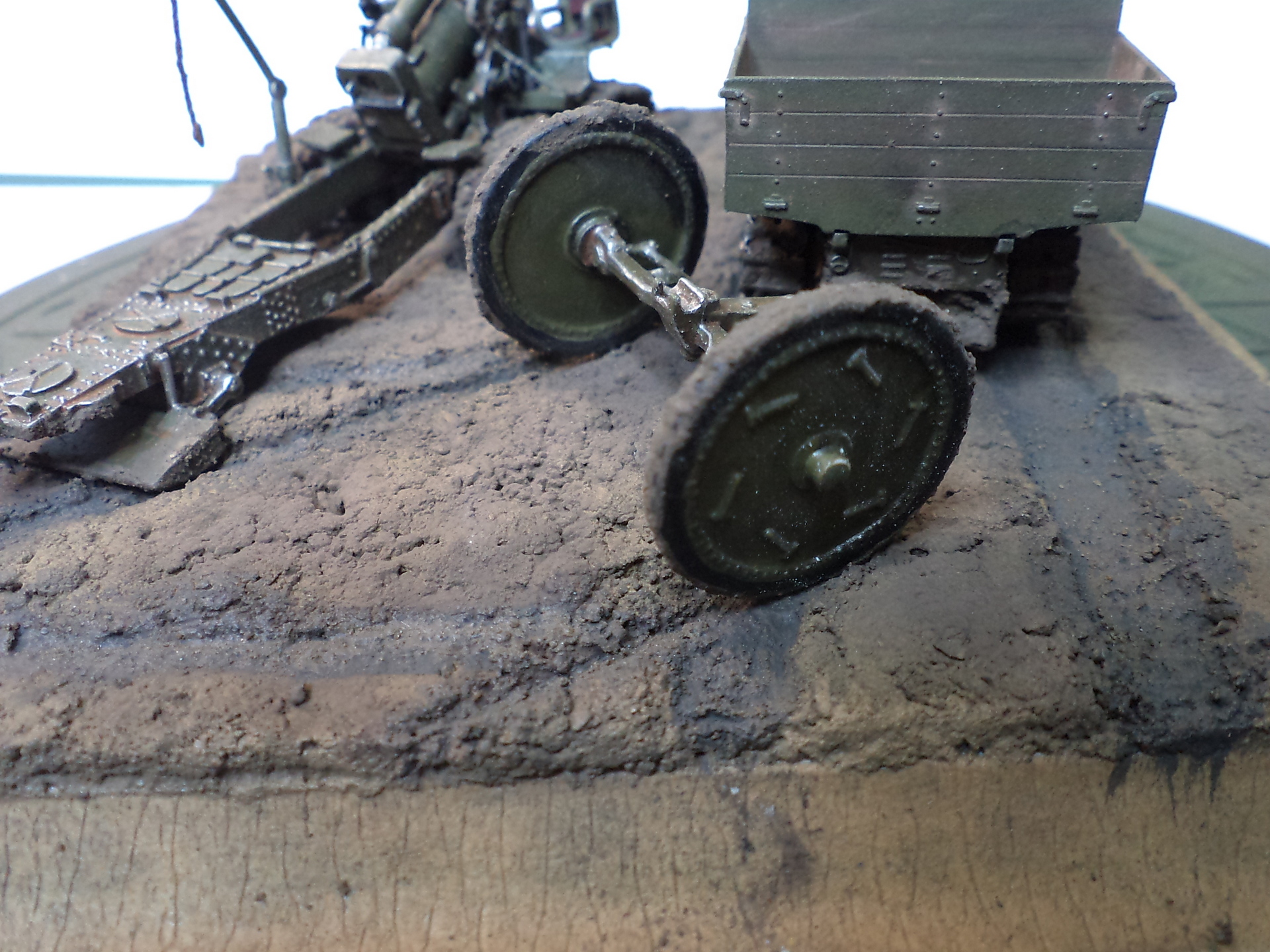 Когда делал подставку, провонял скипидаром весь офис - сотрудник пришел на работу и очень ругался. Сегодня раза три-четыре тонировал и докрашивал подставку, добавил жирности грязи в следах, вымазал в грязи ходовую мортиры и тягача.