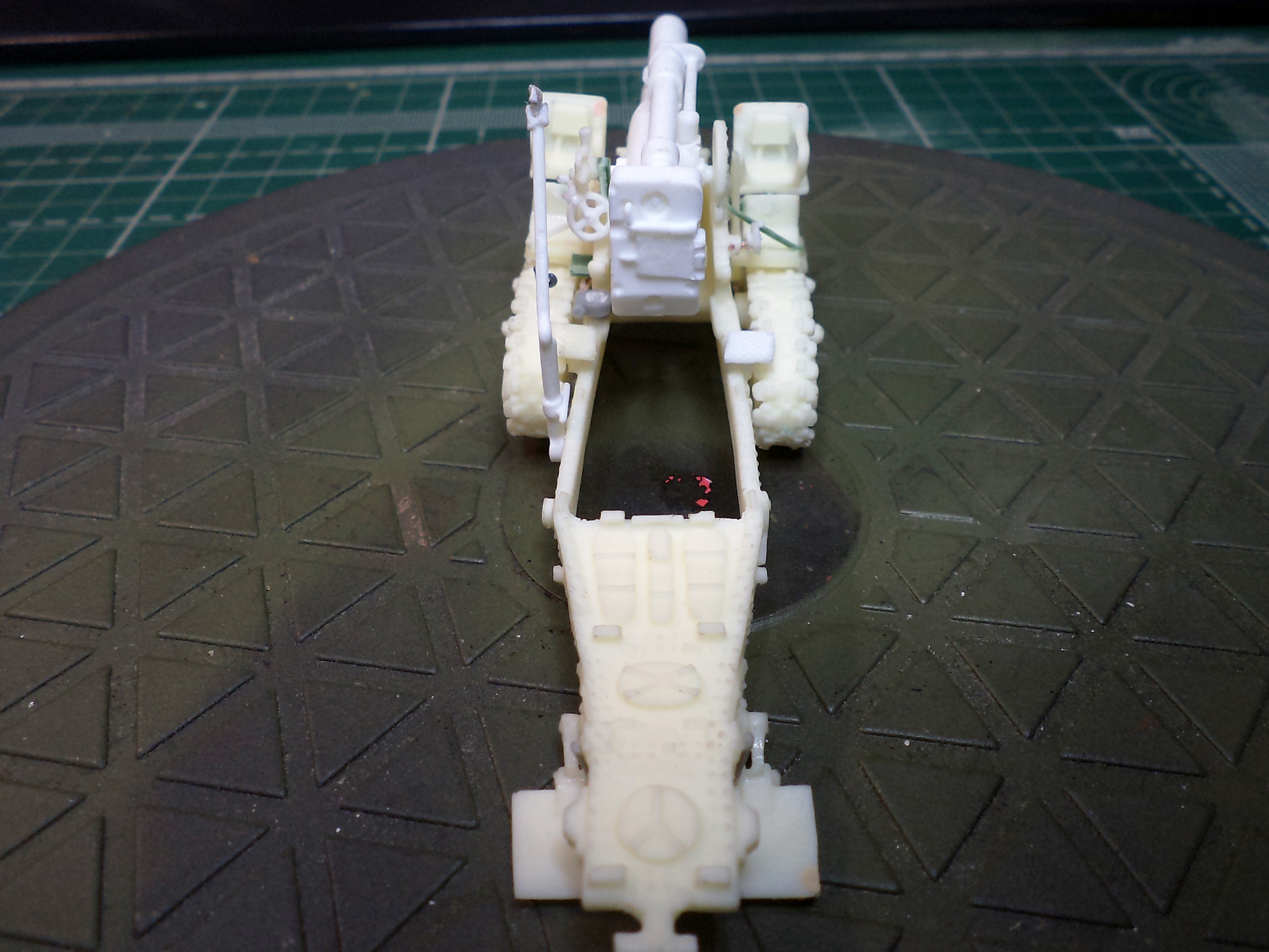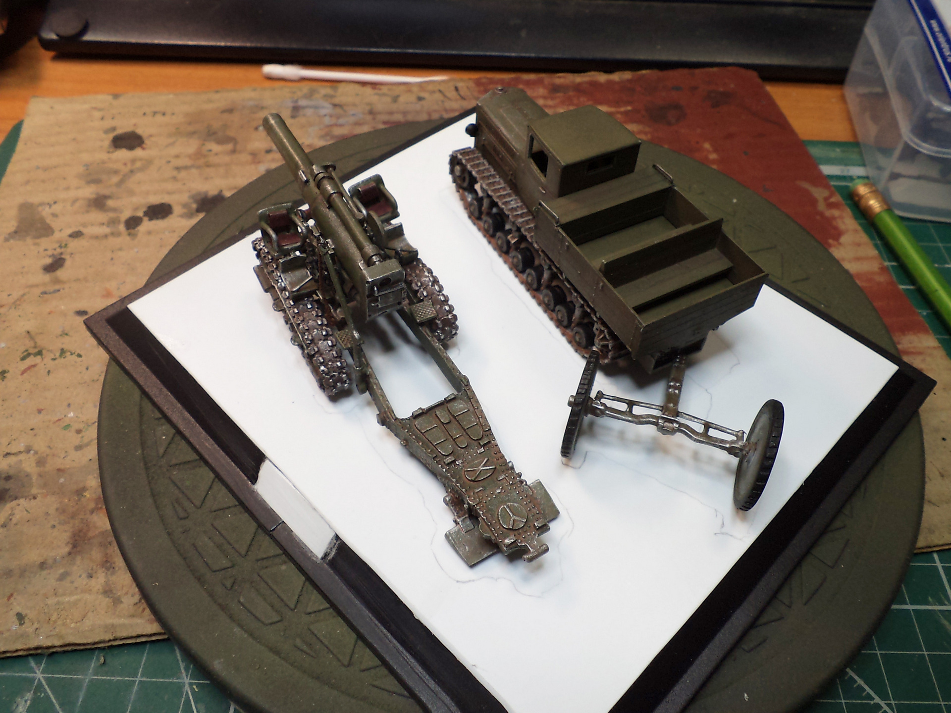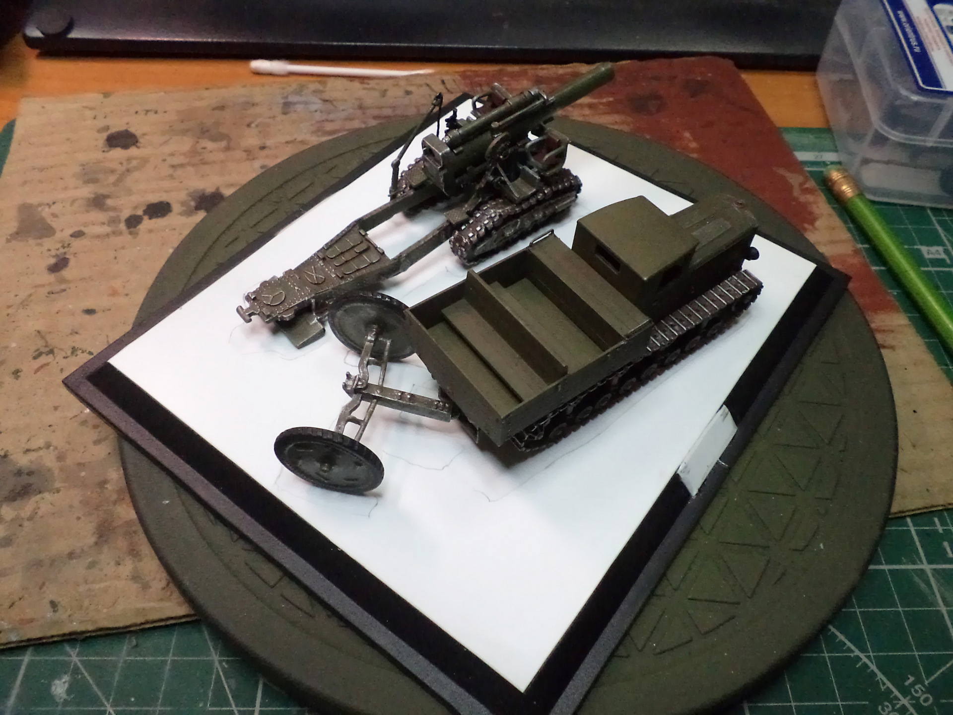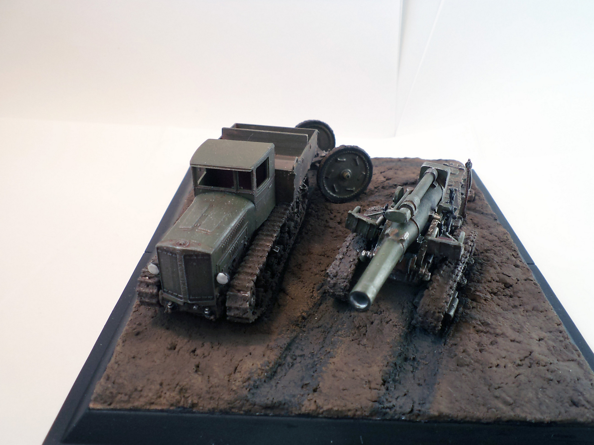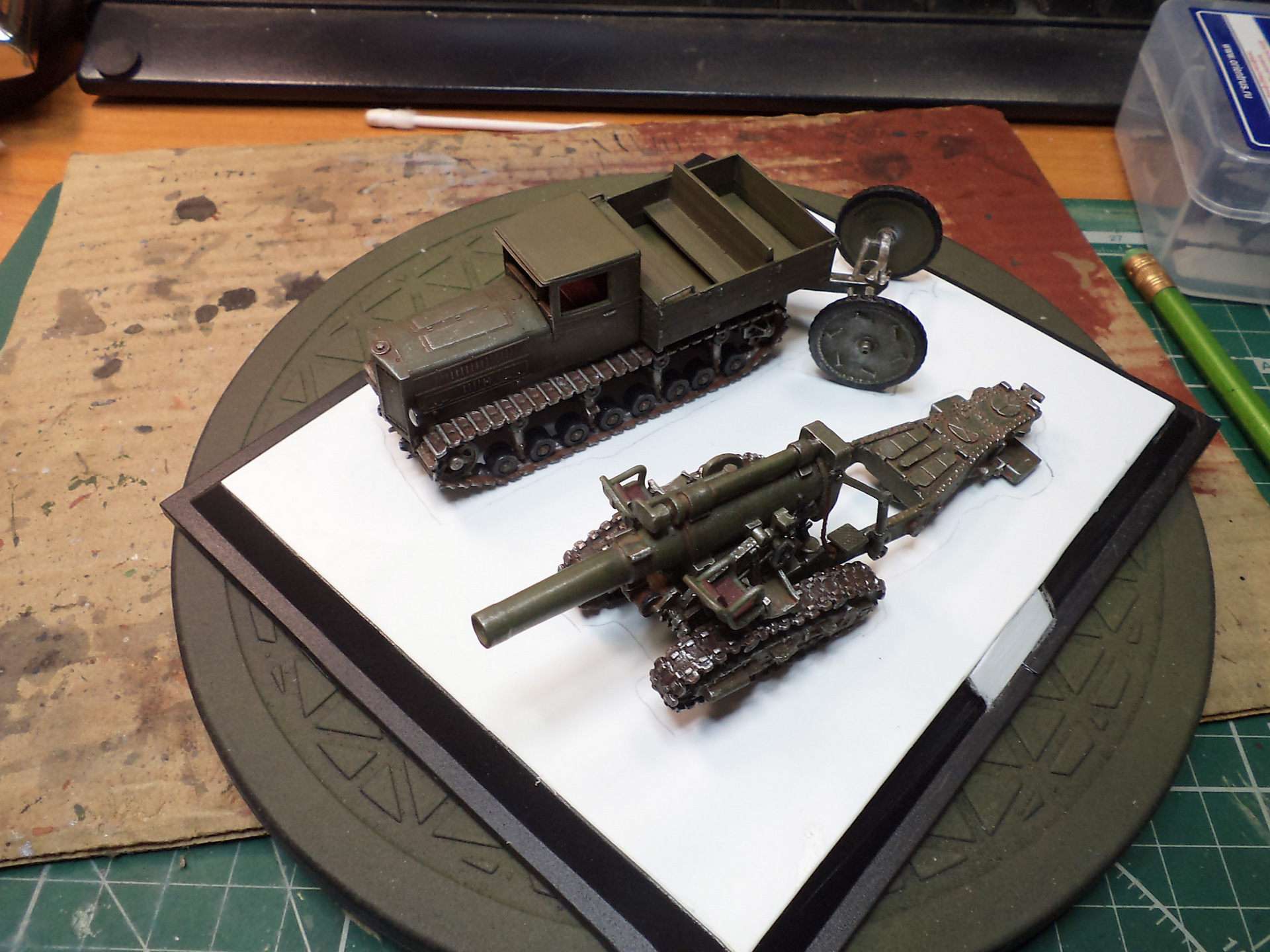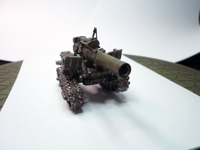 Когда делал подставку, провонял скипидаром весь офис - сотрудник пришел на работу и очень ругался. Сегодня раза три-четыре тонировал и докрашивал подставку, добавил жирности грязи в следах, вымазал в грязи ходовую мортиры и тягача.